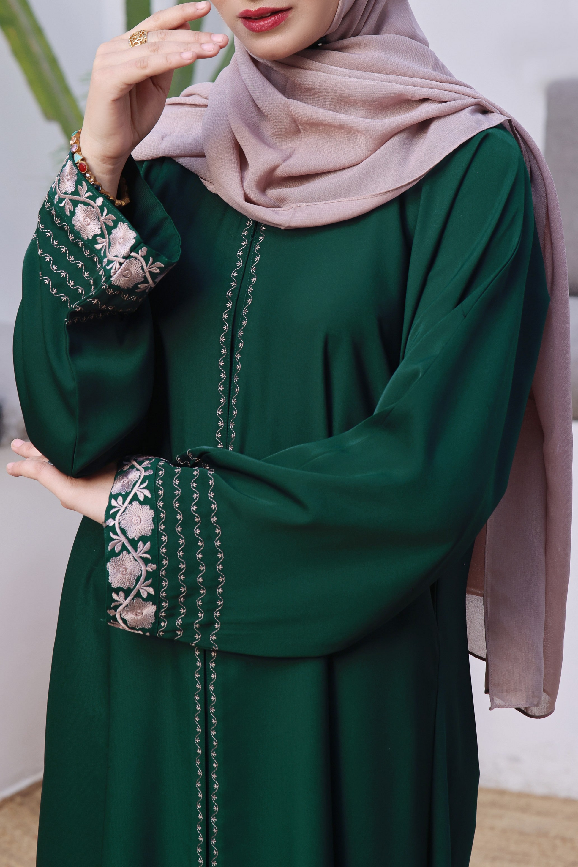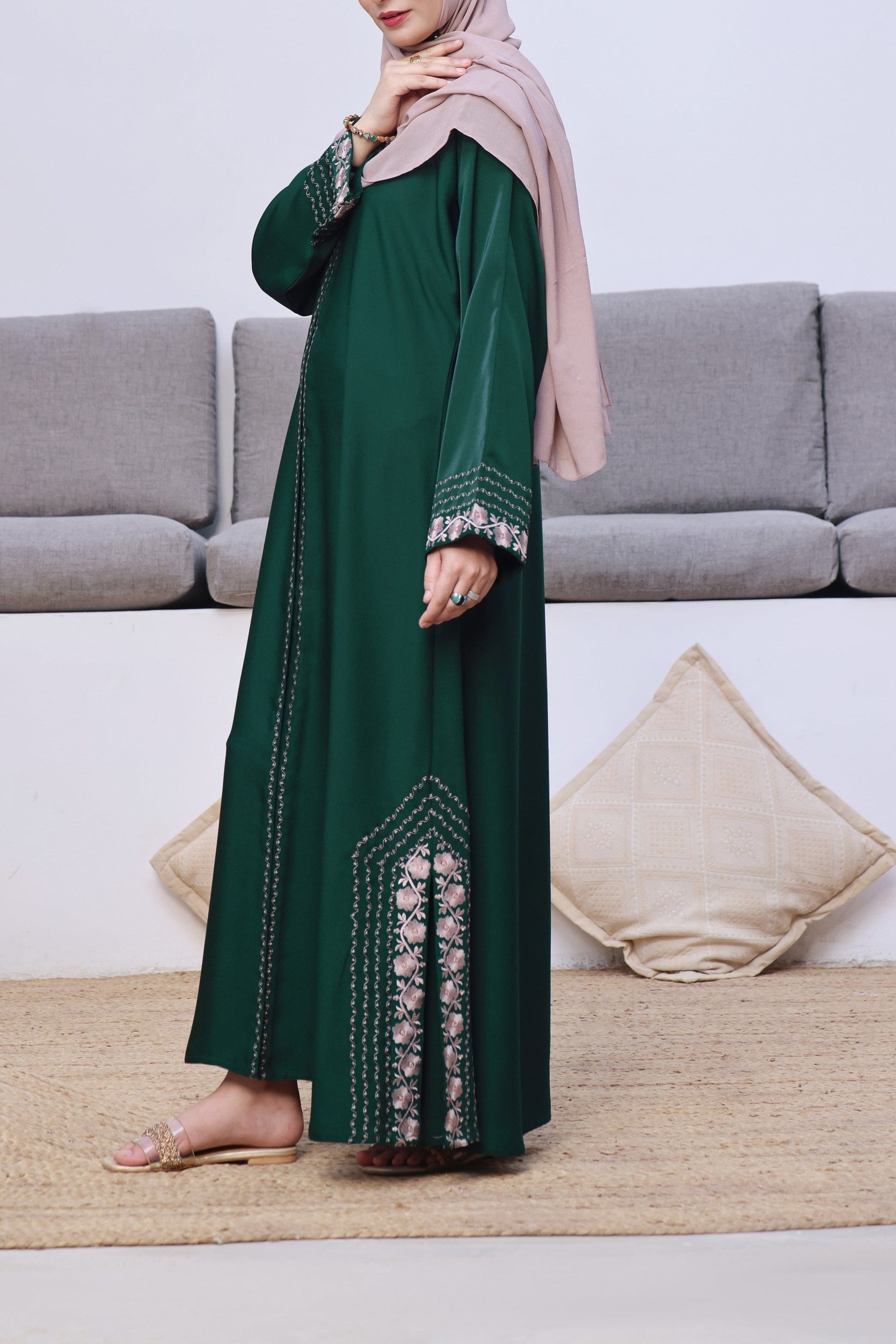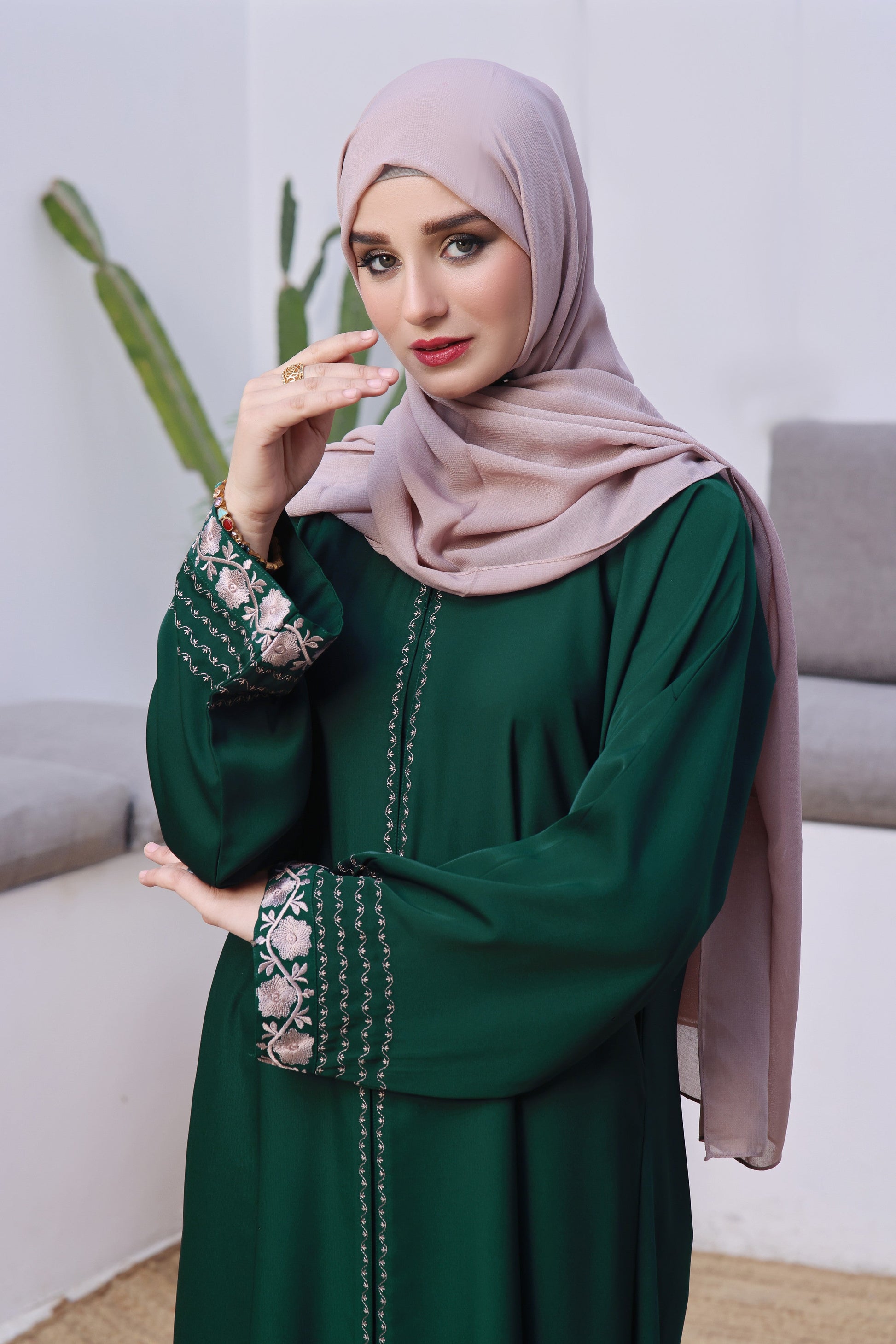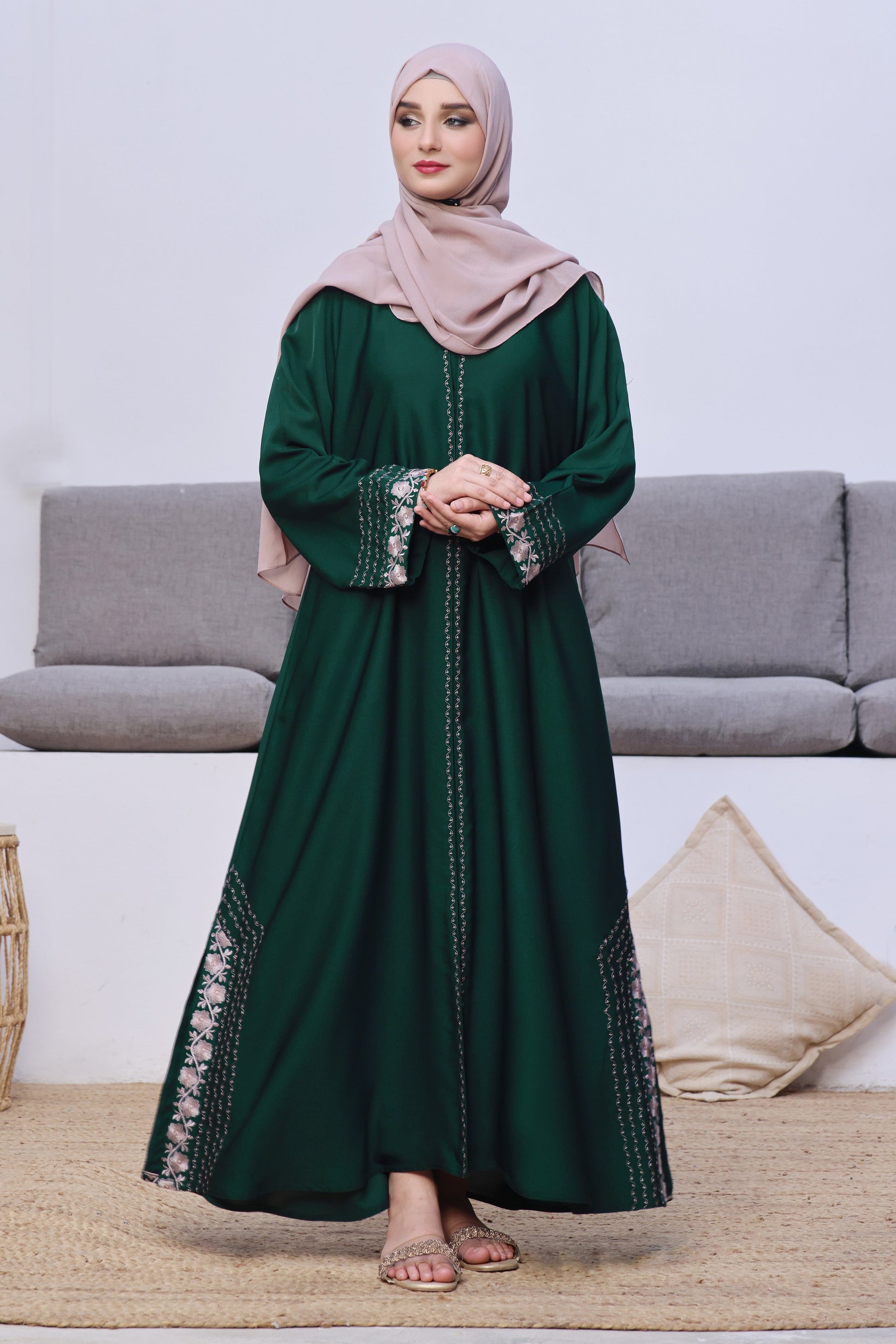 Our beautiful front open style is constructed on imported fabric which is soft and durable, fabric manipulation is done on bodice with flower embroidery on front and sleeves making it flouncy and elegant, comes along with Contrast chiffon Sheila