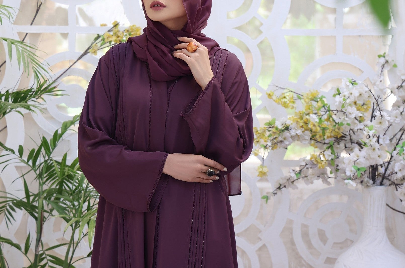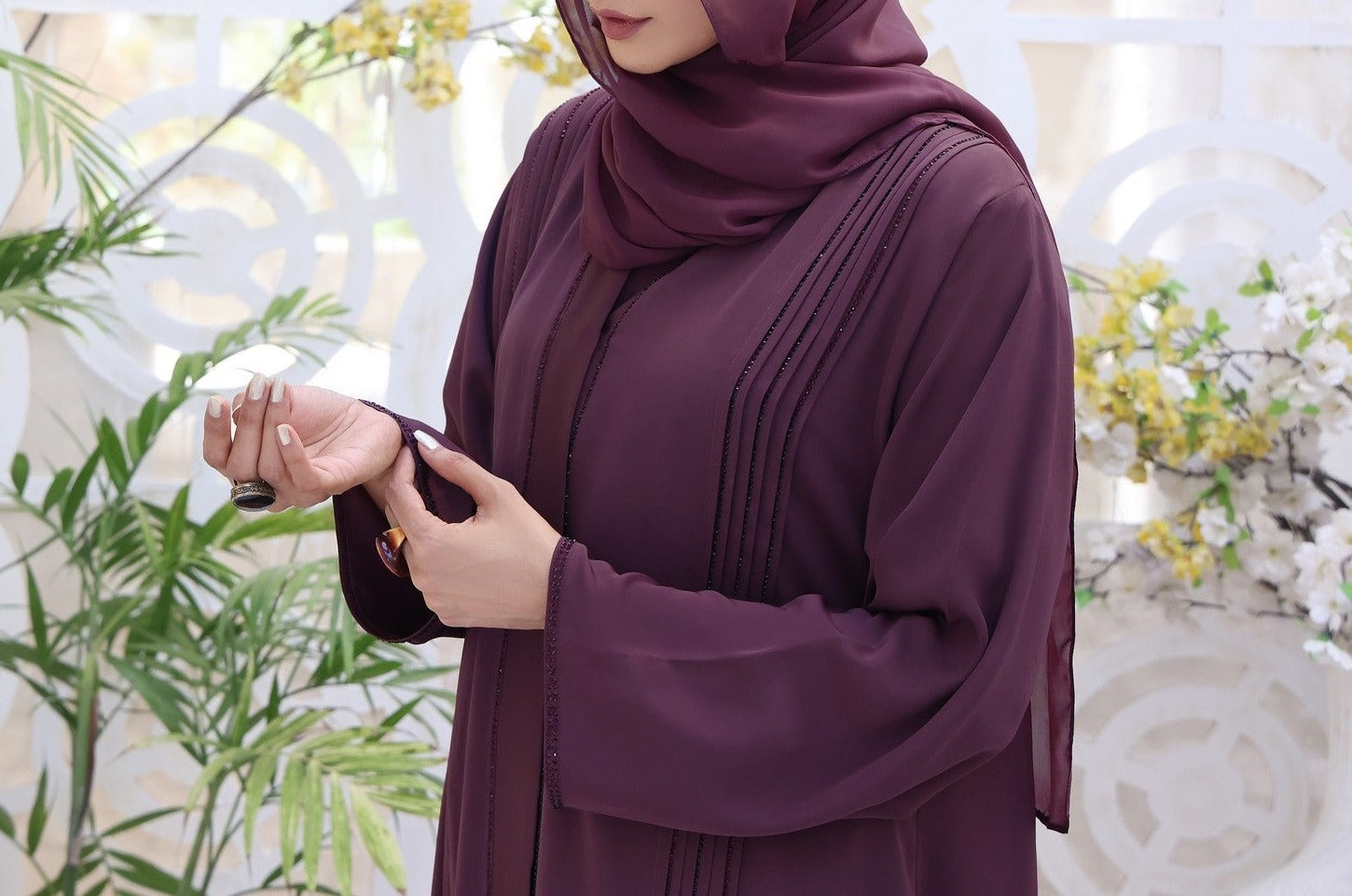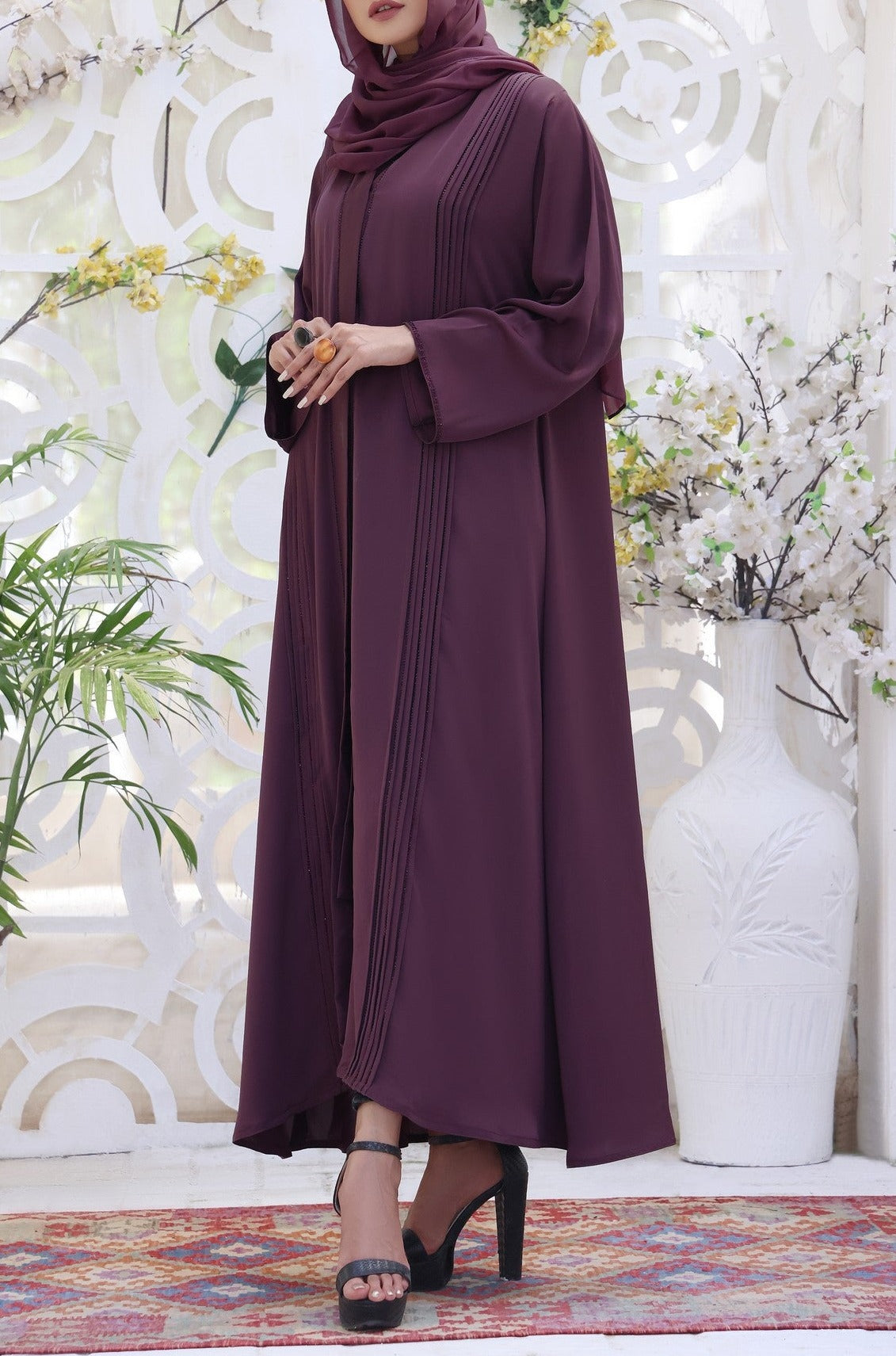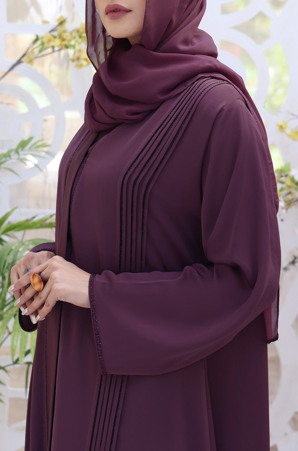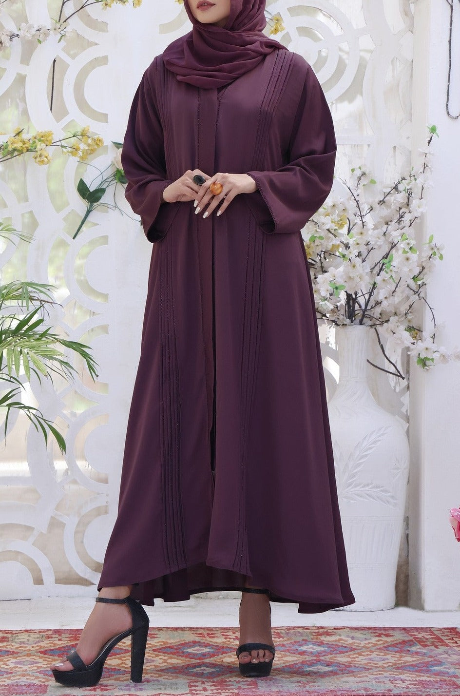 Our beautiful front open style abaya is a popular one these days stone work all over front makes it super gorgeous whenever you wear comes along with pure Korean chiffon matching Sheila