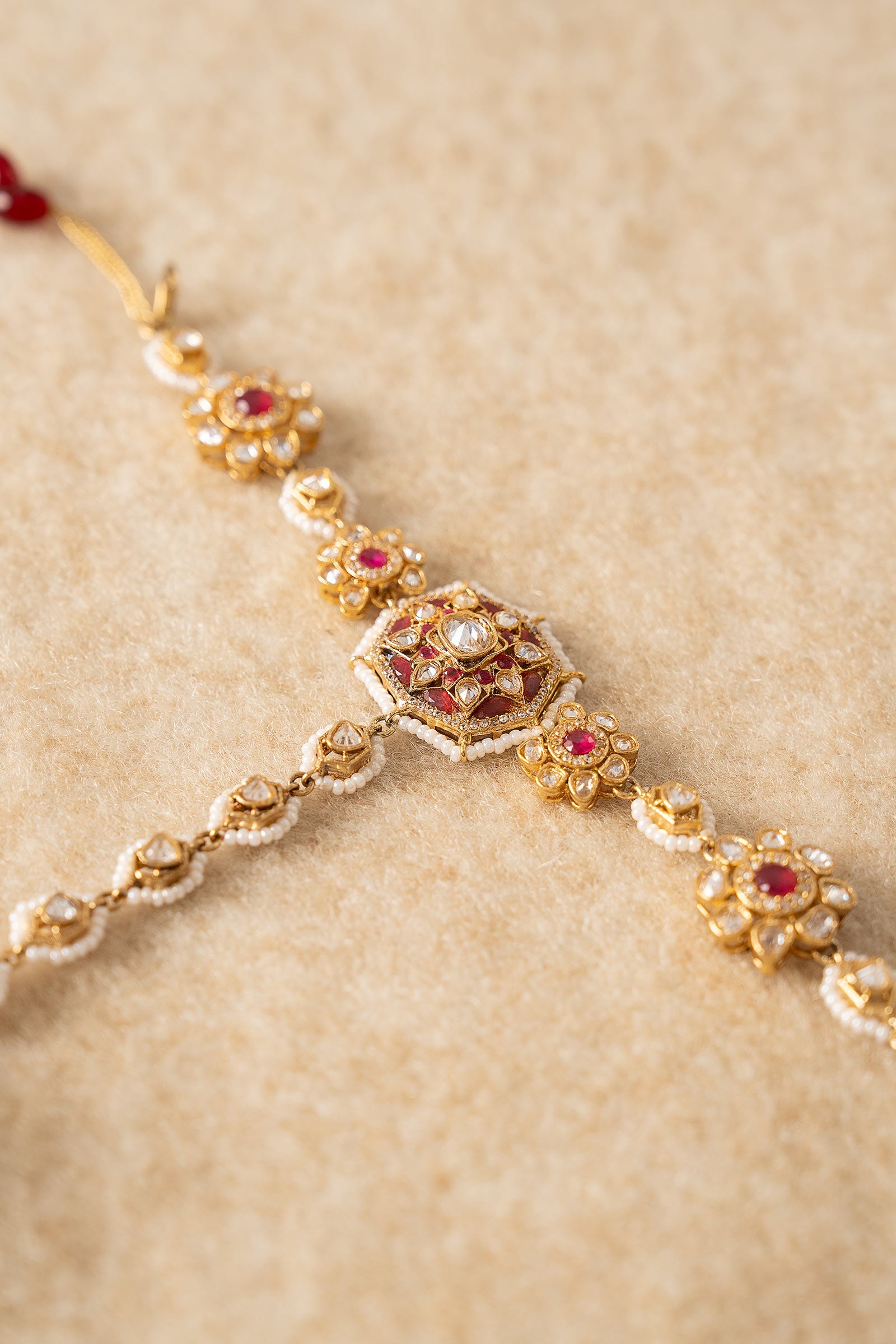 This classic angla with adjustable ring embodies the essence of celebration with the richness of white handcut glass and pink chatham stones encaged with white zircons that beautifies your wrist and finger. Opt for opulence and emulate sheer class.