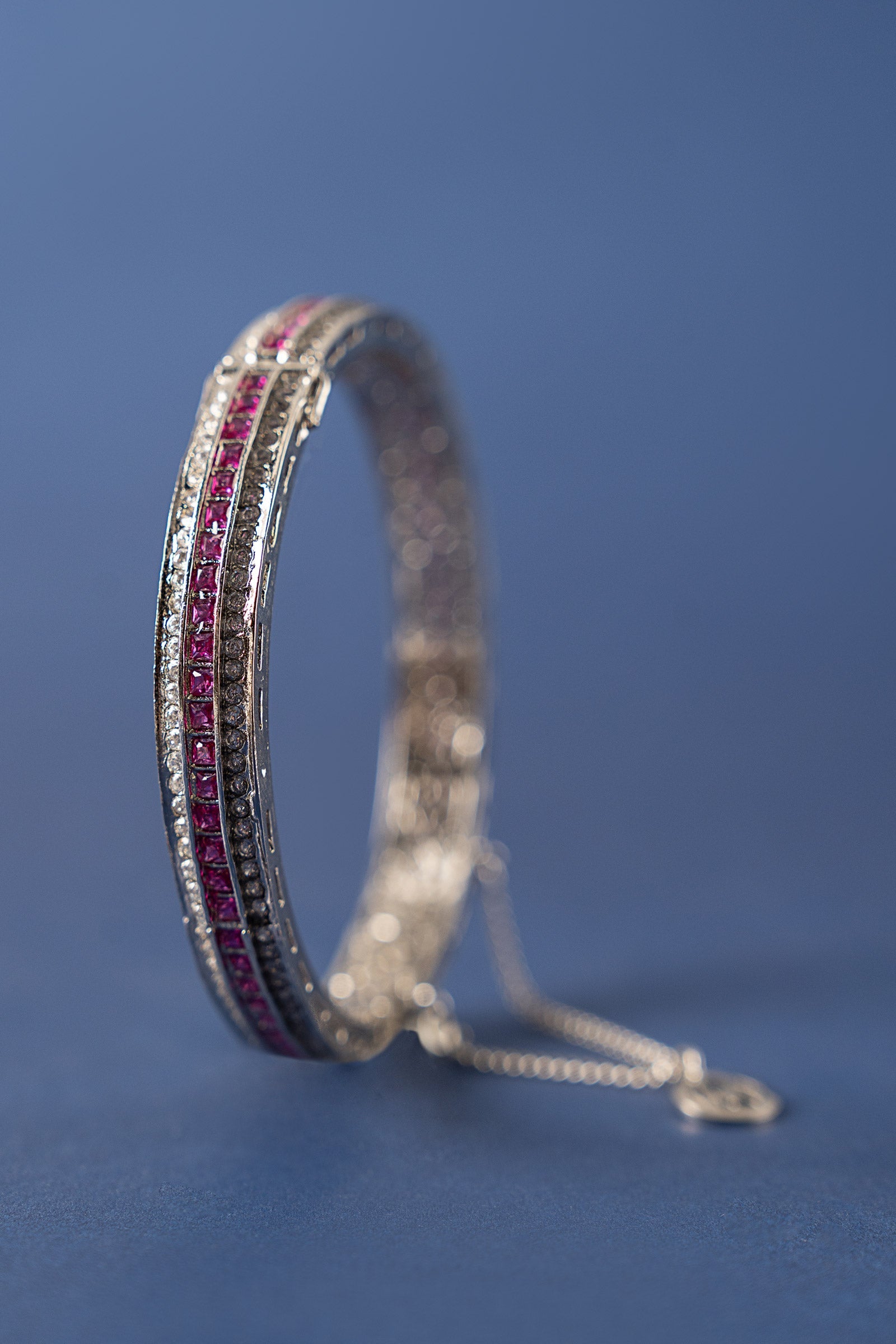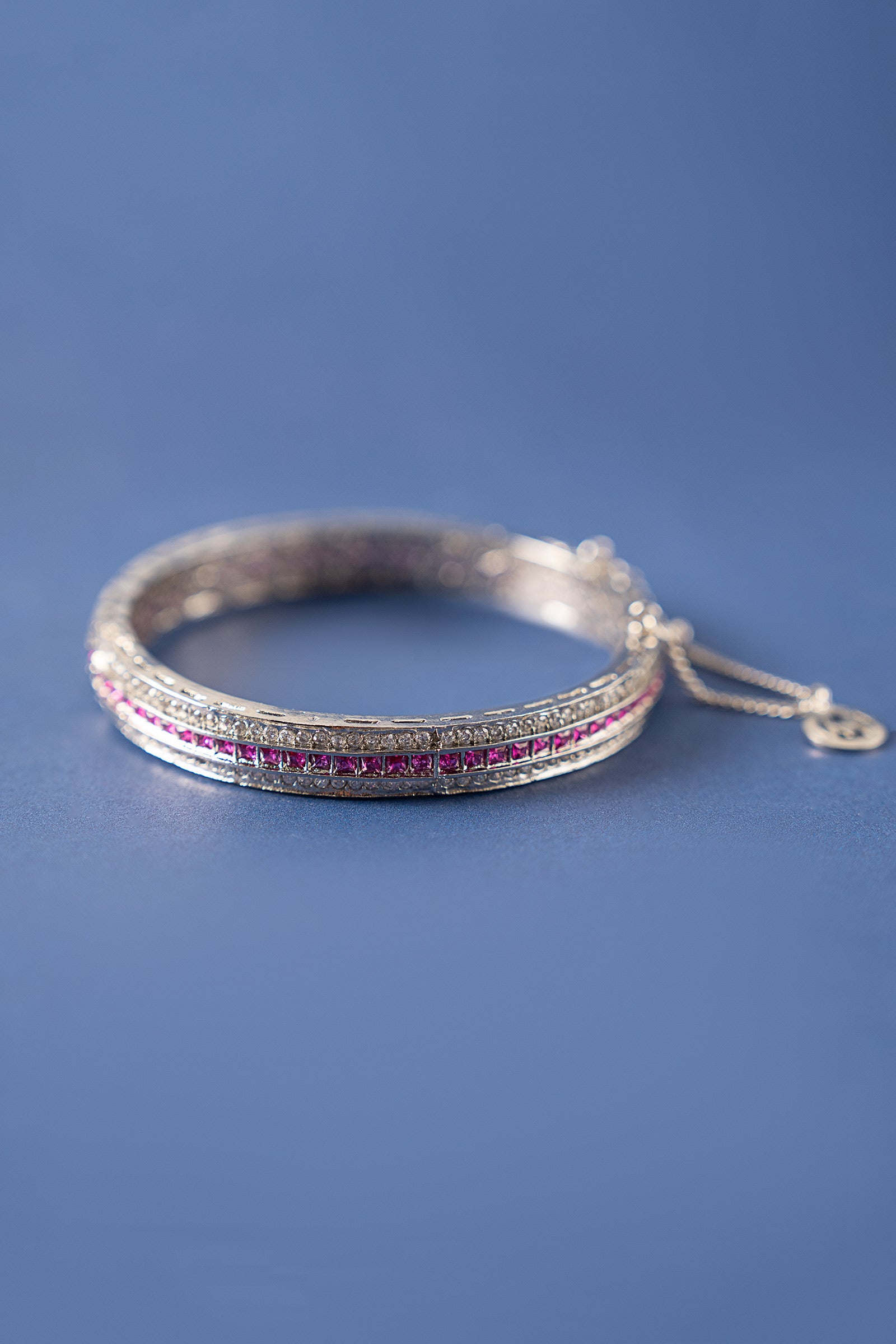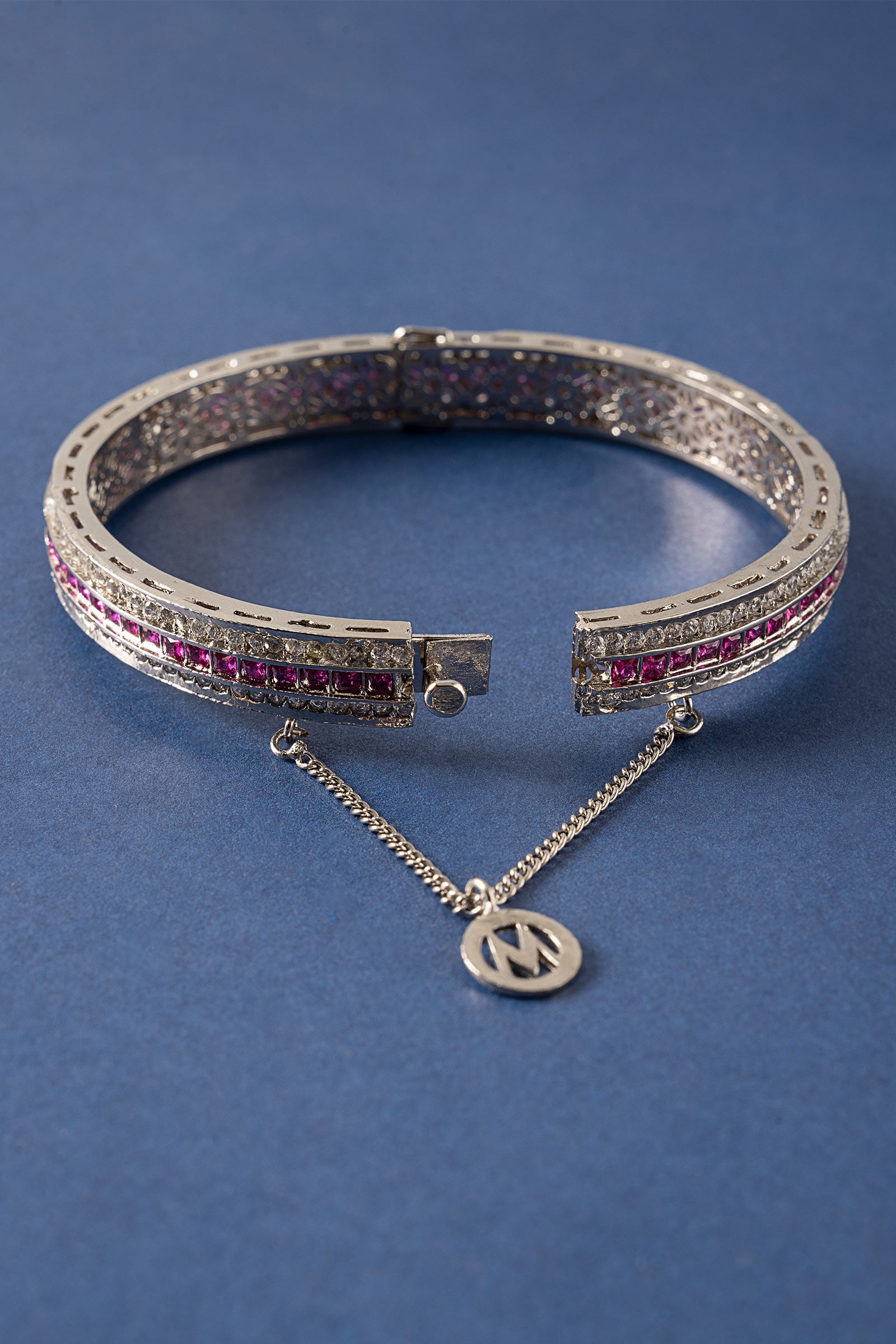 Bold meets beautiful in this statement churi, crafted with radiant pink rhodolite and sparkling white zircons. A contemporary twist on classic elegance, designed to turn heads at every celebration.