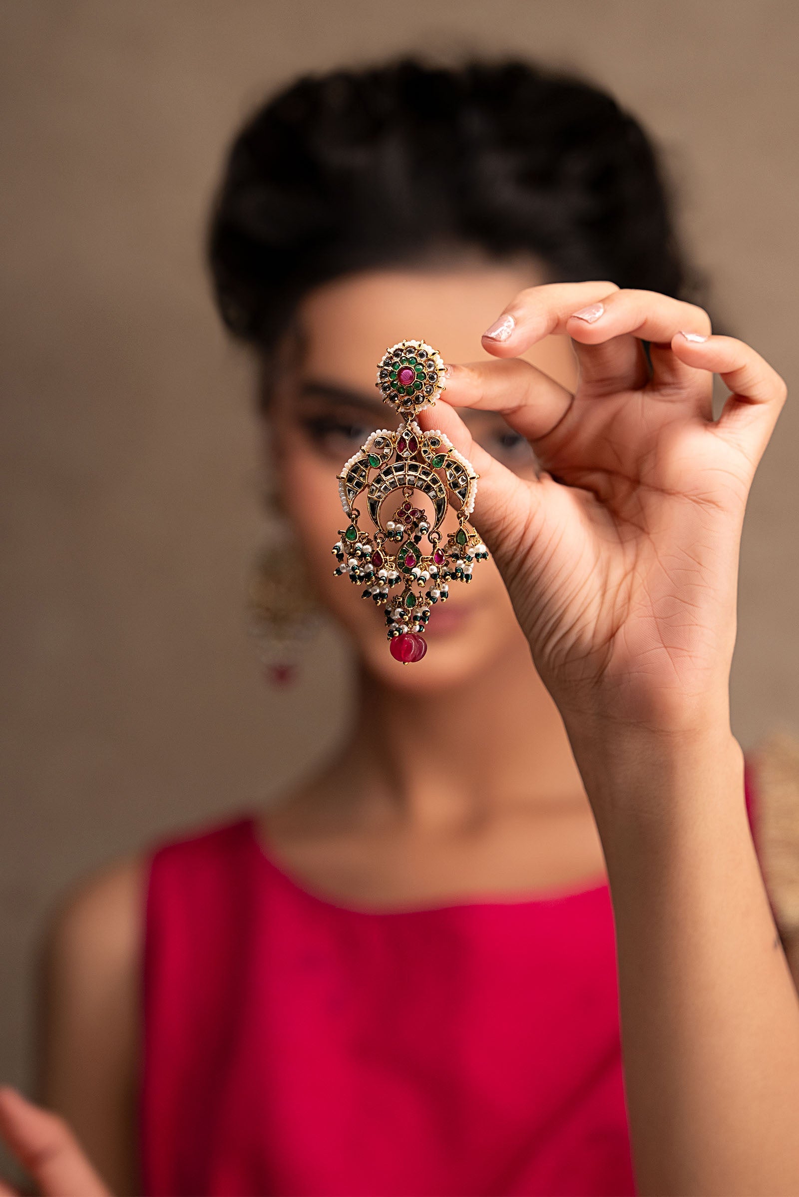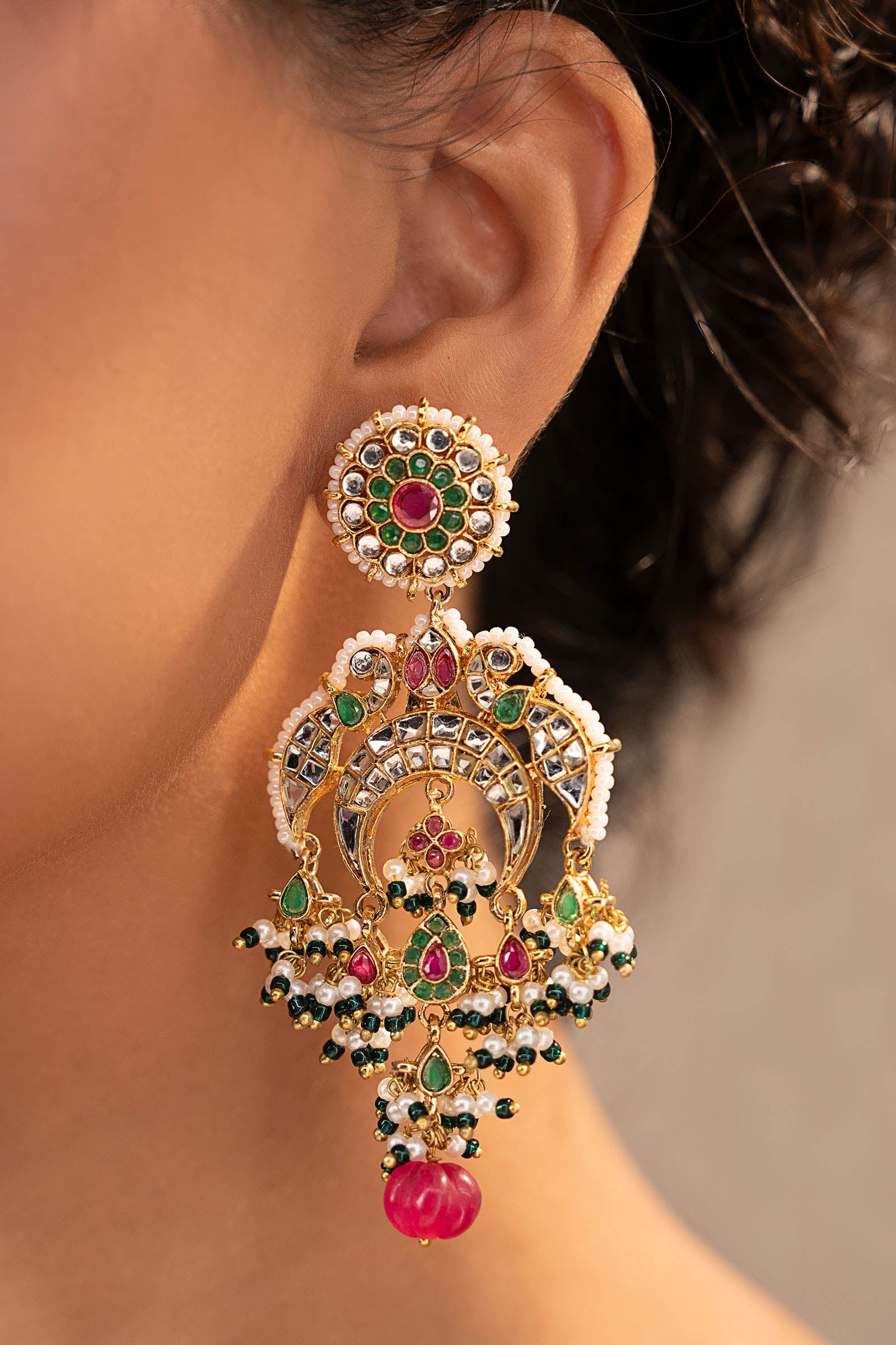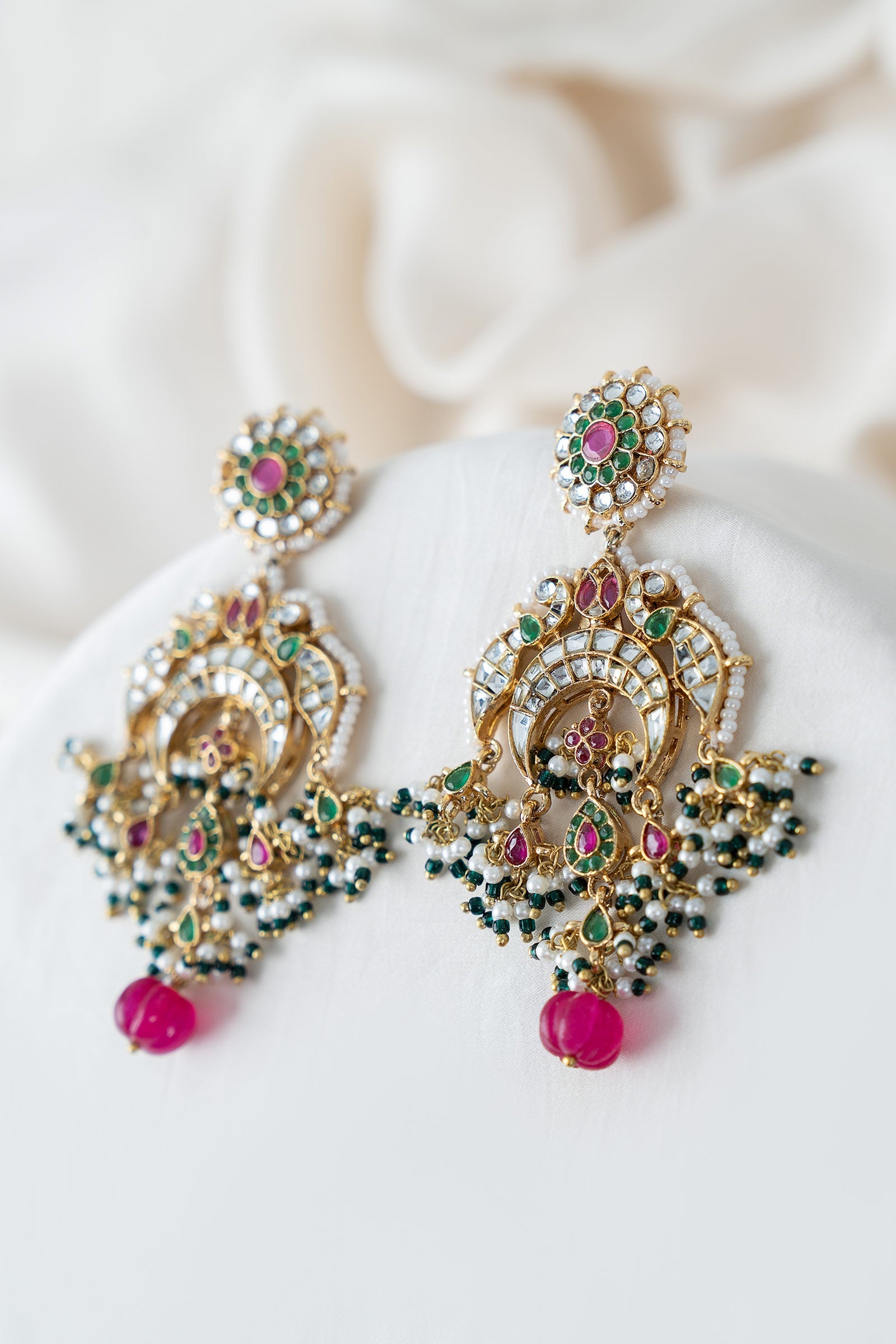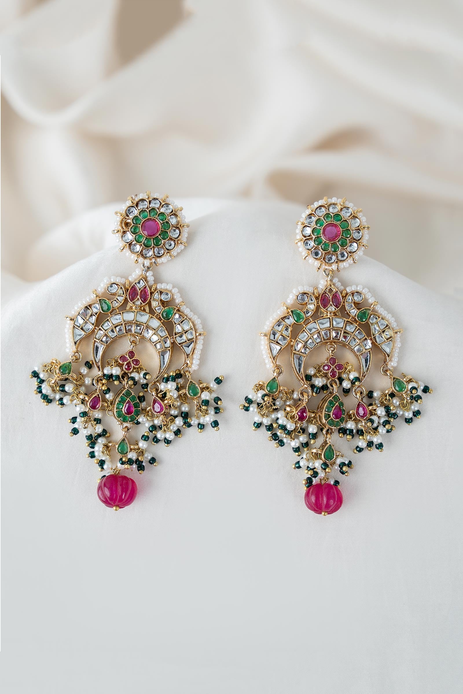 A celebration of rich heritage and vibrant hues, these earrings are adorned with pink chatham, white hand-cut glass, and green onyx stones. Finished with a striking pink watermelon stone in the hangings and delicately strung with white and green indian poth pyroi — this pair brings timeless charm and festive elegance to life.