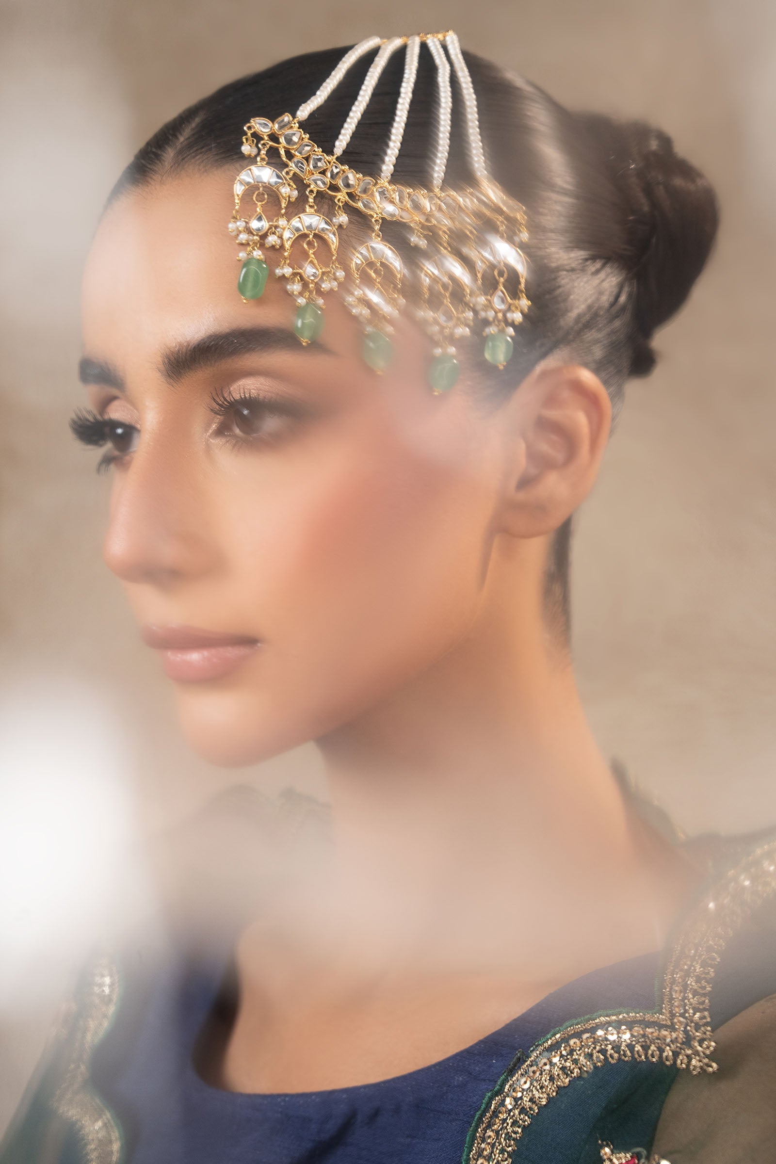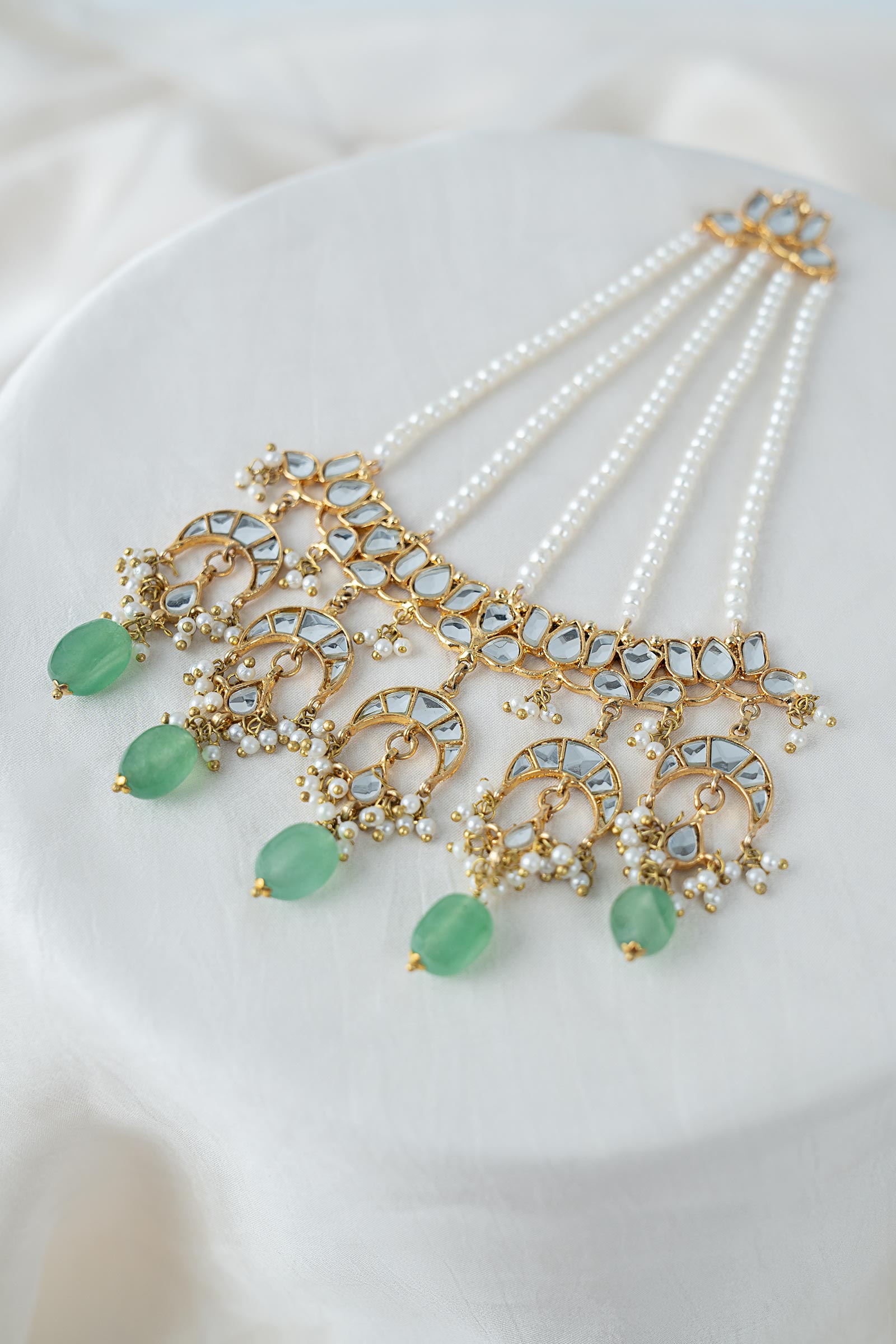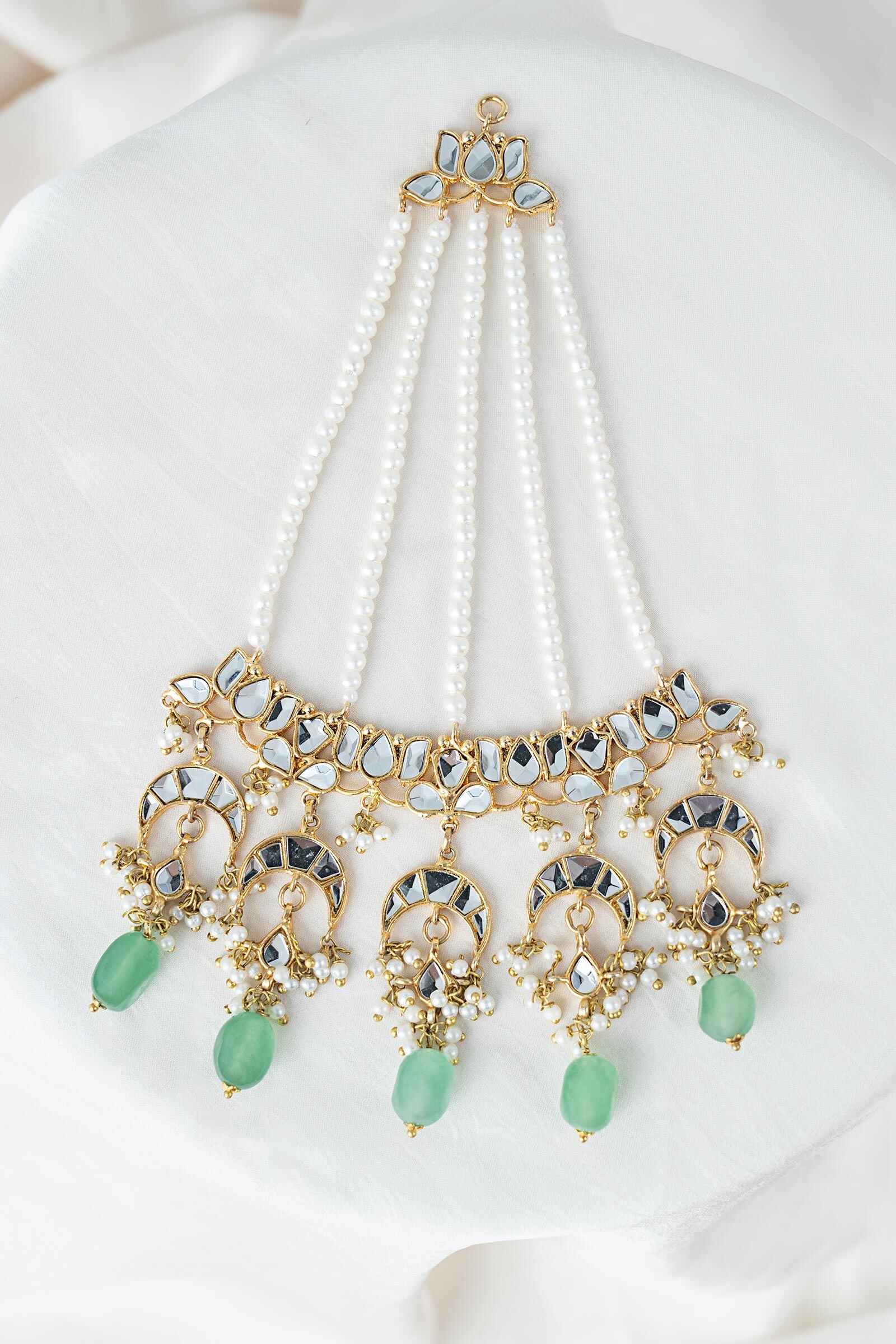 A radiant expression of tradition, this festive jhoomar dazzles with the brilliance of white handcut glass and the serene elegance of white pearls. Accented with refreshing mint green onyx and finished with delicate pearl pyroi, it’s a graceful statement piece that brings timeless charm and festive sparkle to every celebration.