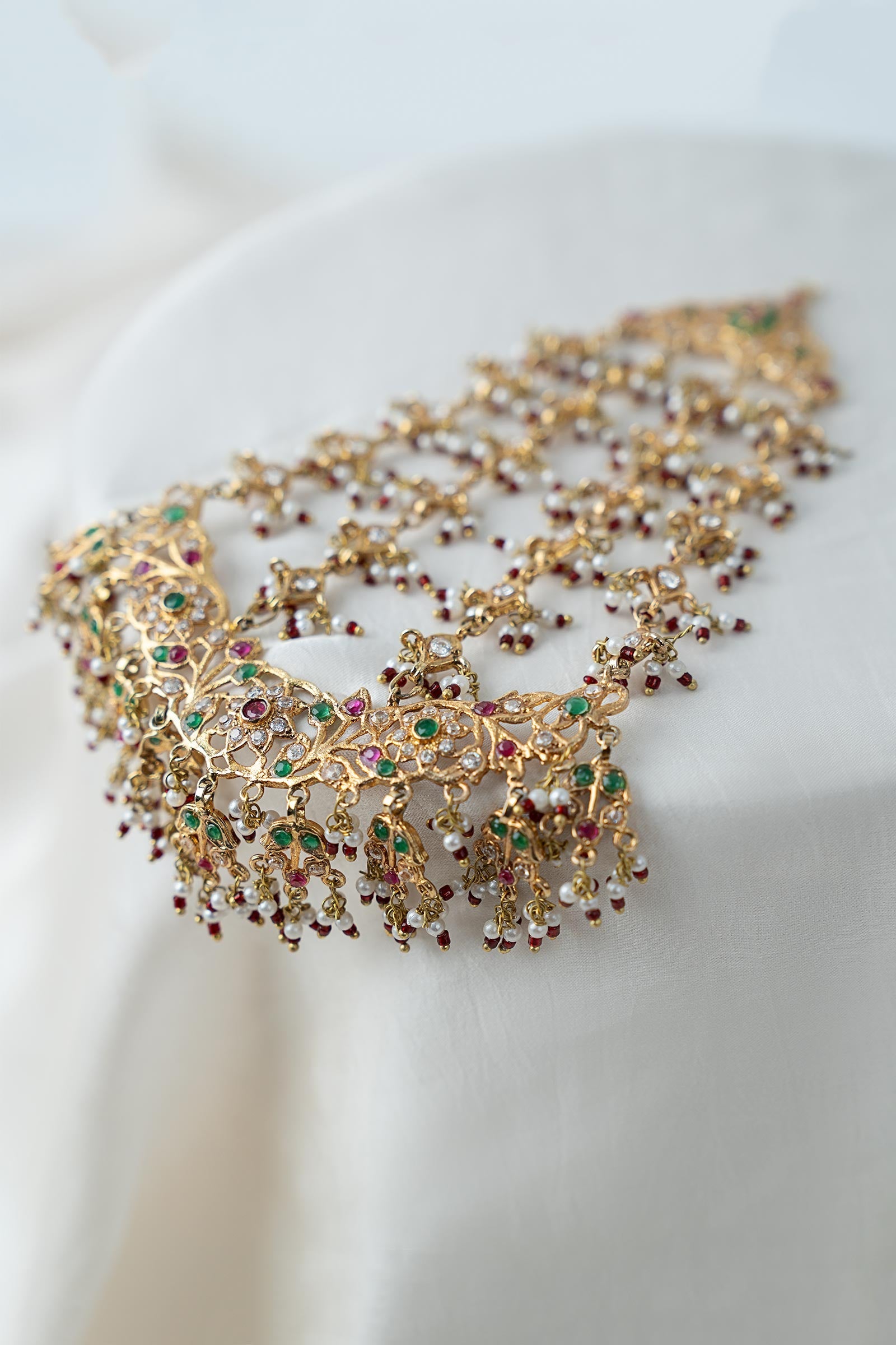 Drenched in festive opulence, this stunning jhoomar is adorned with the soft glow of pink chatham, the deep richness of green onyx, and the radiant sparkle of white zircons. Finished with graceful pearl piroi and a bold touch of red poth, it’s a timeless piece that captures the spirit of celebration with every shimmer and sway.