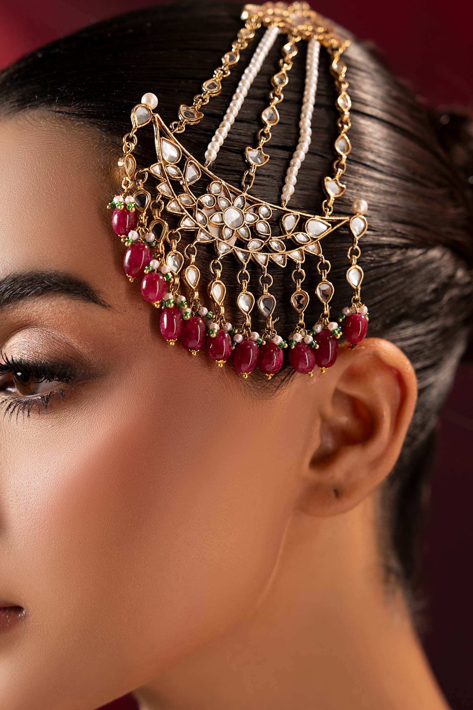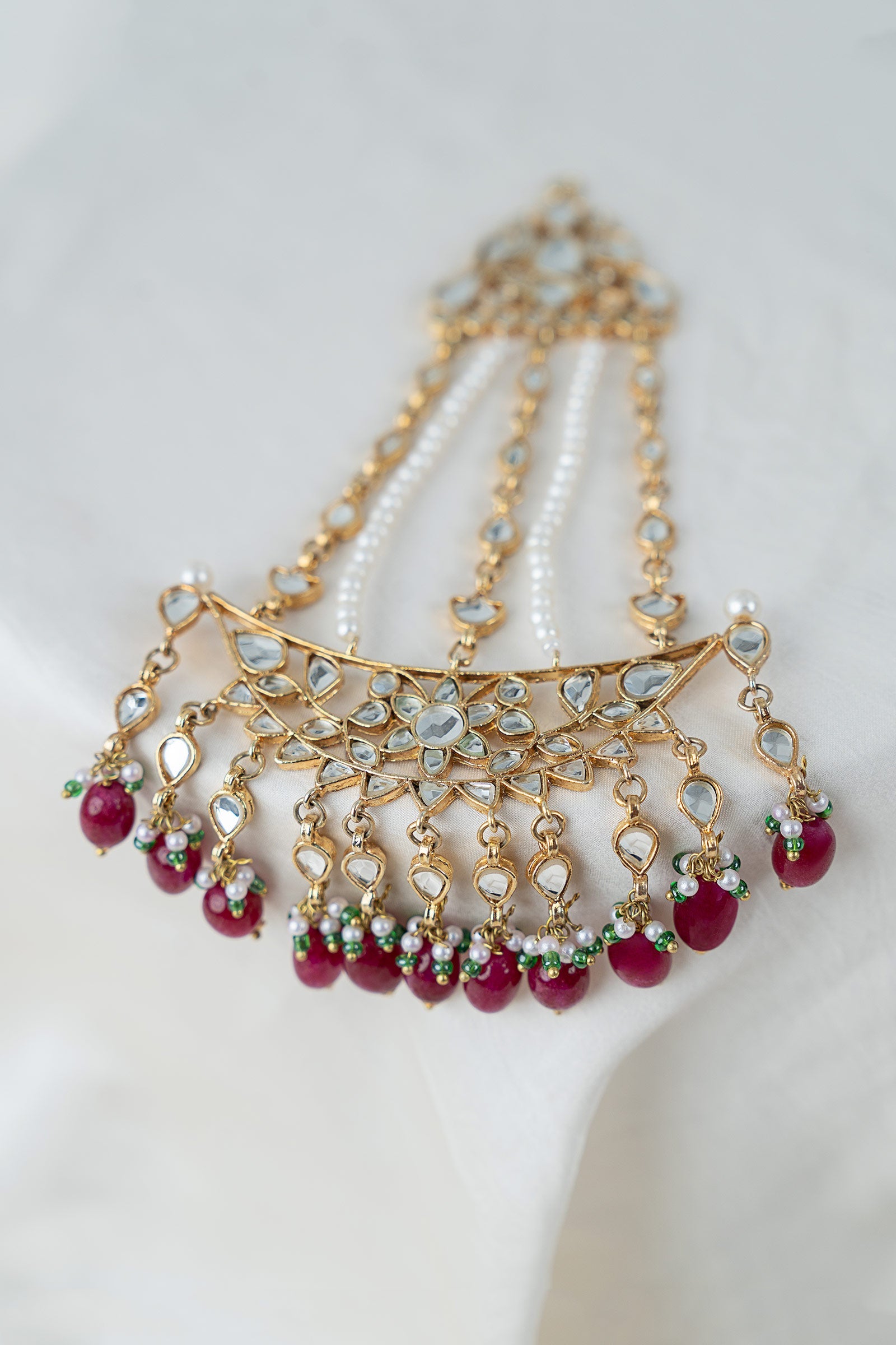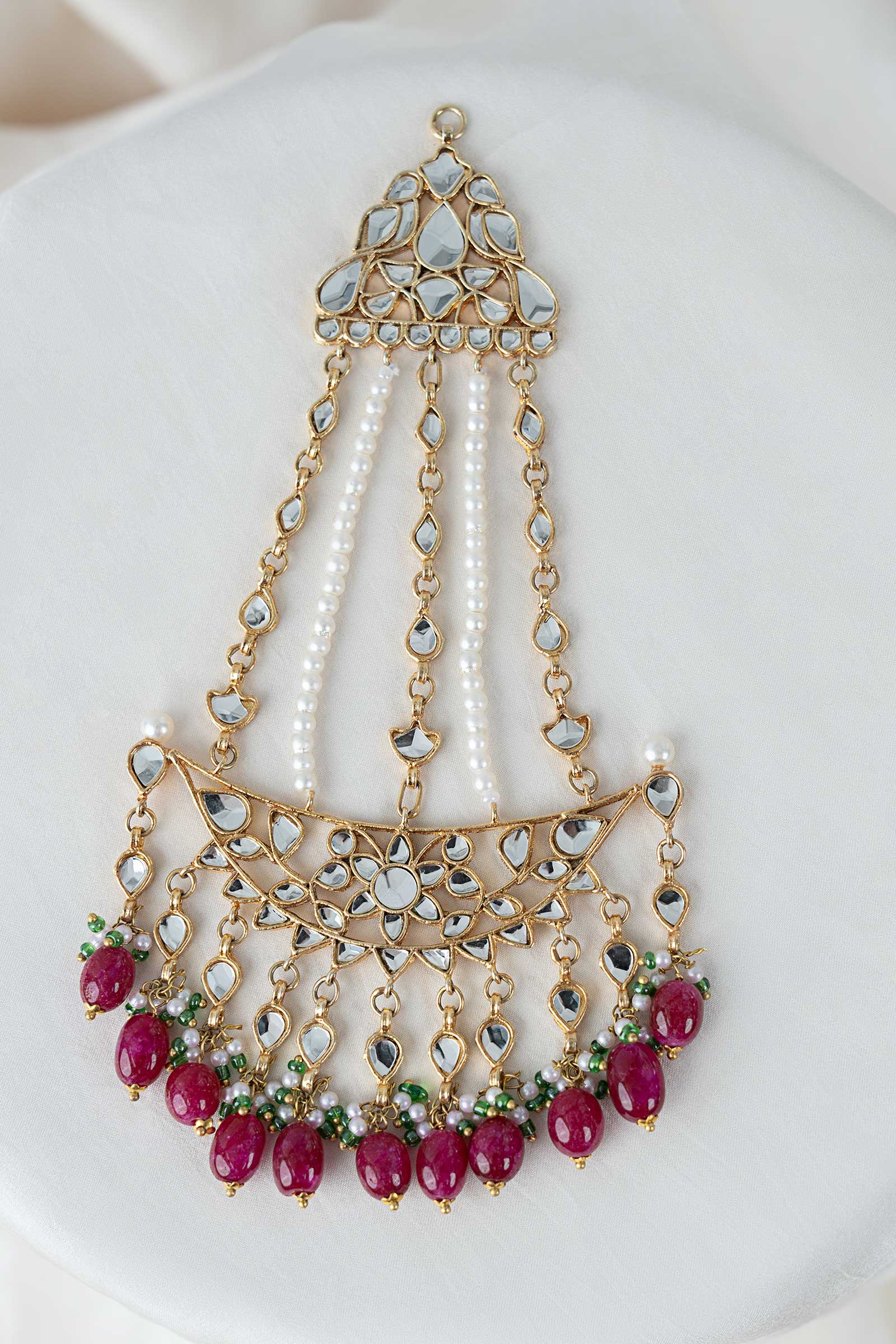 This gorgeous jhoomar exudes festive elegance and is embellished with the gentle charm of pink onyx and the dazzling dazzle of white handcut glass. It's a stunning statement item to add classic elegance and glamour to your traditional look, accentuated with exquisite pearl pyroi and a splash of green poth.