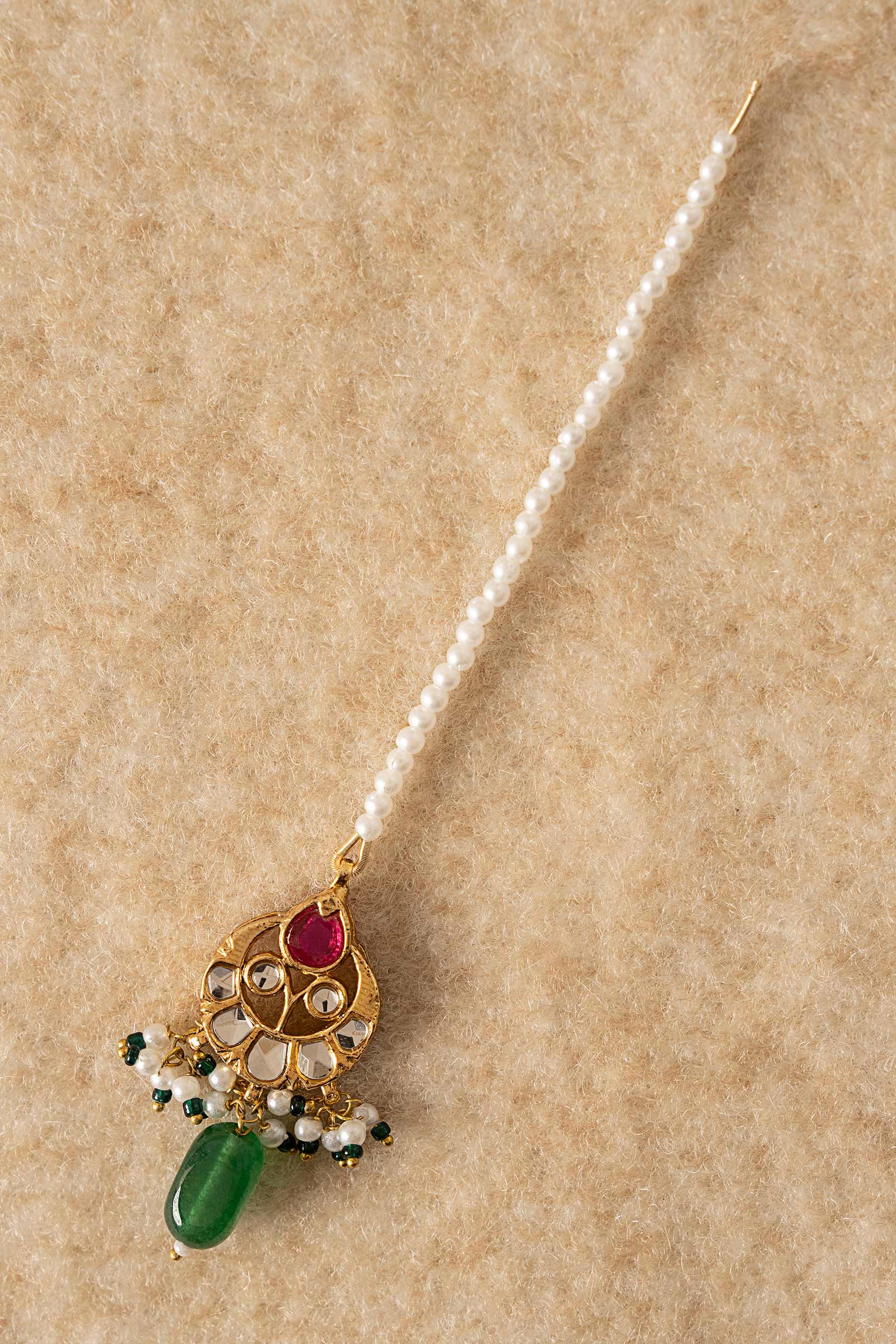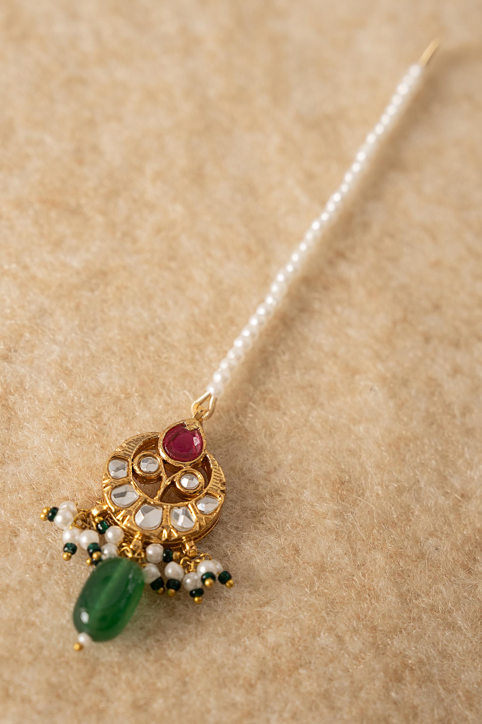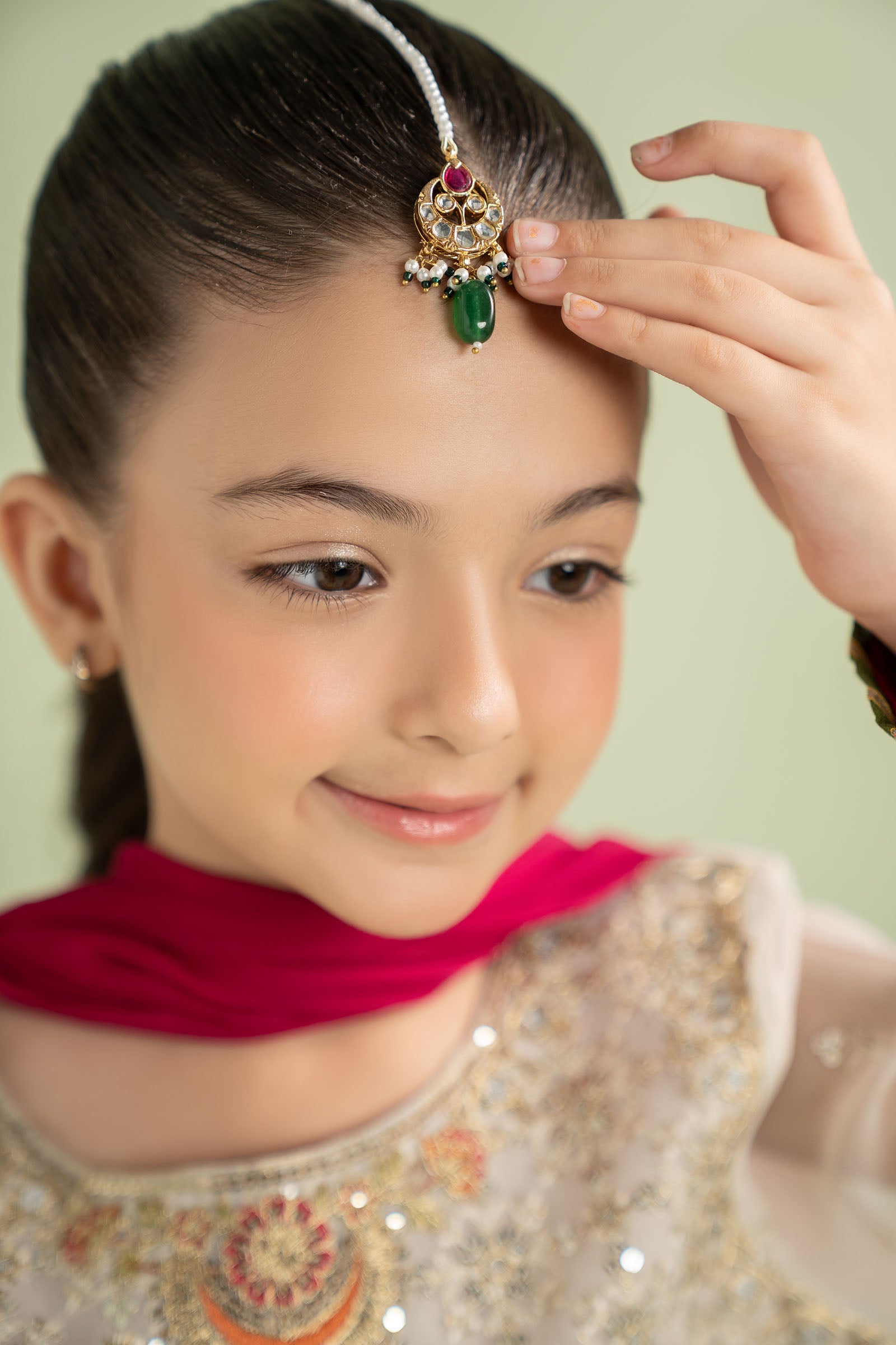 Adorn your child with this charming festive tikka, which has white handcut glass and pink chatham with a subtle glitter that is exquisitely matched with green onyx hangings. This whimsical yet sophisticated item, finished with delicate white pearls and vivid green poth pyroi, gives any celebration a perfect blend of charm and tradition.