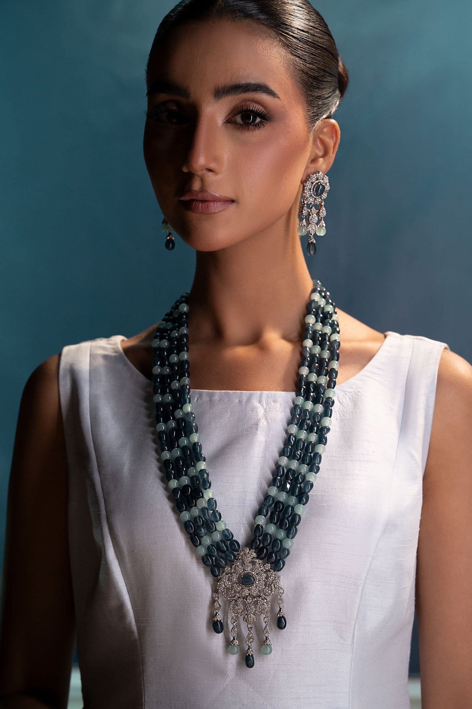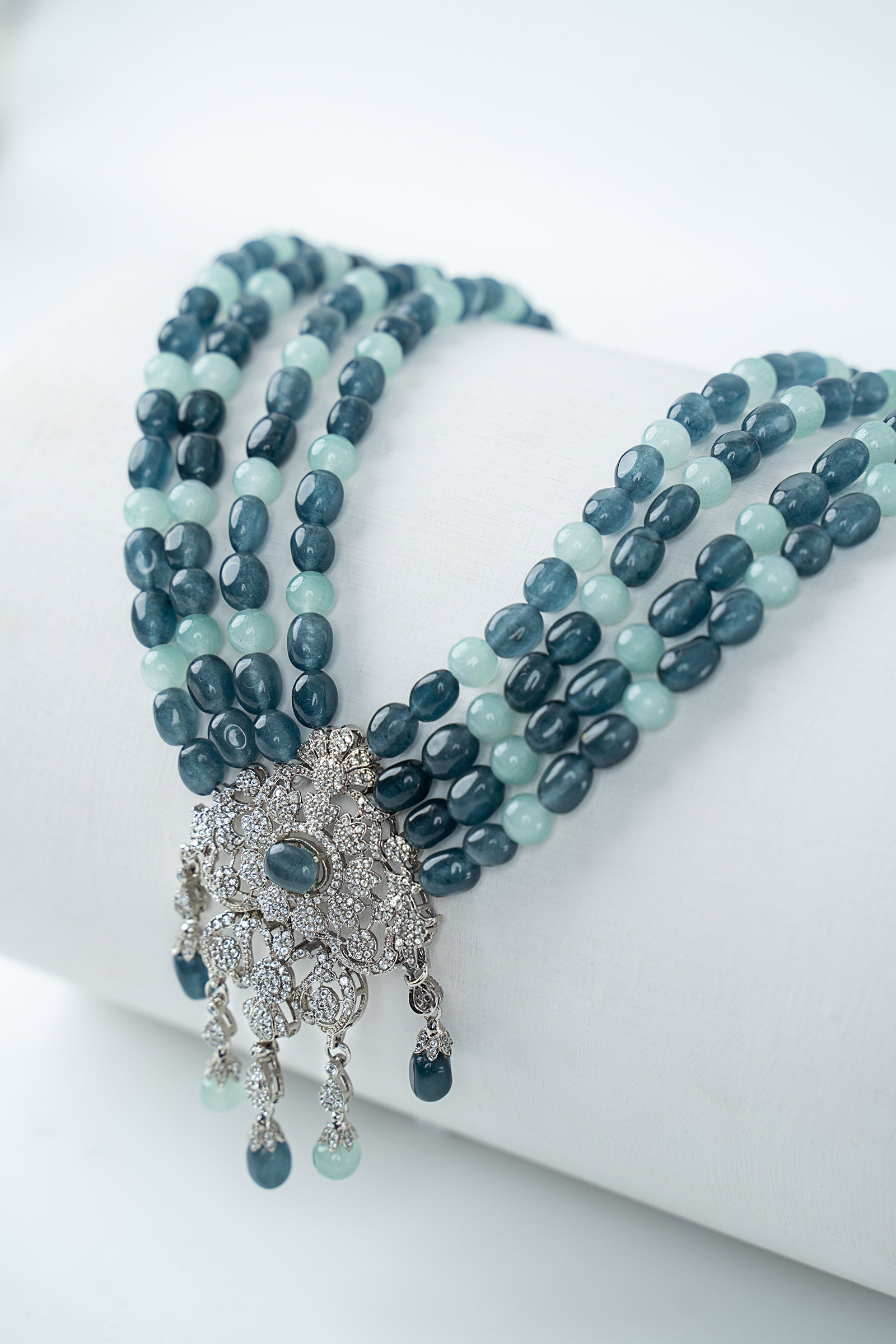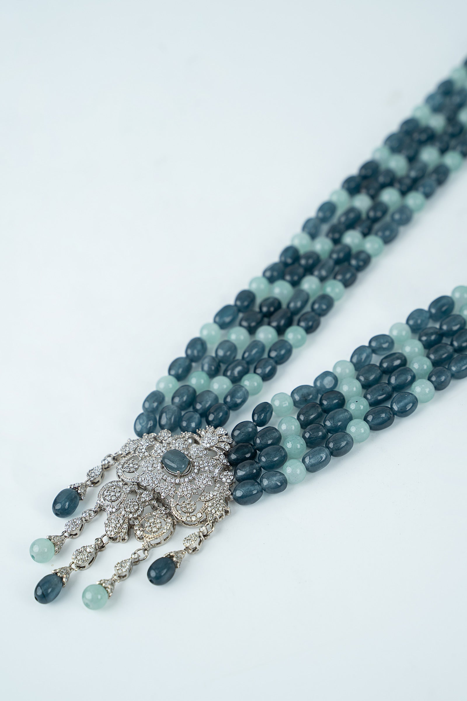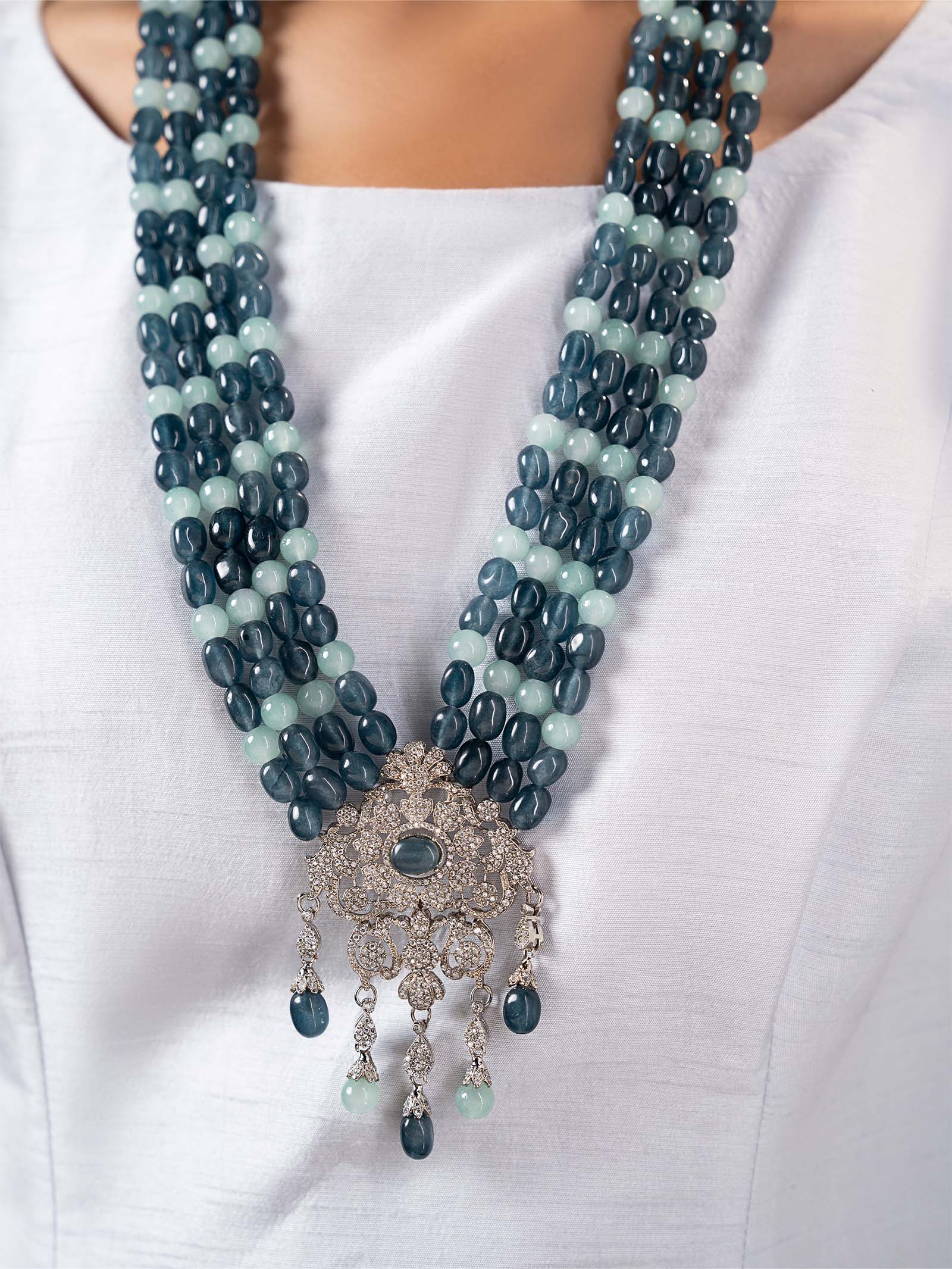 This gorgeous mala, which is made of rich blue onyx and sparkling white zircons and is accentuated with delicate blue and light blue onyx stones dangling from it, will add a touch of radiance to your festive ensemble. An exquisite balance of color and sparkle that will give your traditional celebrations a timeless charm.