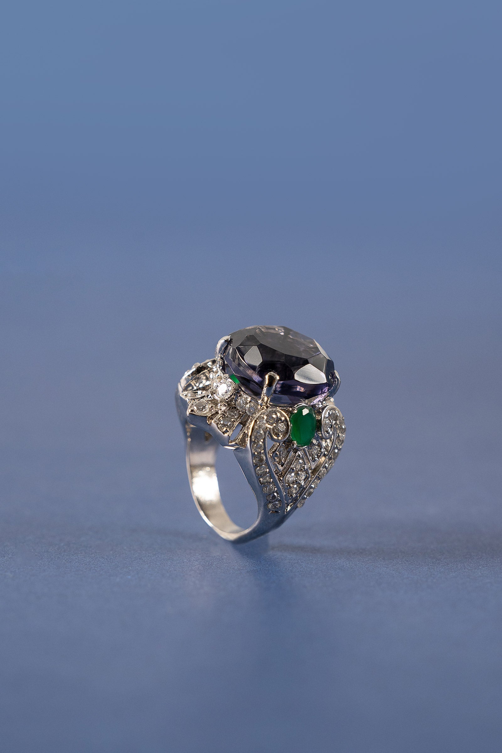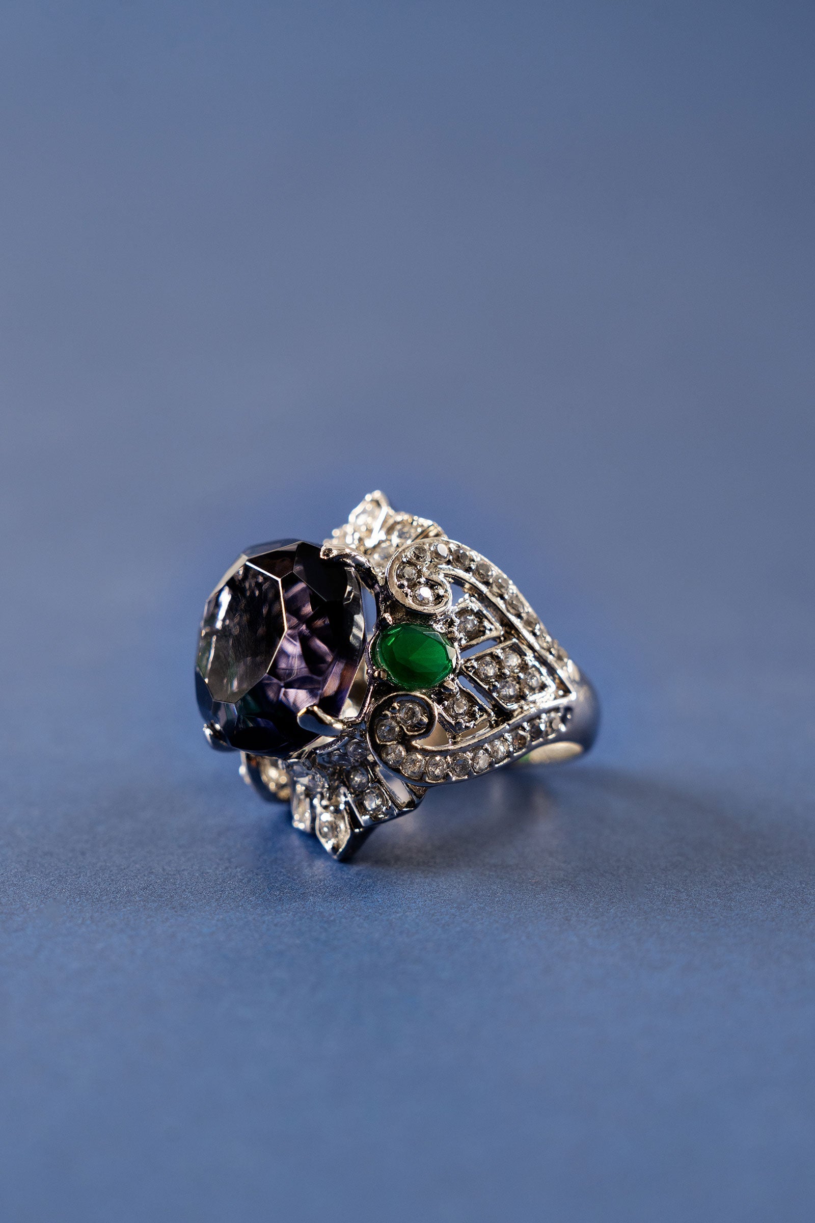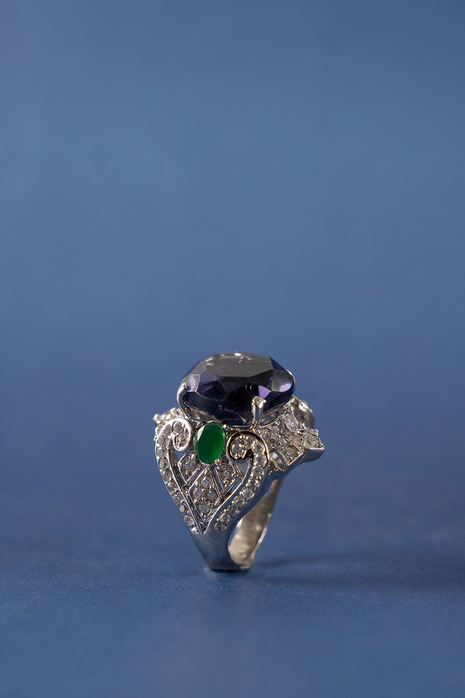 Dramatic hues and modern sophistication come together in this beautiful ring, which shines with green onyx, sparkles with white zircons, and blossoms with the dreamy beauty of a violet glasscut centerpiece. A festivity, color, and light celebration — designed to dazzle with every graceful gesture.