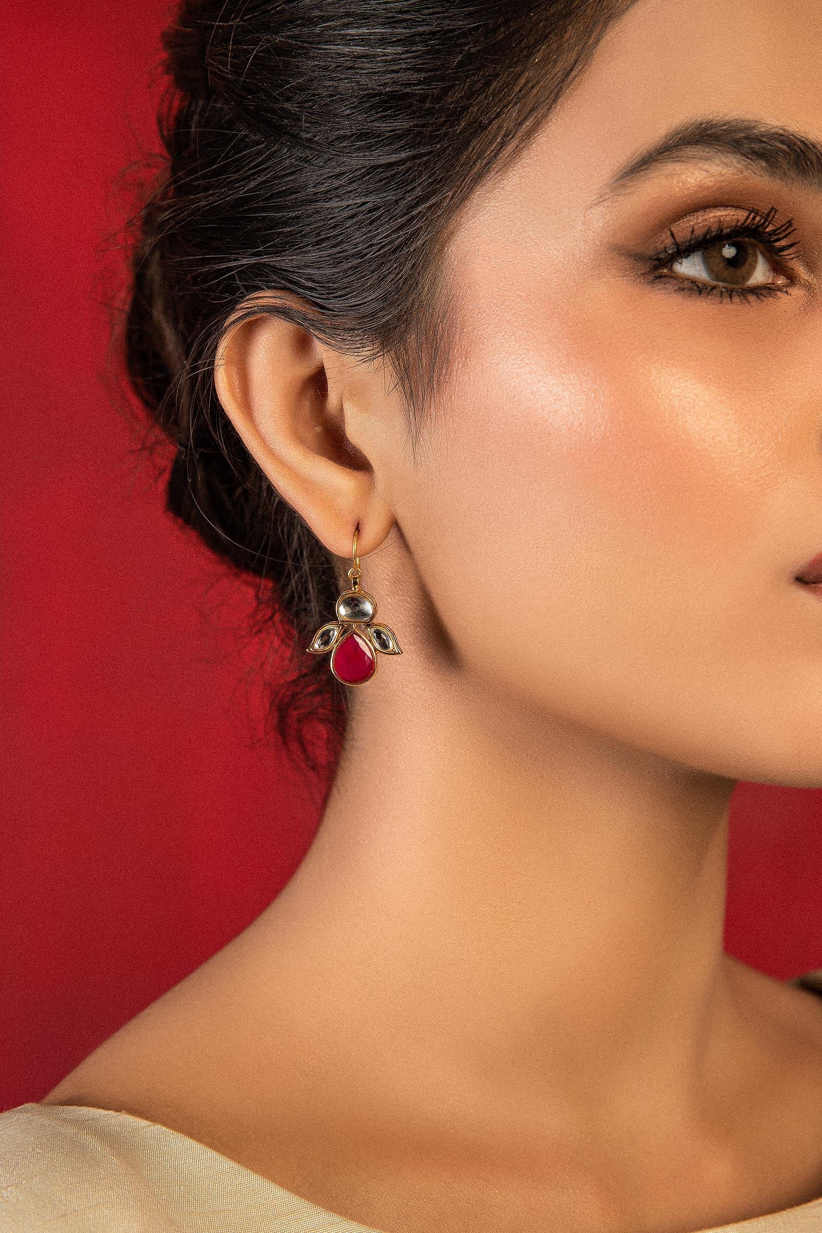 Add grace and glamour to your jewelry with these dangling fish hook pin earrings embraced with red Chatham along with handcut glass cutting stones in 21K gold plating. Alloy metal