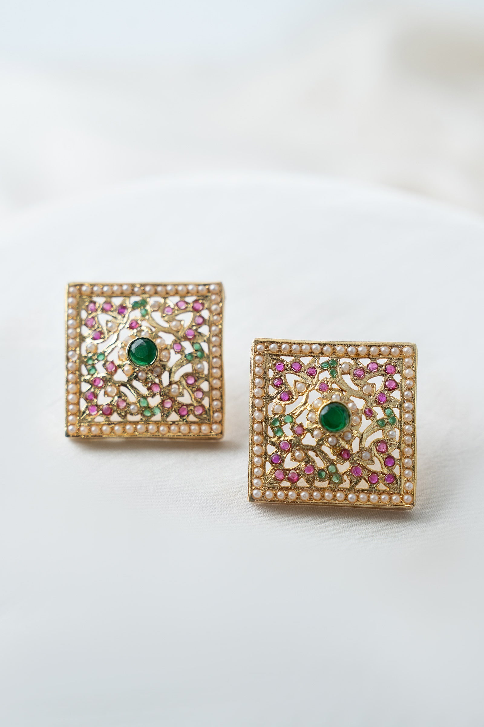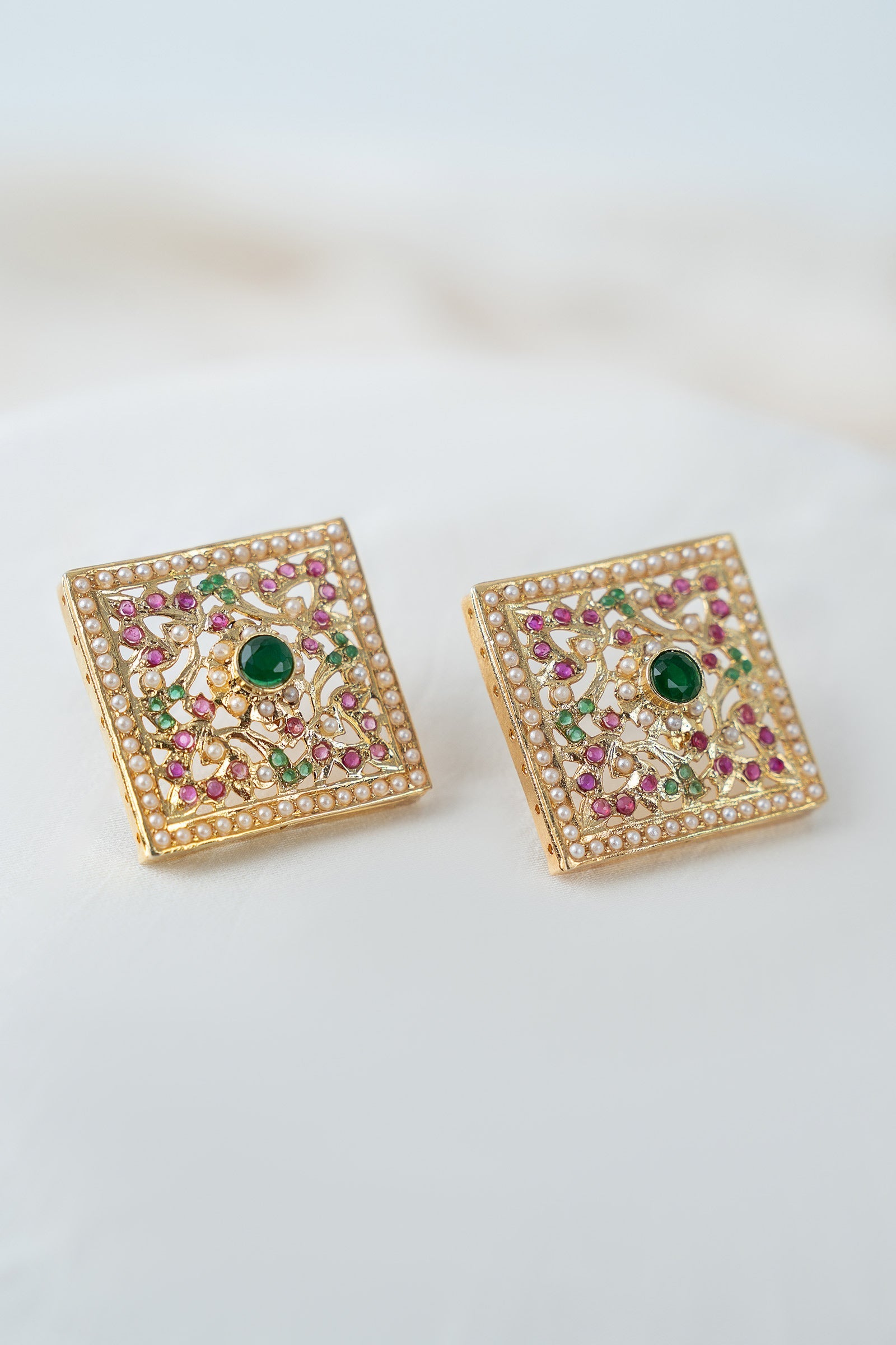 Illuminate your look with our 2Pc Choker and Earrings Set that showcases pink chatham, green onyx and white pearls artistry encaged with light green beaded indian poth pyroi. This masterpiece is perfect for adding sophistication and grace to your festive style.