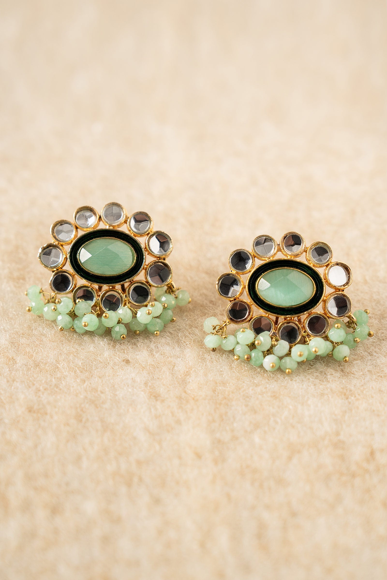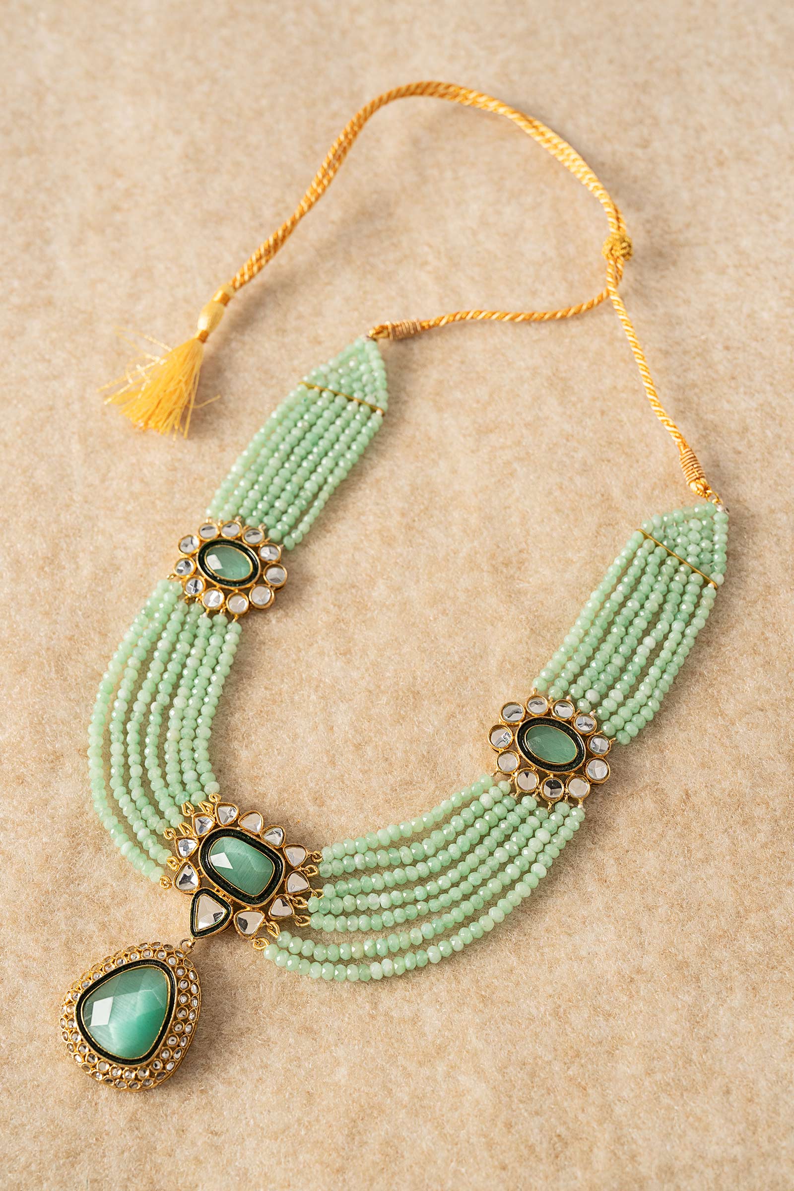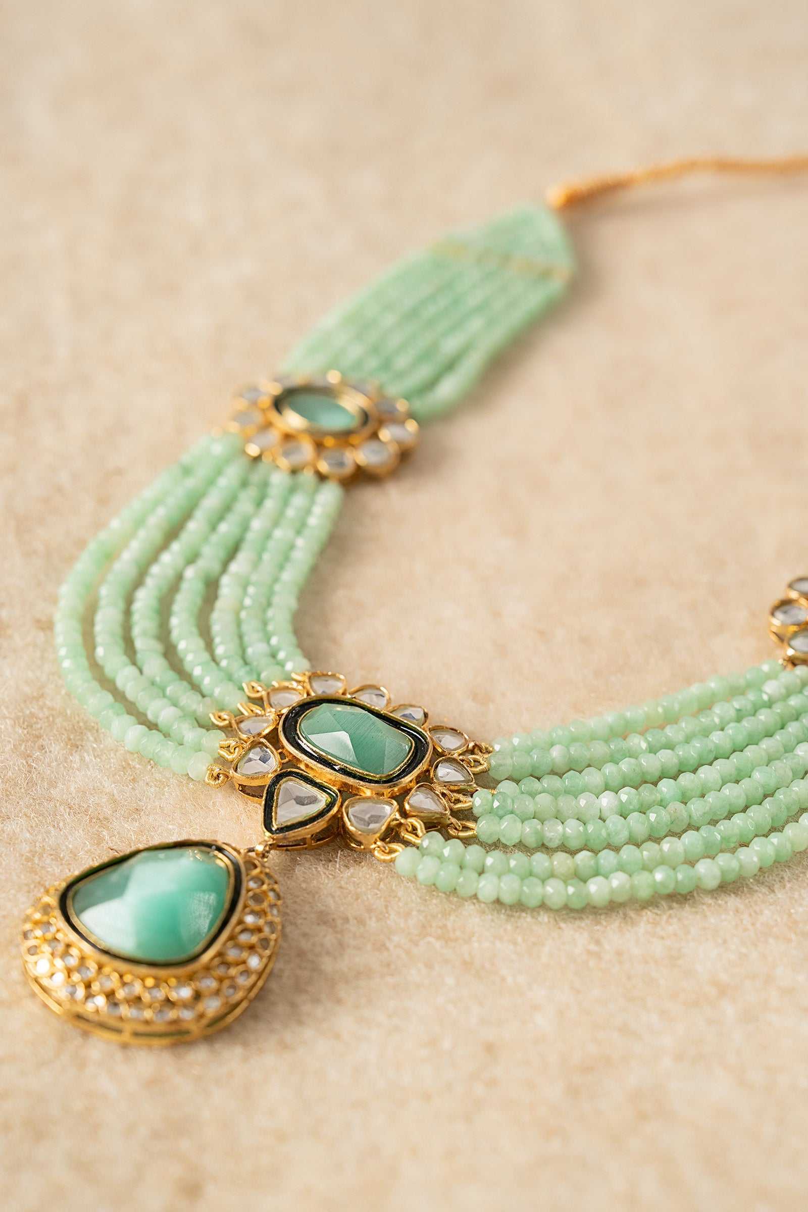 This charming 2Pc necklace and earring set combines the calming shades of mint green and mint green onyx with the brilliant sheen of white handcut glass in a delicate waltz of purity and freshness. It blends history and contemporary into a classic holiday tale, accentuated by powerful black enamel strokes. It is designed to add poetic appeal and tranquil elegance to your celebrations.