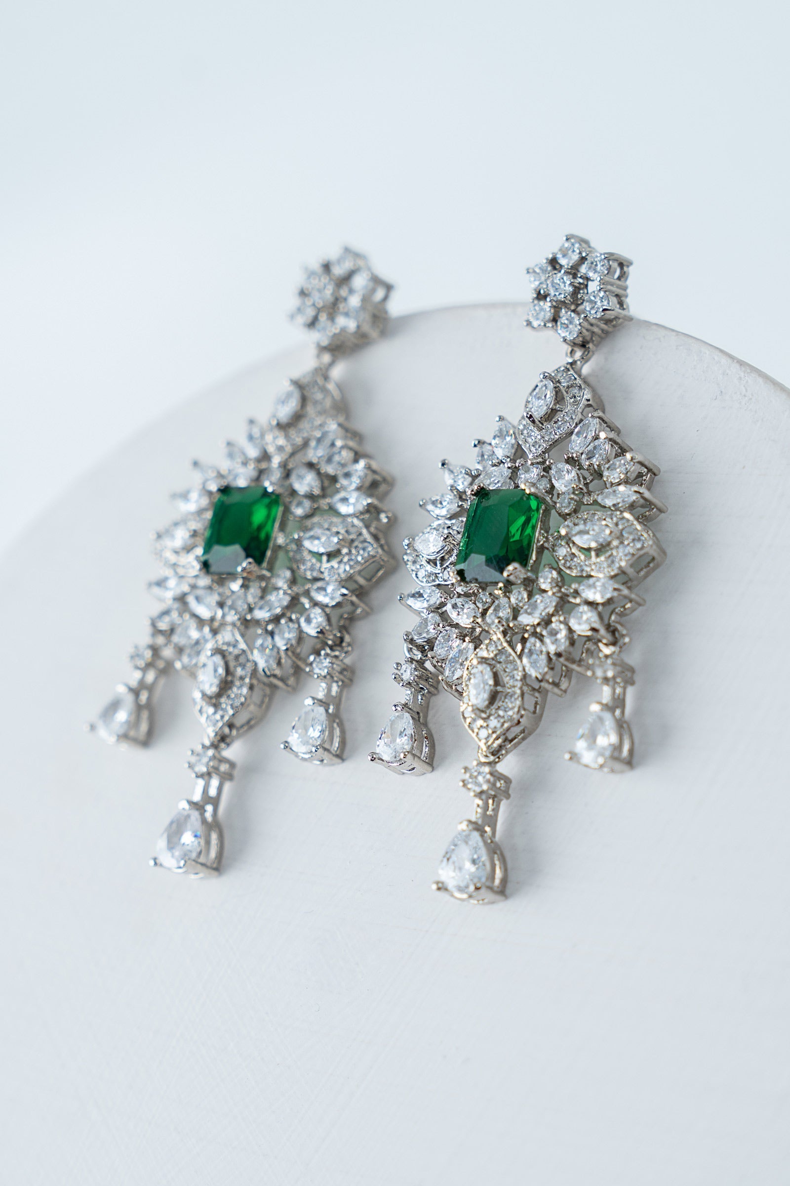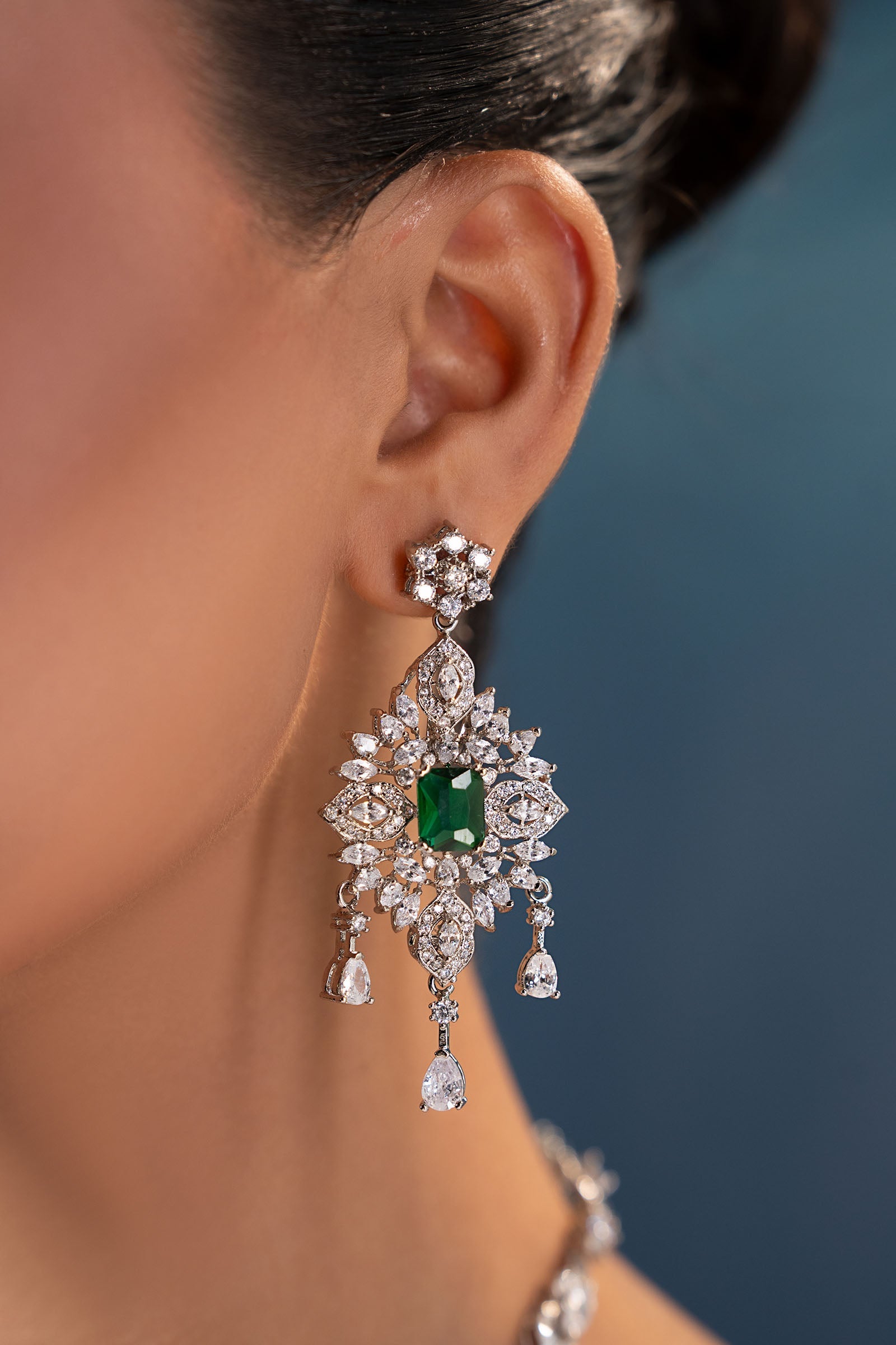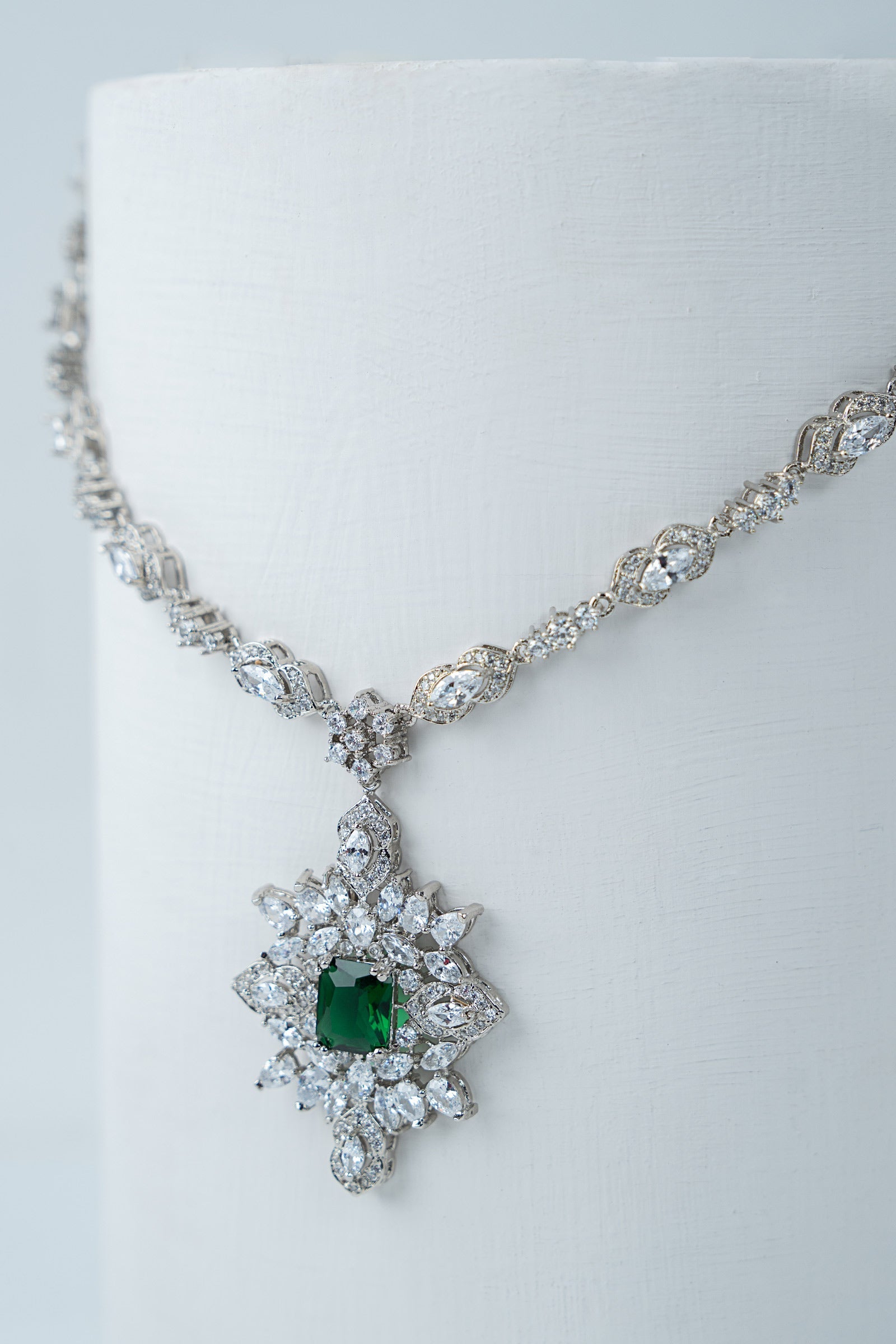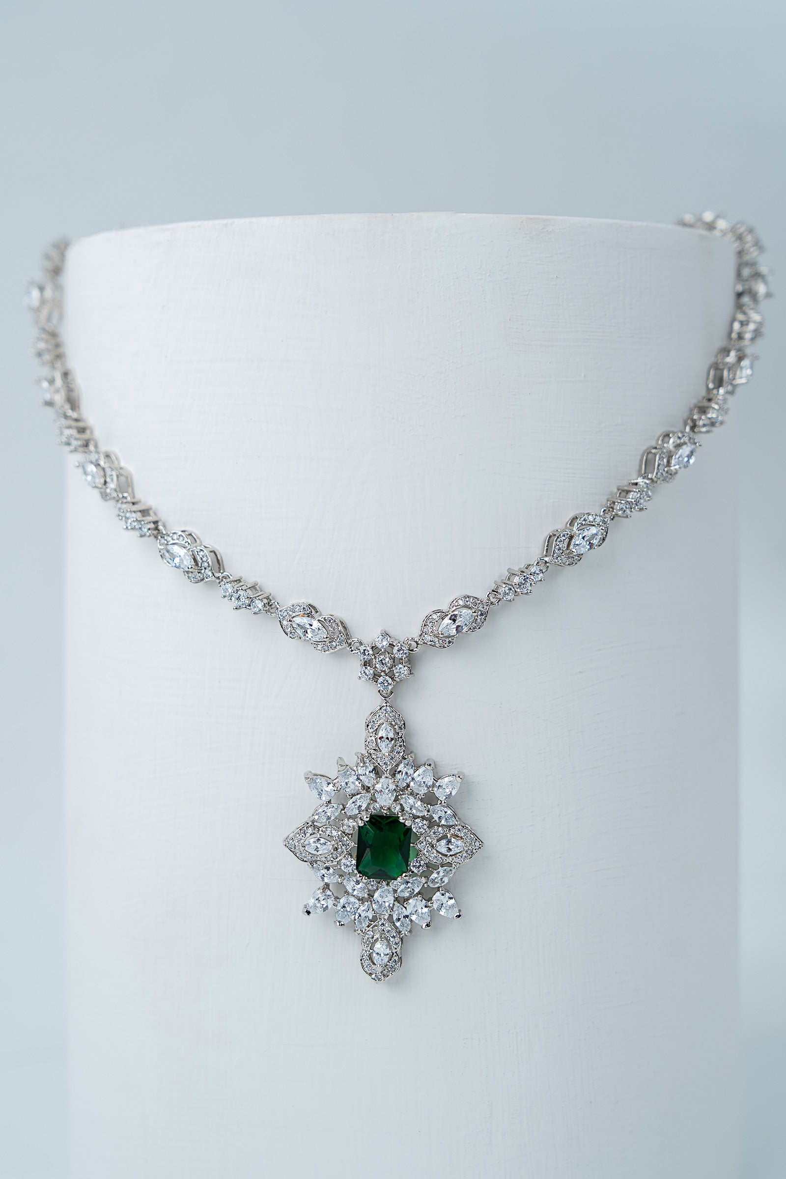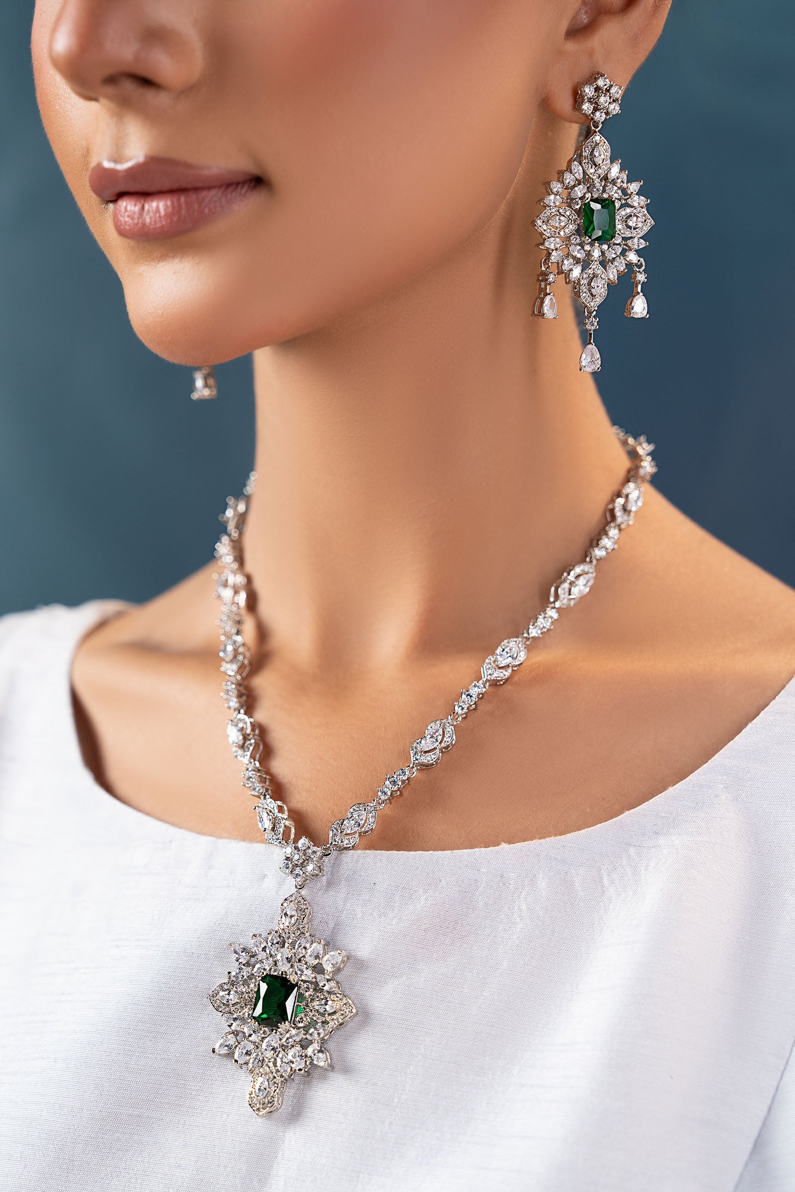This 2Pc necklace and earrings set, which has a stunning combination of sparkling white zircons and deep emerald green, exudes contemporary elegance with a festive vibe. Bold yet elegant, it's made to add a new, fascinating glow to every occasion, fusing tradition with modern charm.