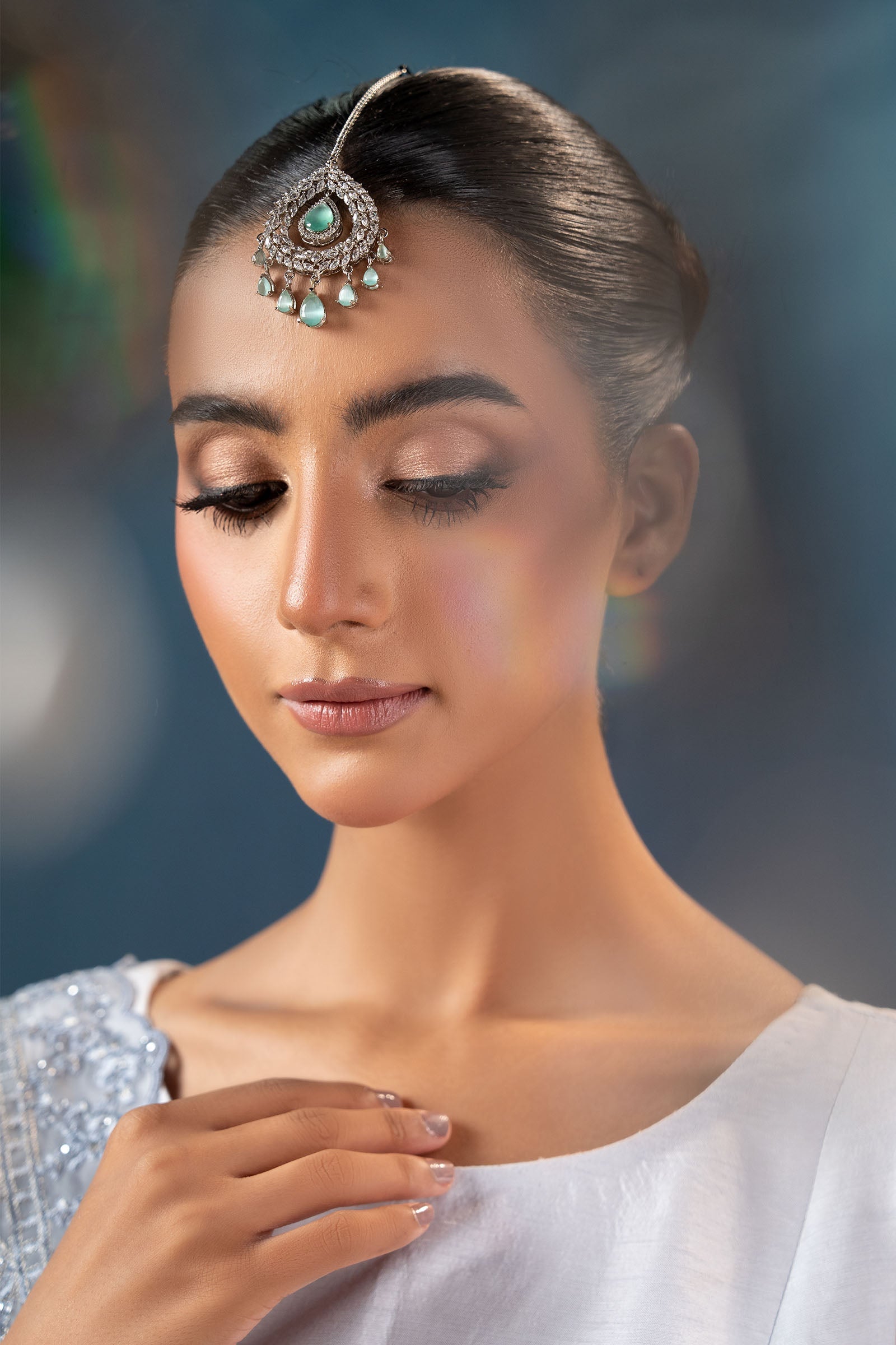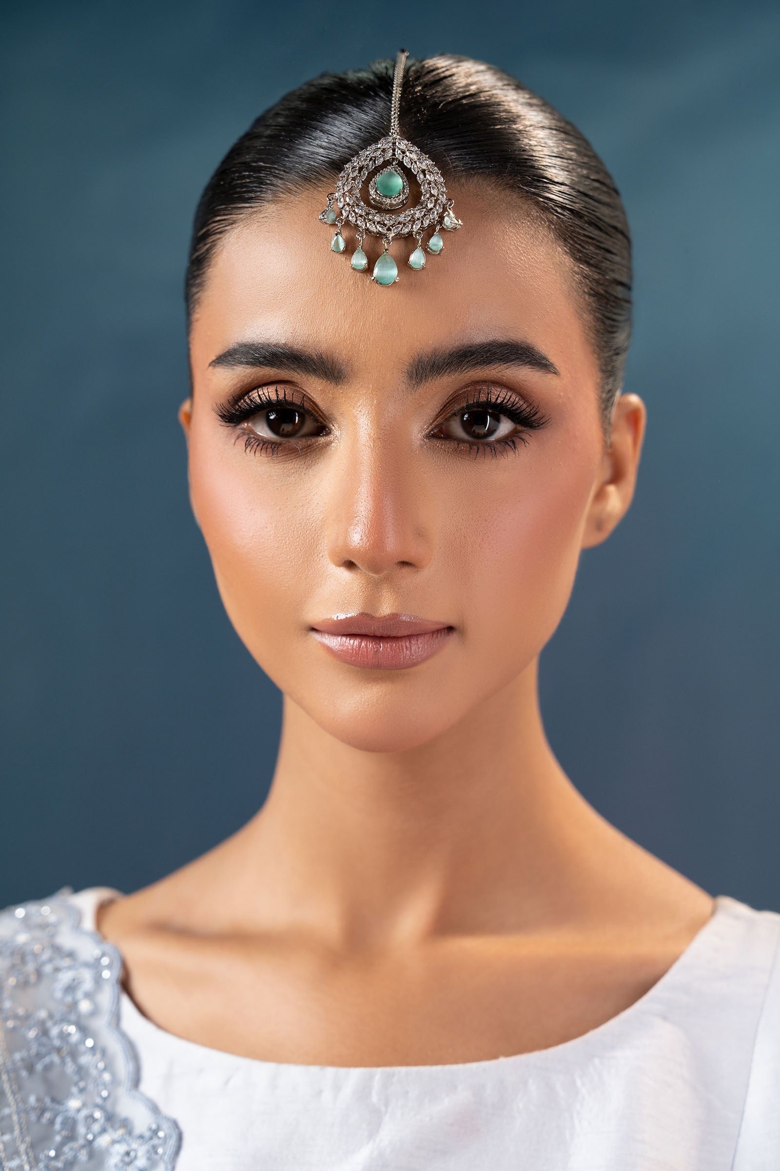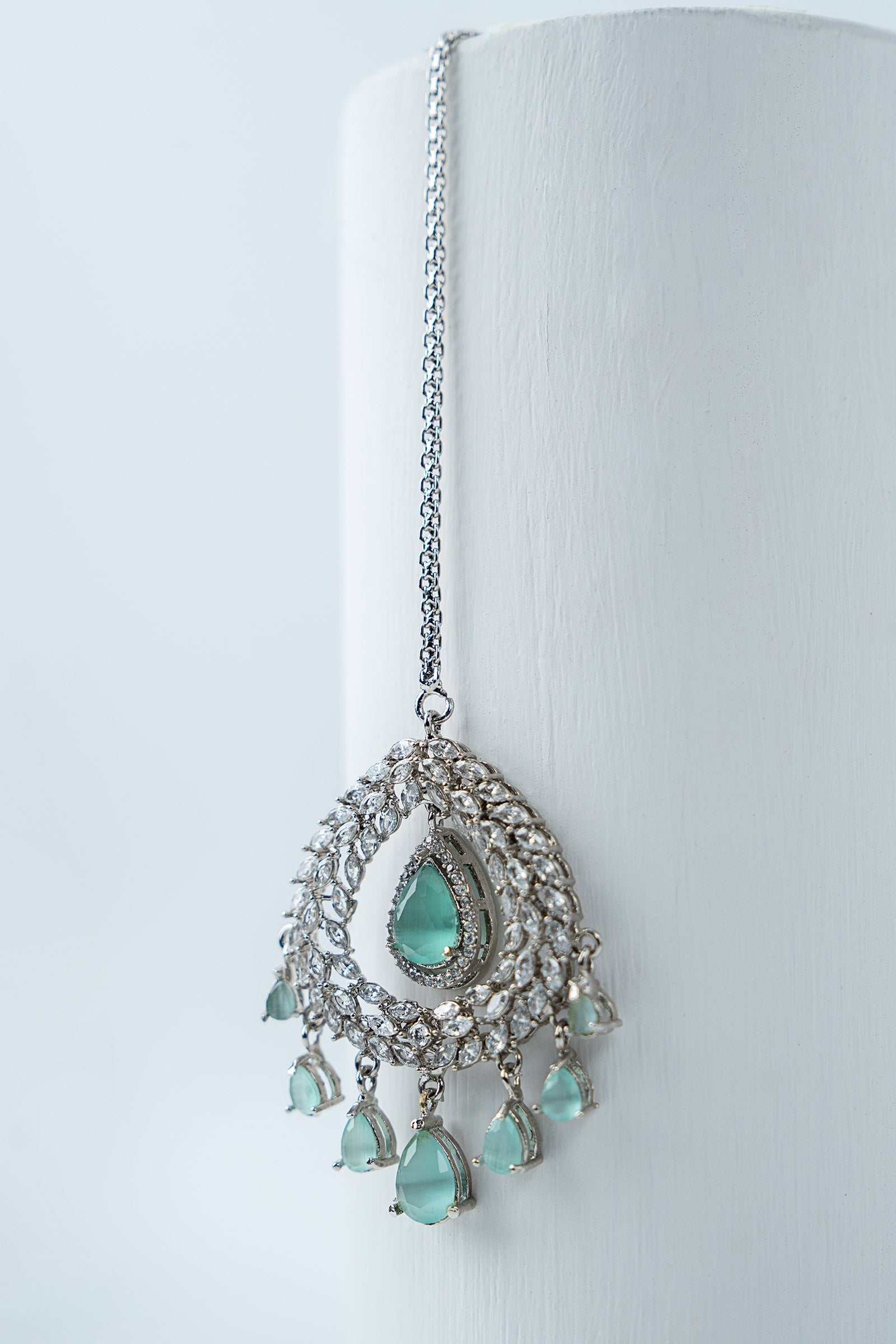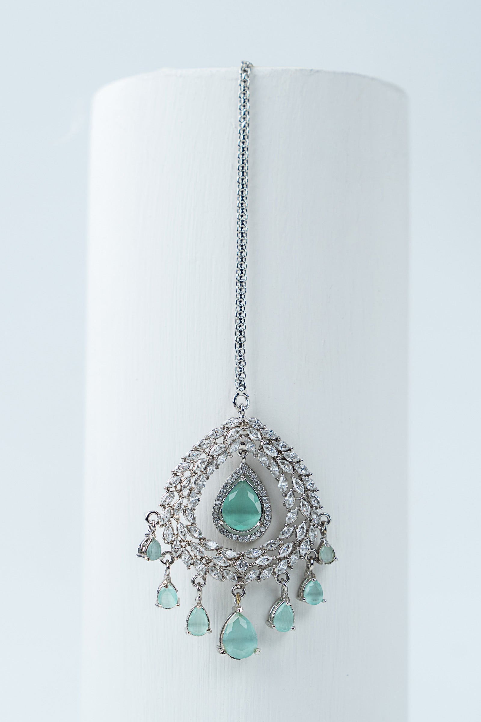This brilliant tikka is a statement of contemporary elegance, glistening with the royal charm of mint green cat's eye stone and the brilliance of white zircons. It adds a lovely harmony of tradition and modern charm to your festive costume and is made to sit elegantly at the center of your celebration appearance.