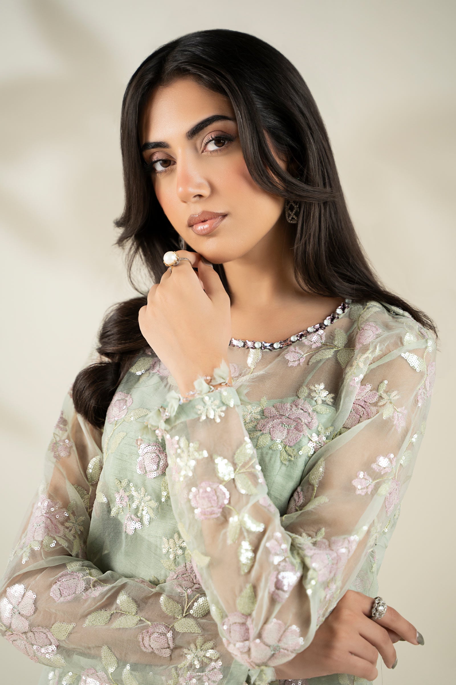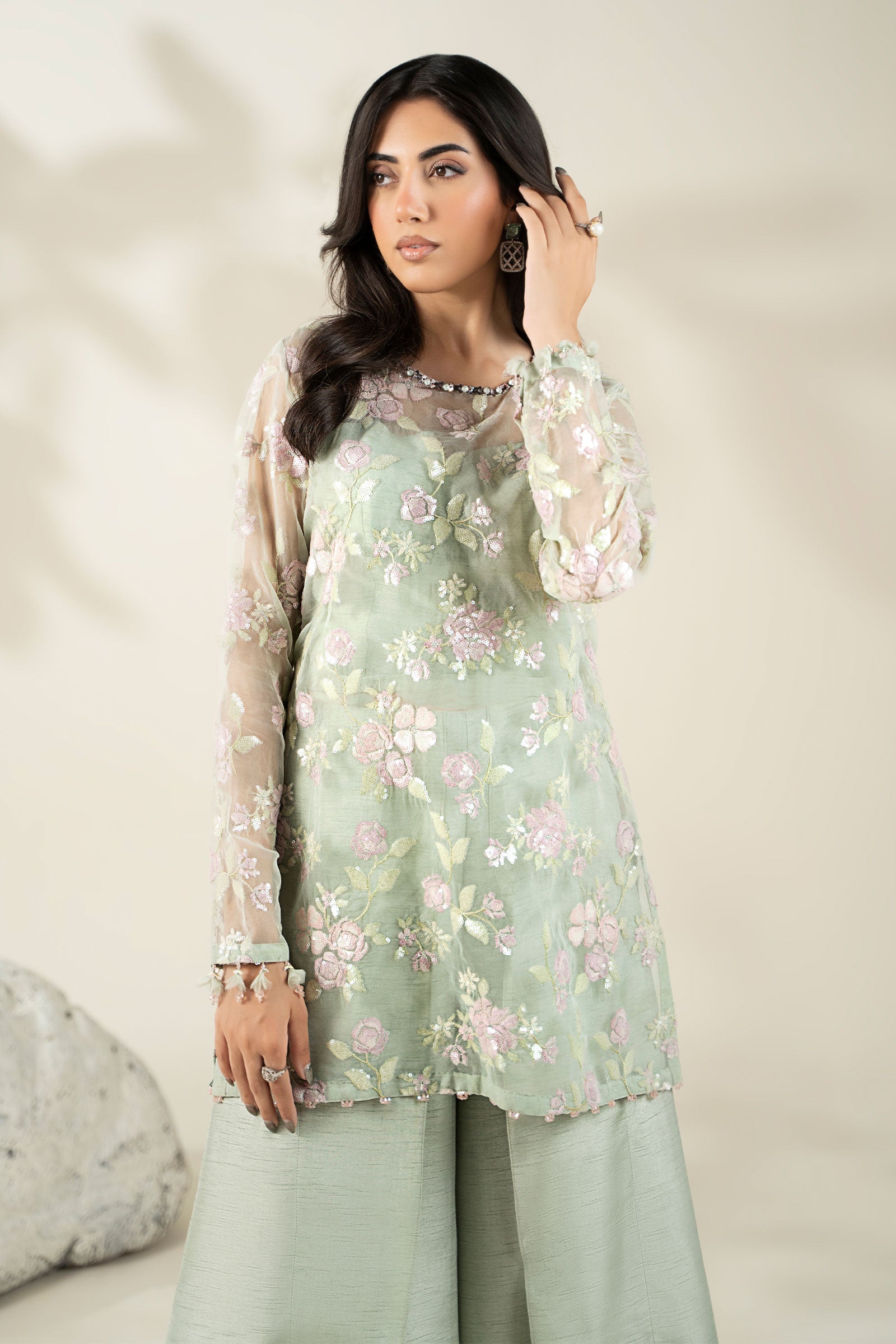 Shirt: Heavy Pattern Of Beautifully Merged Sequin Details With Embroidery On Modern Flowers