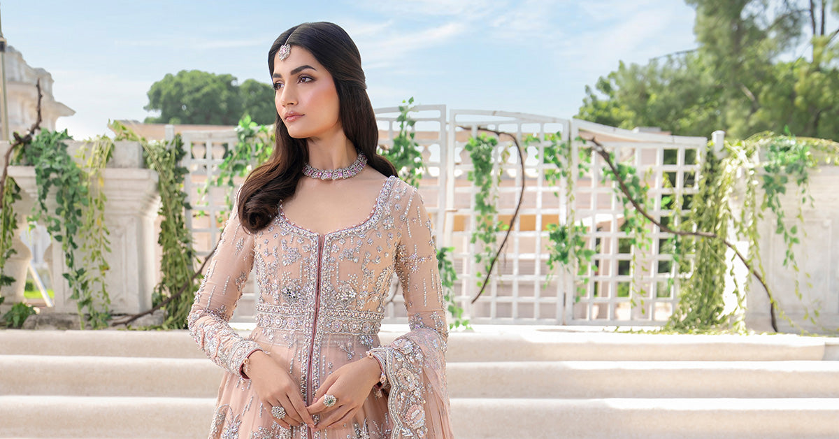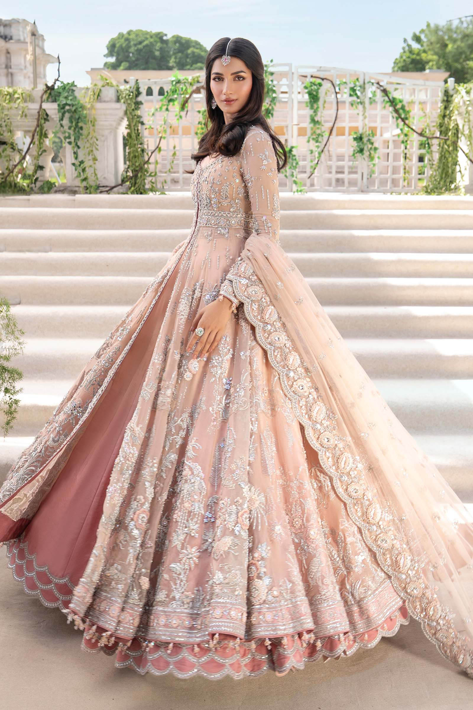 Inspired by shikargah motifs, this masterpiece symphony of art and emotion, this ethereal front-open gown in pure organza glistens with mirrored whispers and hand-sculpted 3D florals, kissed by pearls and the timeless intricacy of dabka and naqshi. Flowing into a silk ombré lehnga that dances with tassels and romance, and veiled with a diaphanous net dupatta, it’s a portrait of the modern couture — bold in spirit, regal in grace, and steeped in heritage.