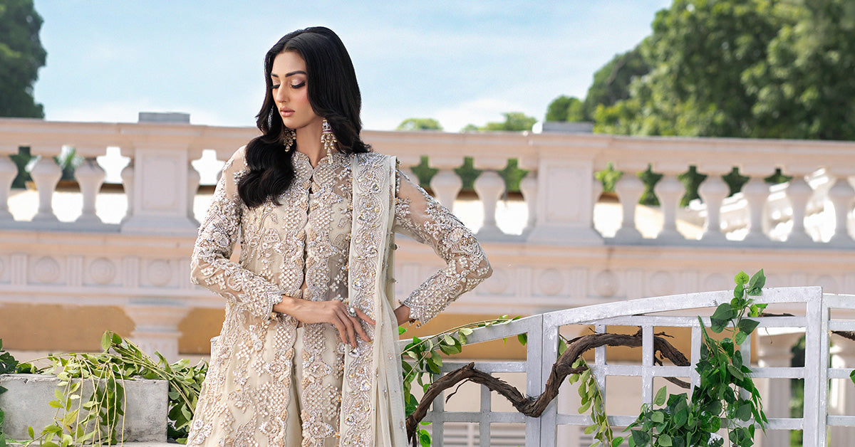 Artistry in Motion. This luxurious Sharara set is a celebration of traditional craft. Hand-embellished with exquisite precision, it features the richness of gotta work, dabka-naqshi, and light-catching details from scattered crystals and net florets. The bold presence of sheesha makes this a true statement piece.