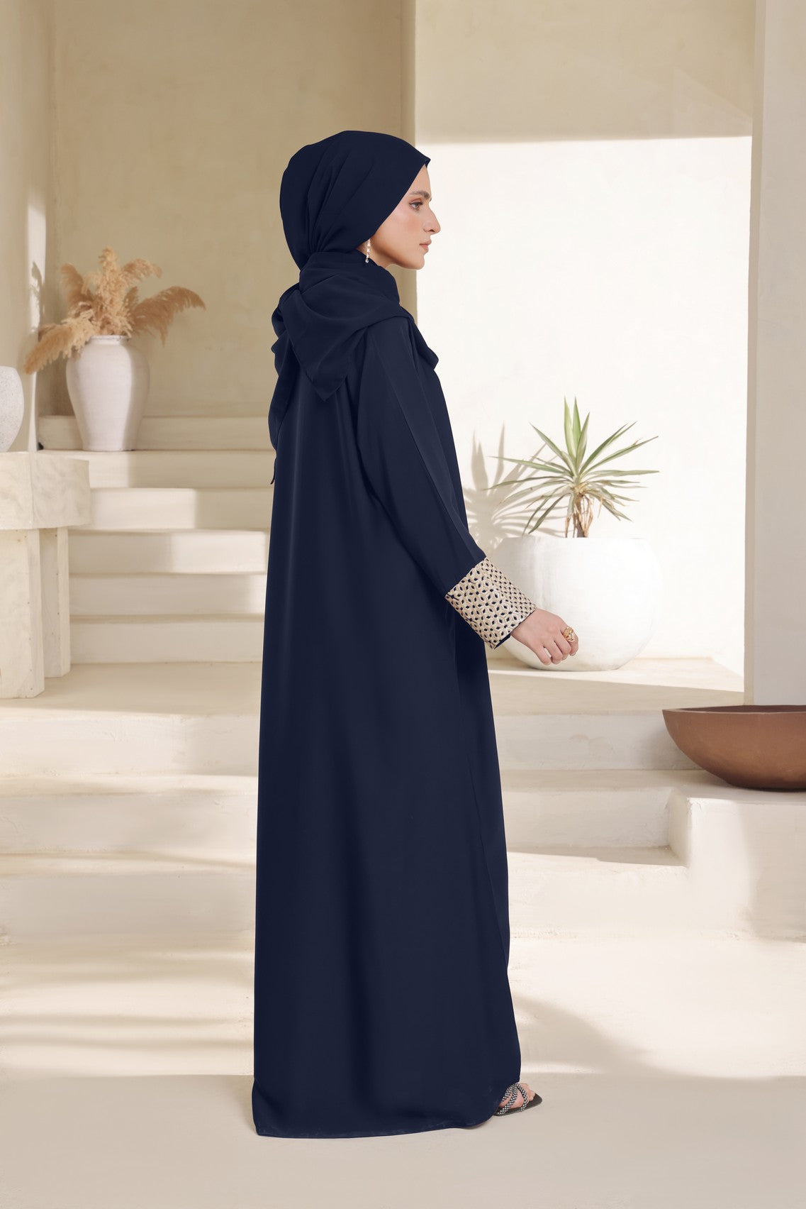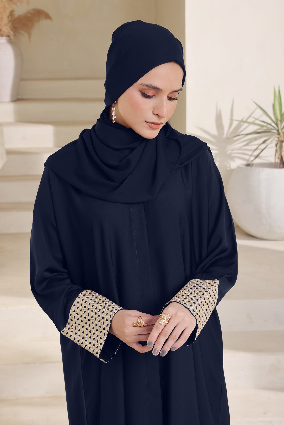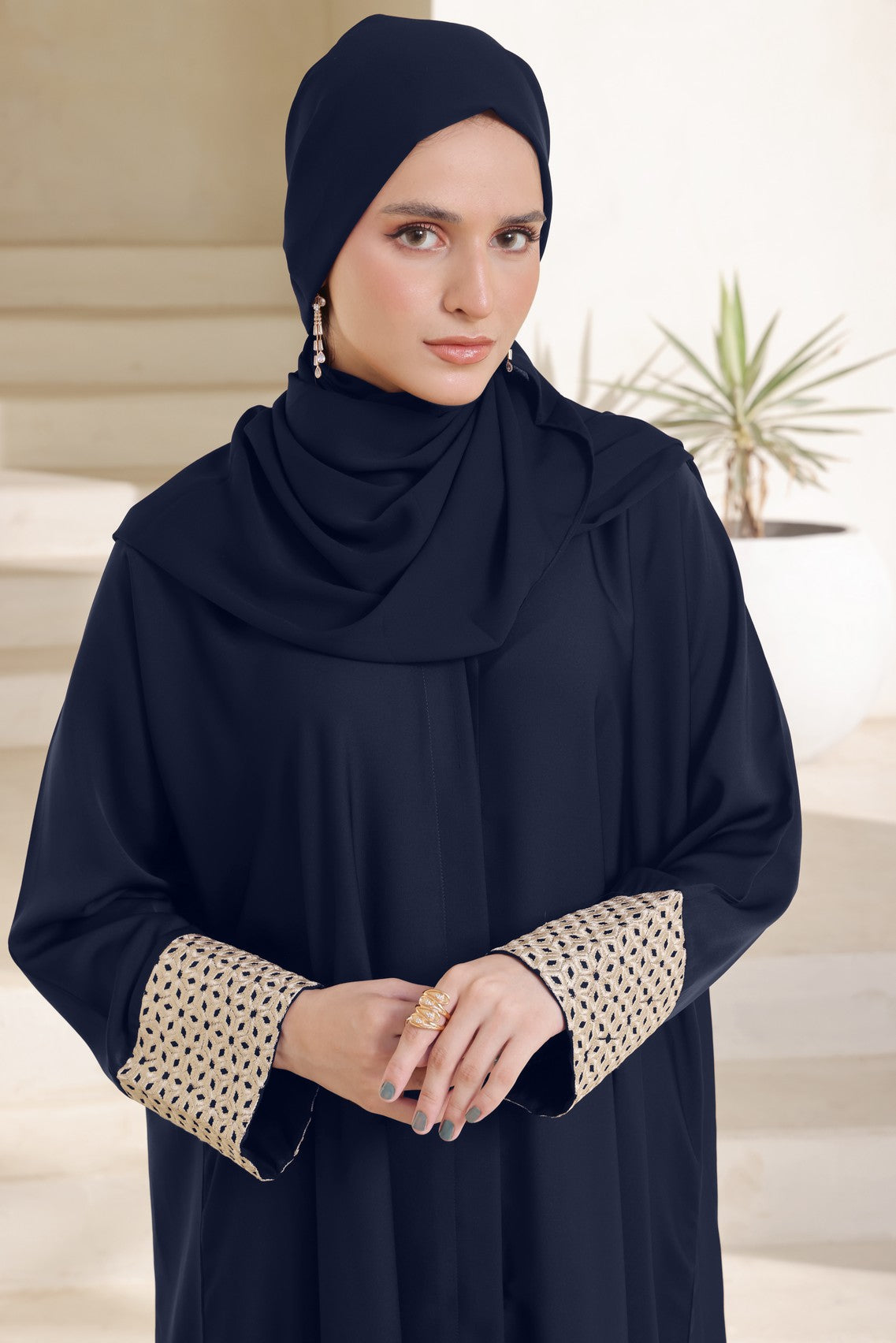 Rich, refined, and beautifully detailed — our Abaya is a timeless expression of grace. Designed in a deep blue hue, this front-open abaya features delicate embroidery on the sleeves and comes with a perfectly matching hijab, creating a seamless, elegant look.
