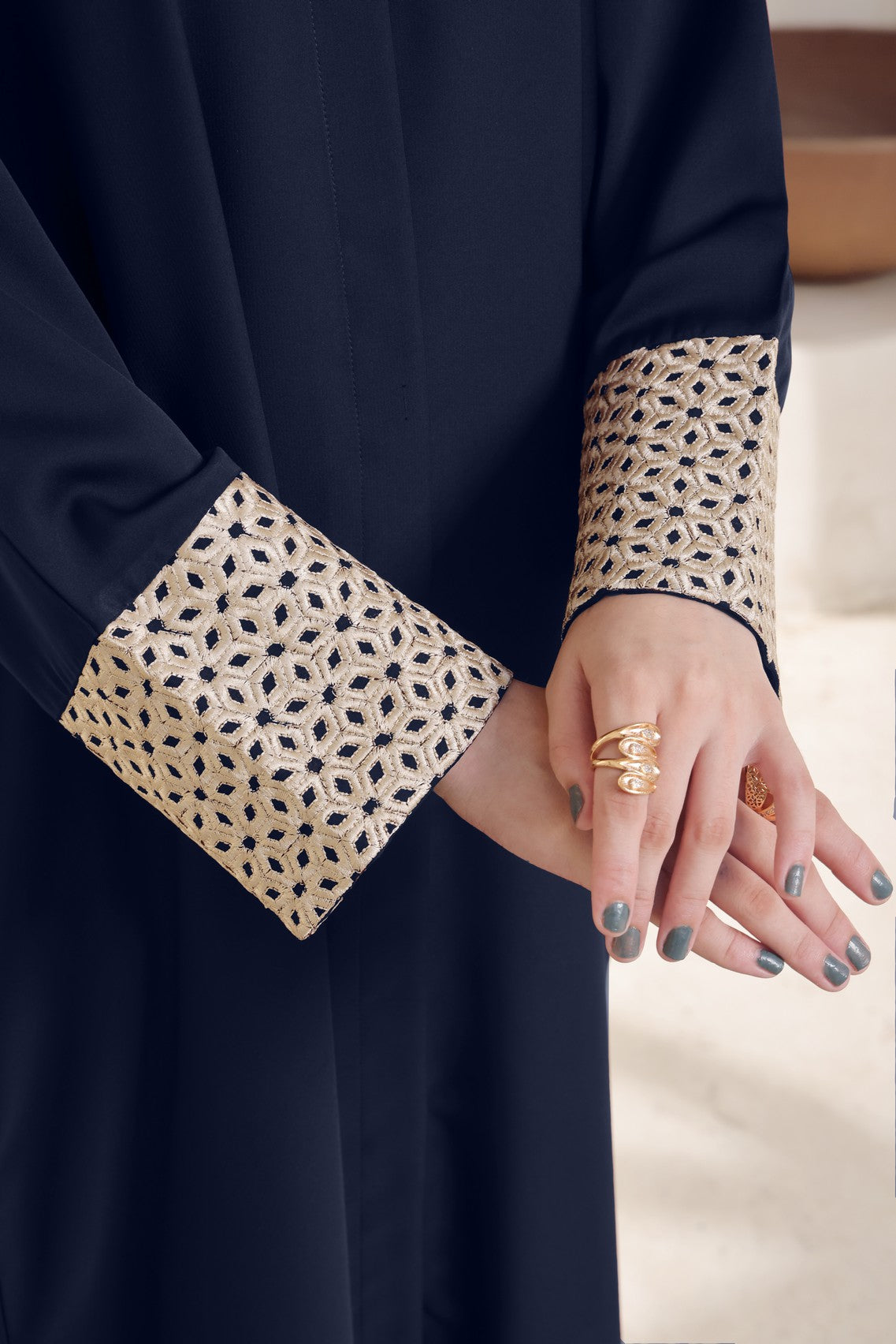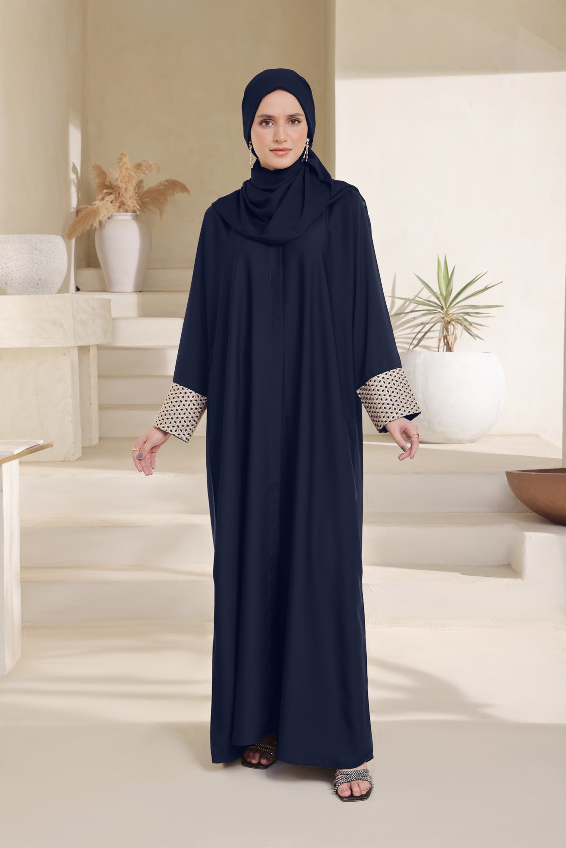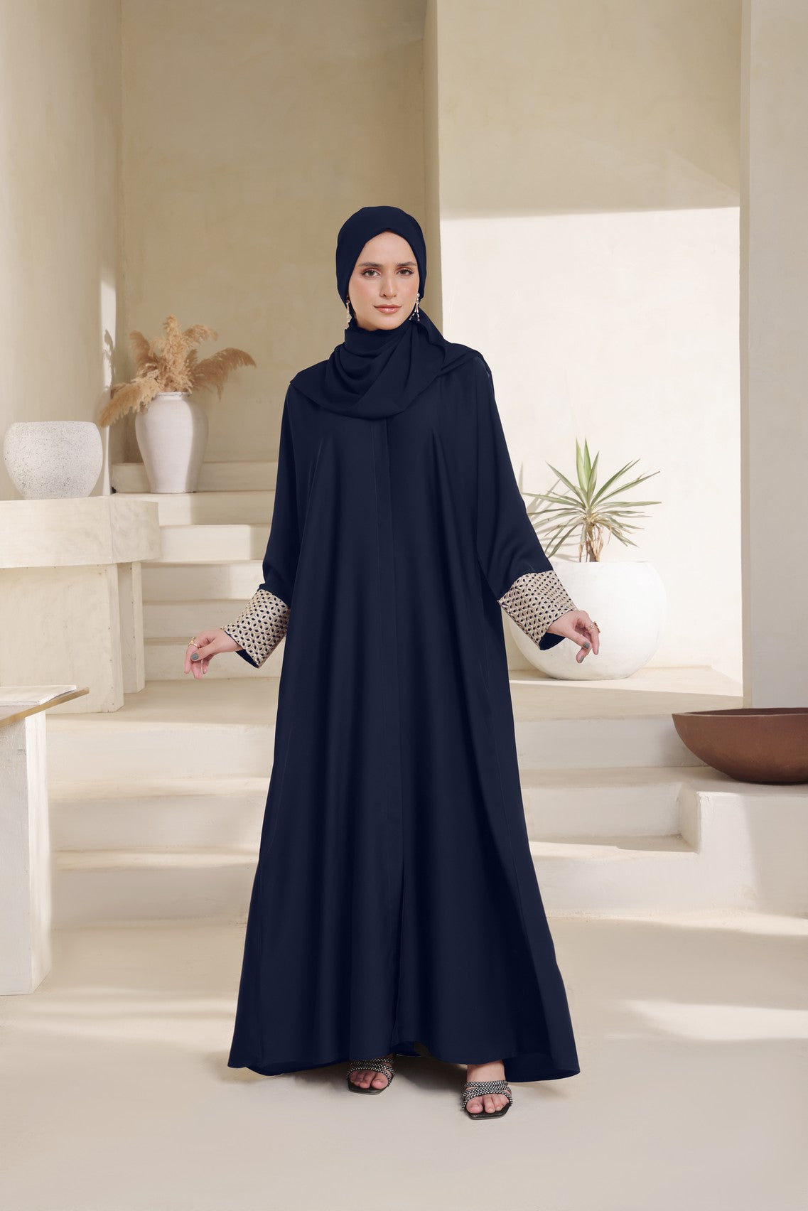 Rich, refined, and beautifully detailed — our Abaya is a timeless expression of grace. Designed in a deep blue hue, this front-open abaya features delicate embroidery on the sleeves and comes with a perfectly matching hijab, creating a seamless, elegant look.
