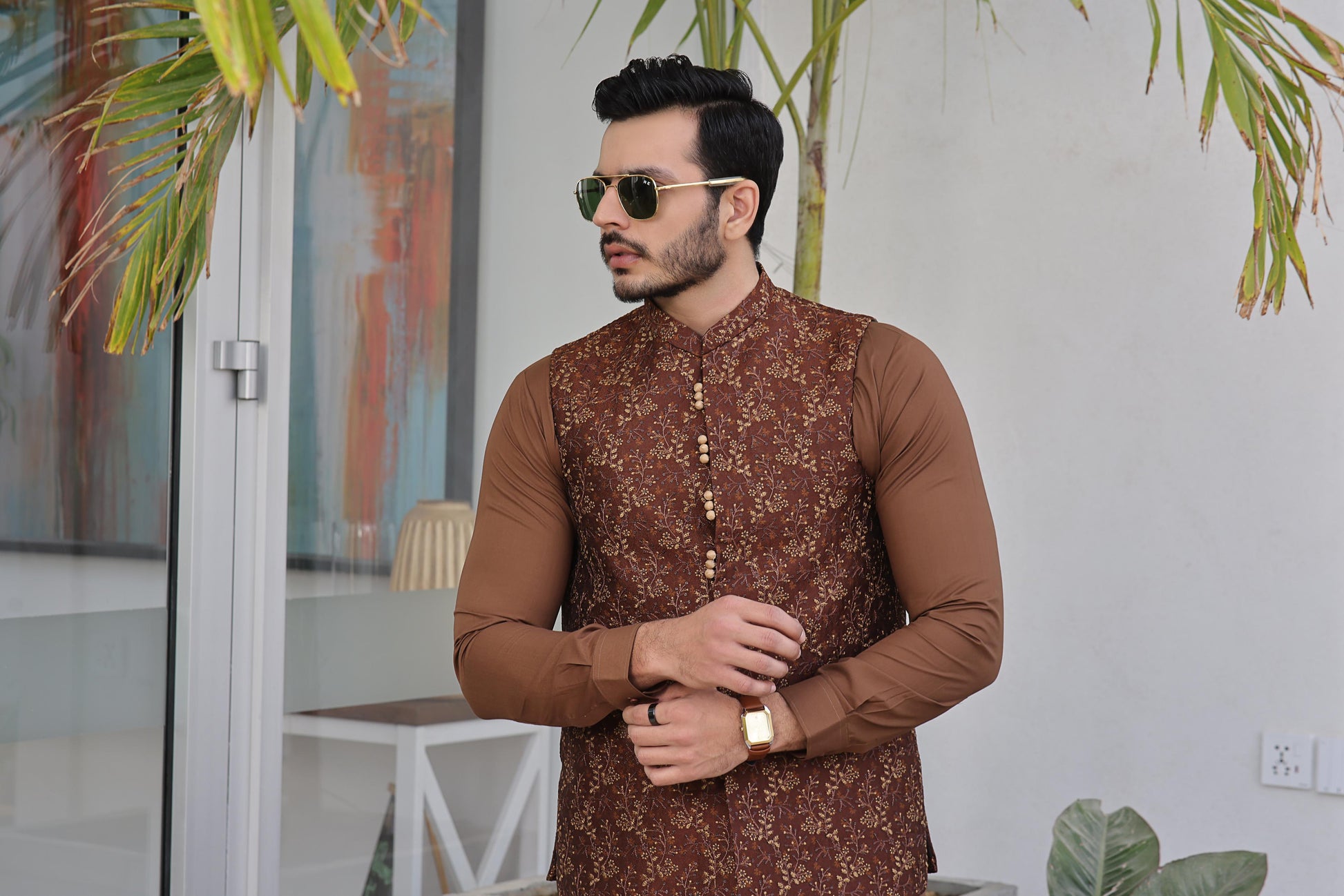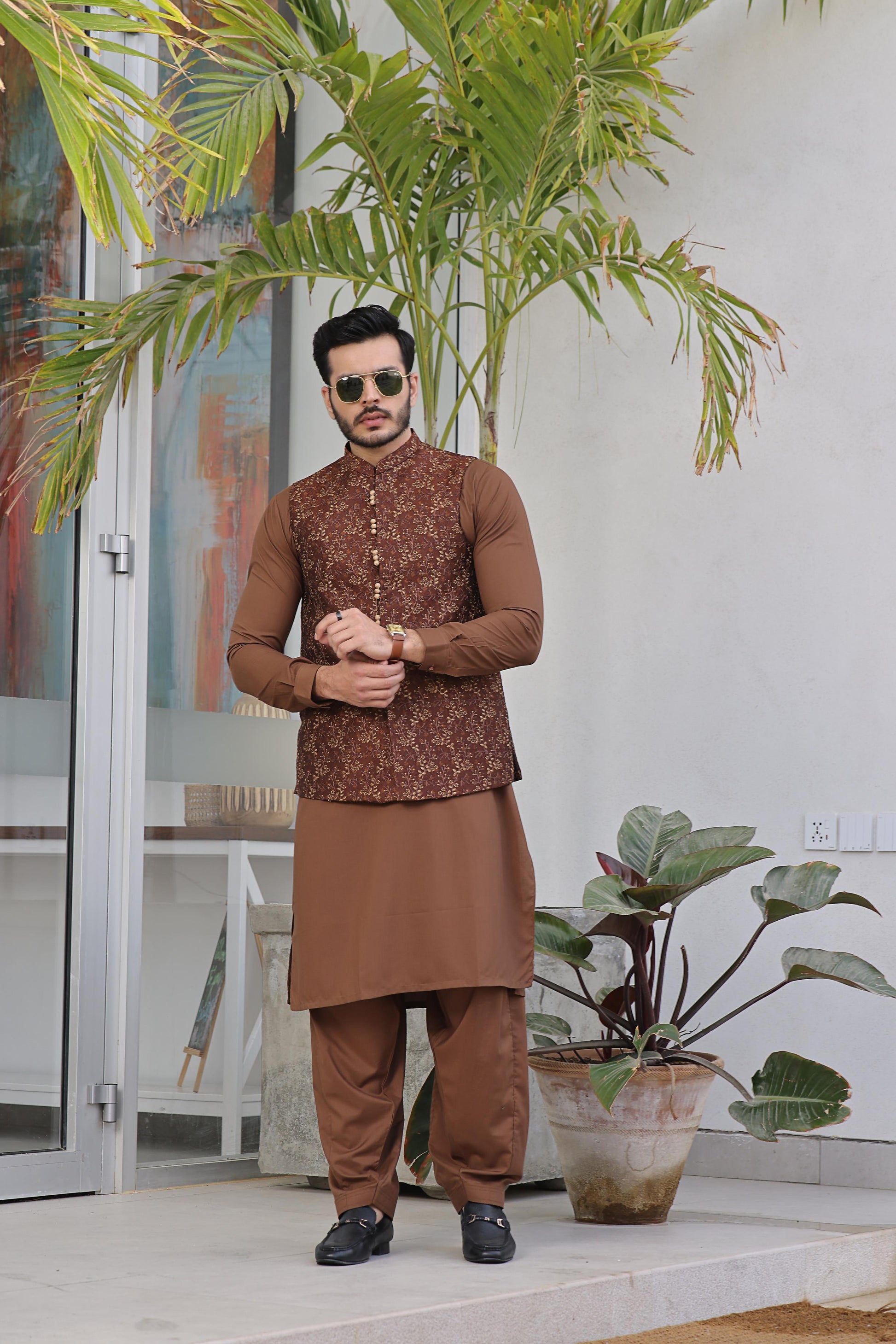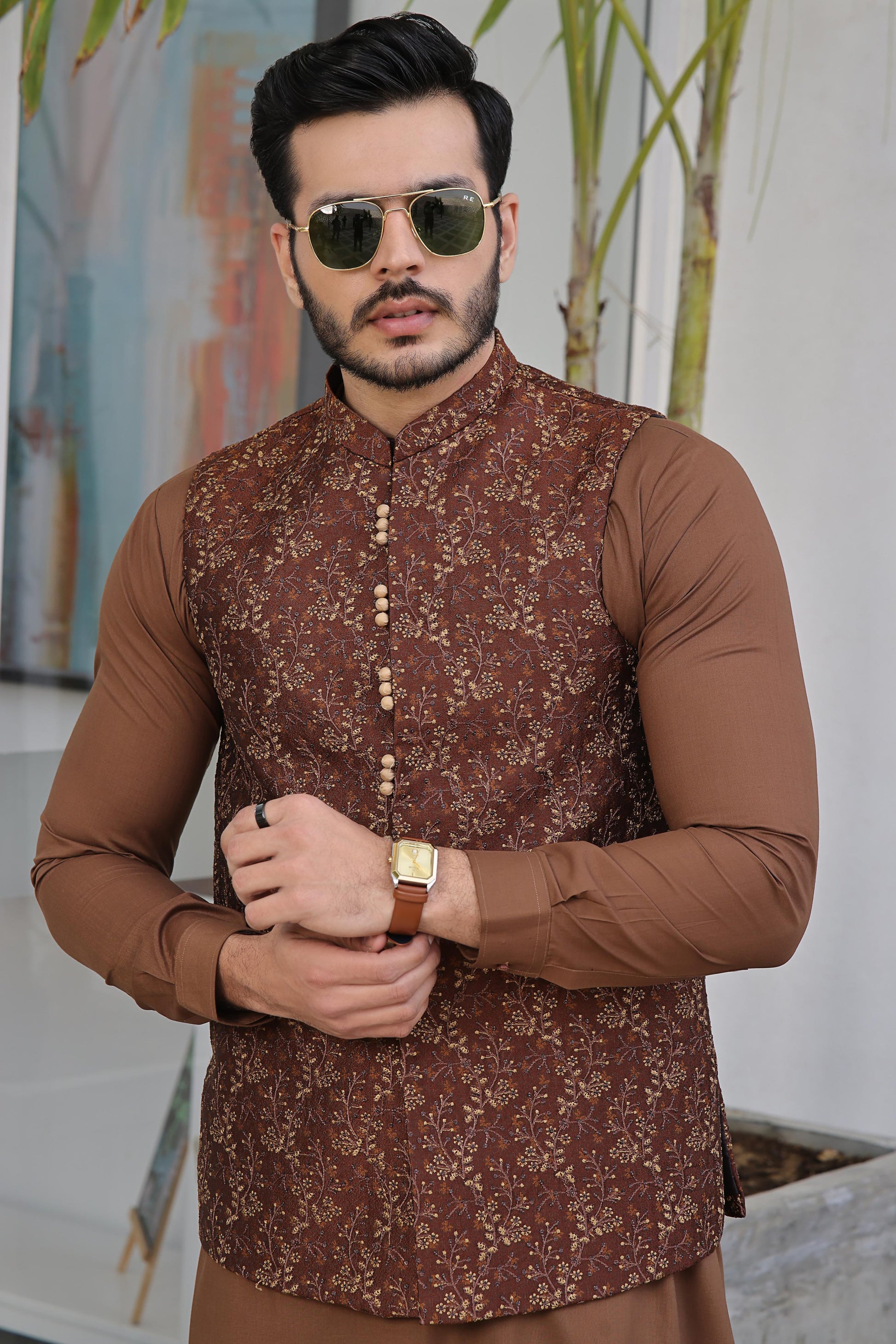 Men's Formal Jamawar Waistcoat with Computer Embroidery