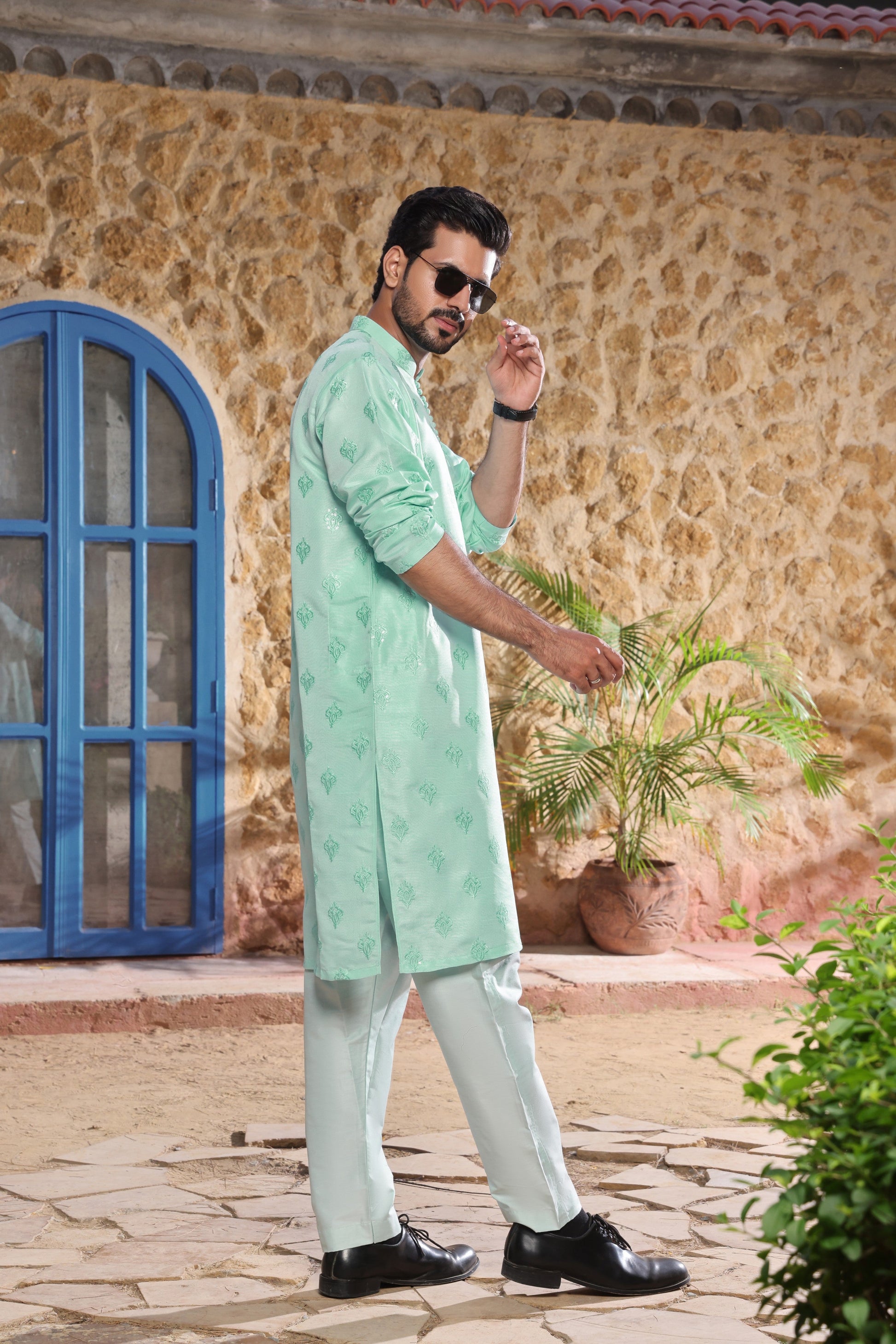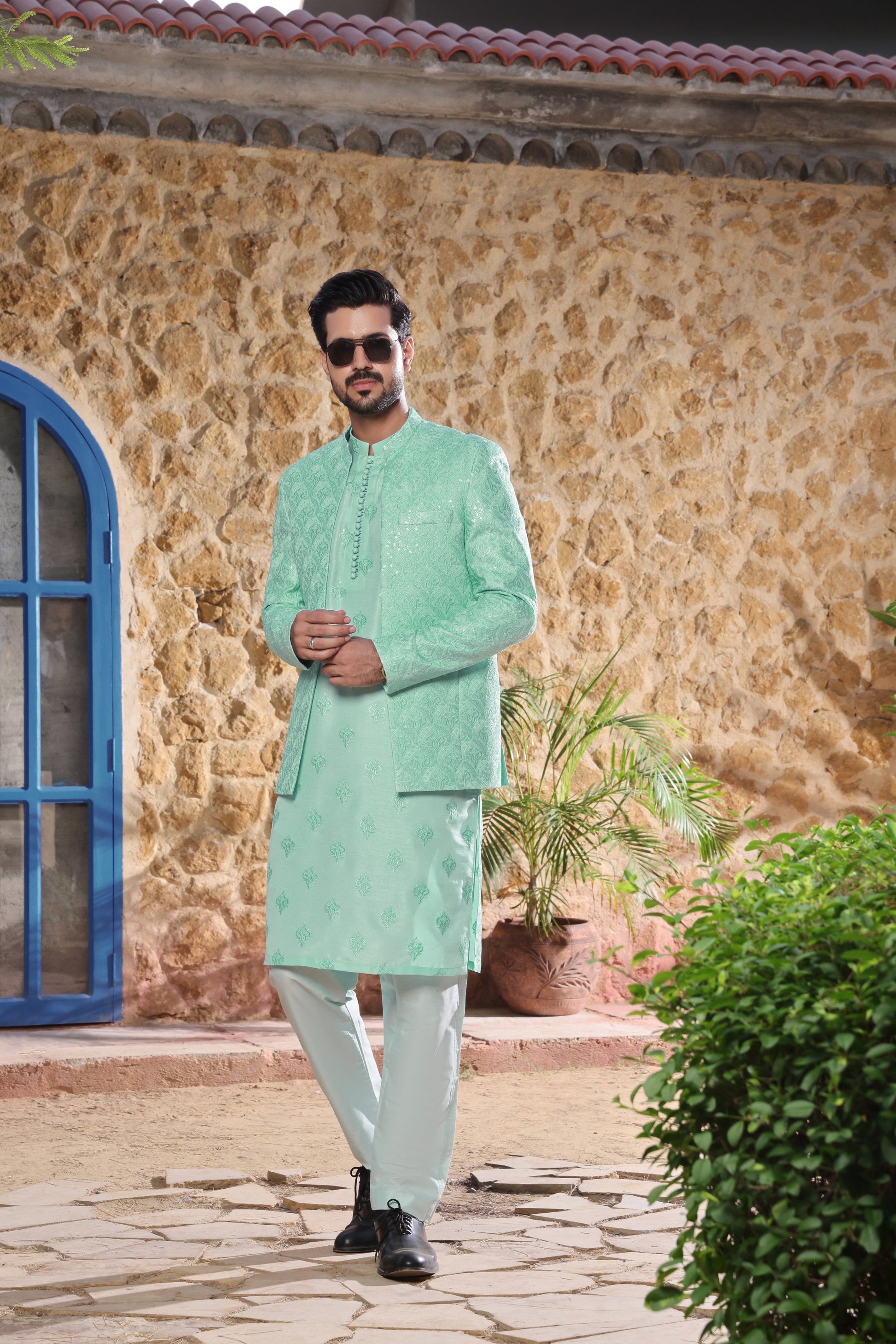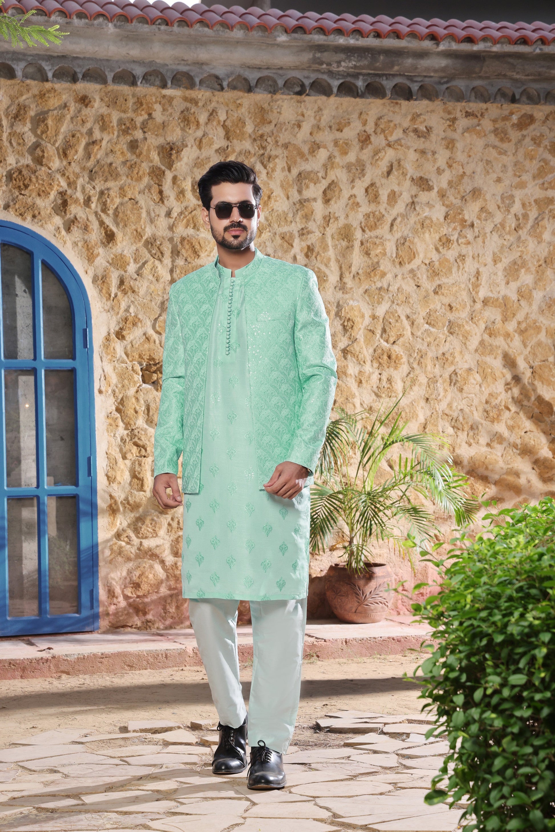 Men's Formal Prince Coat on Raw Silk Fabric with Computer Embroidery and sequence with Fancy Kurta Pyjama