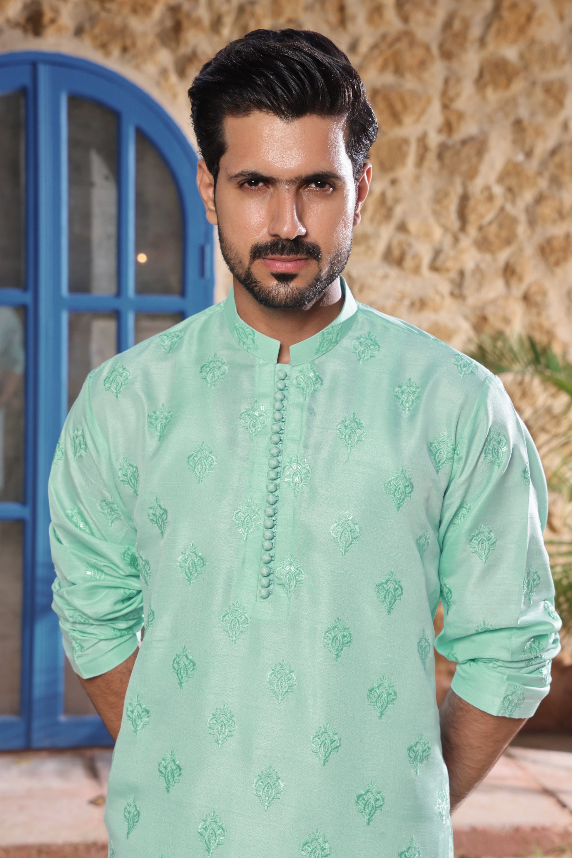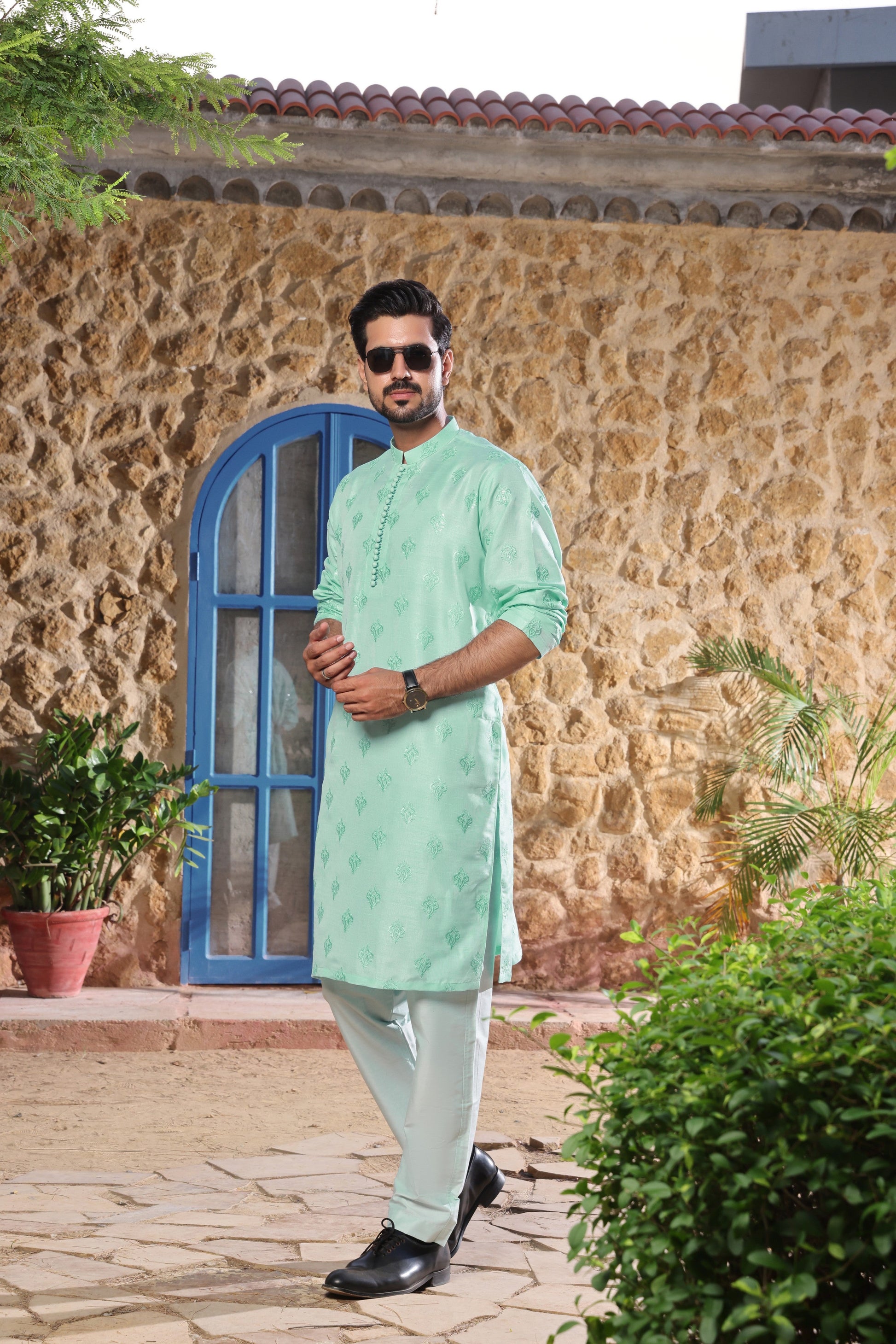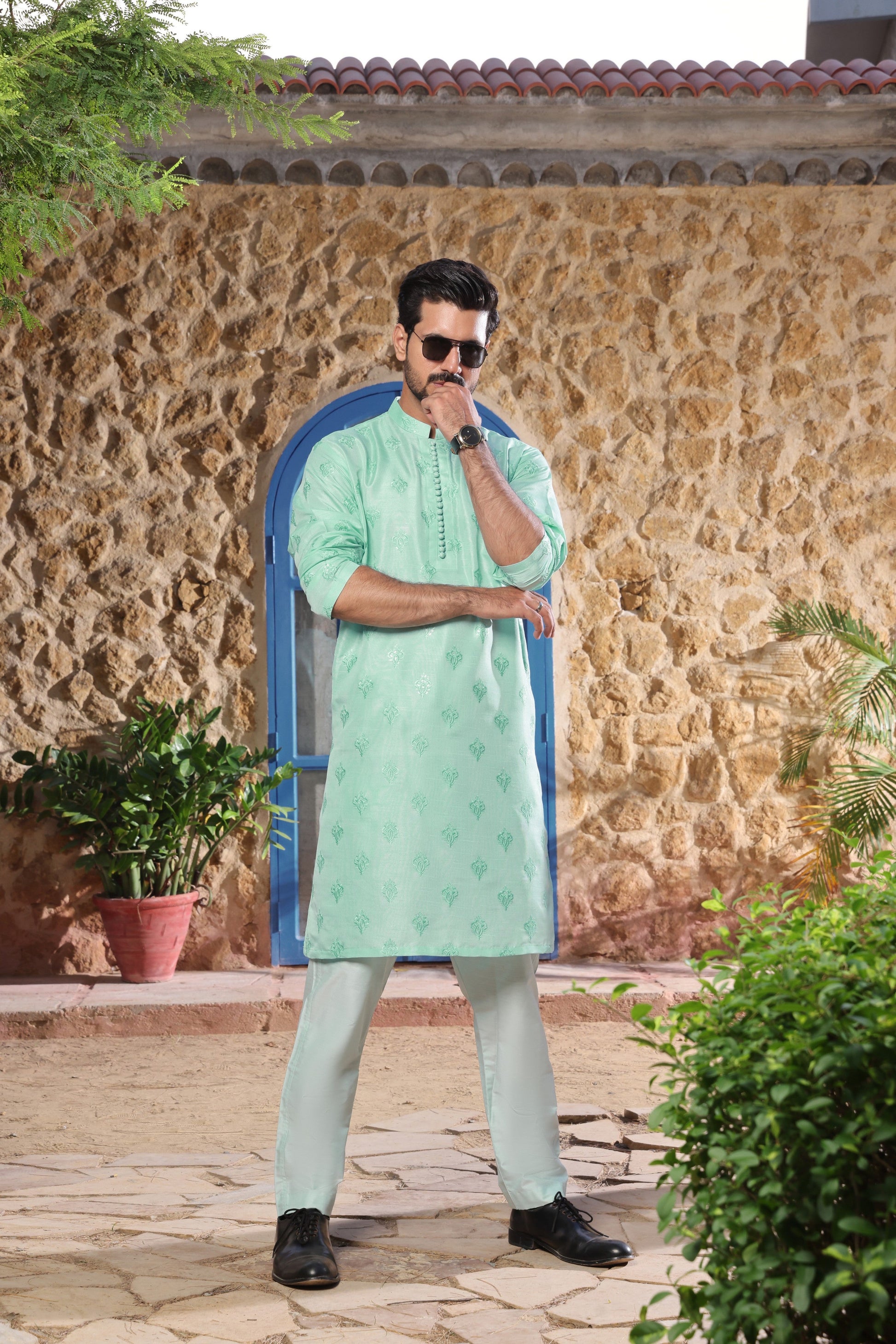 Men's Formal Prince Coat on Raw Silk Fabric with Computer Embroidery and sequence with Fancy Kurta Pyjama