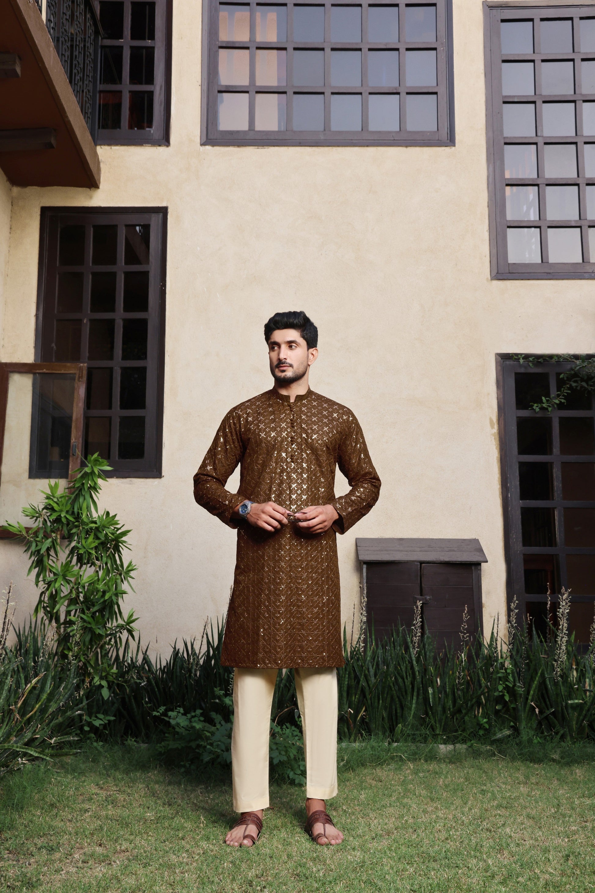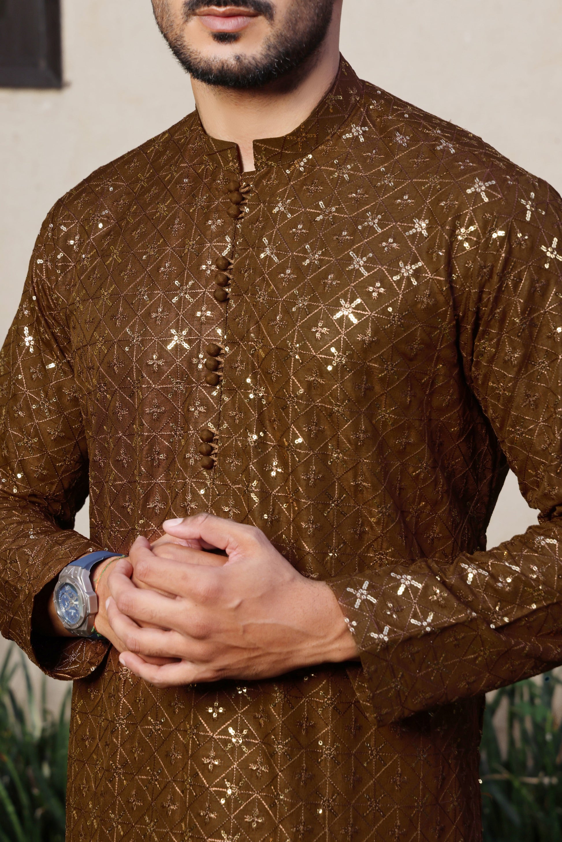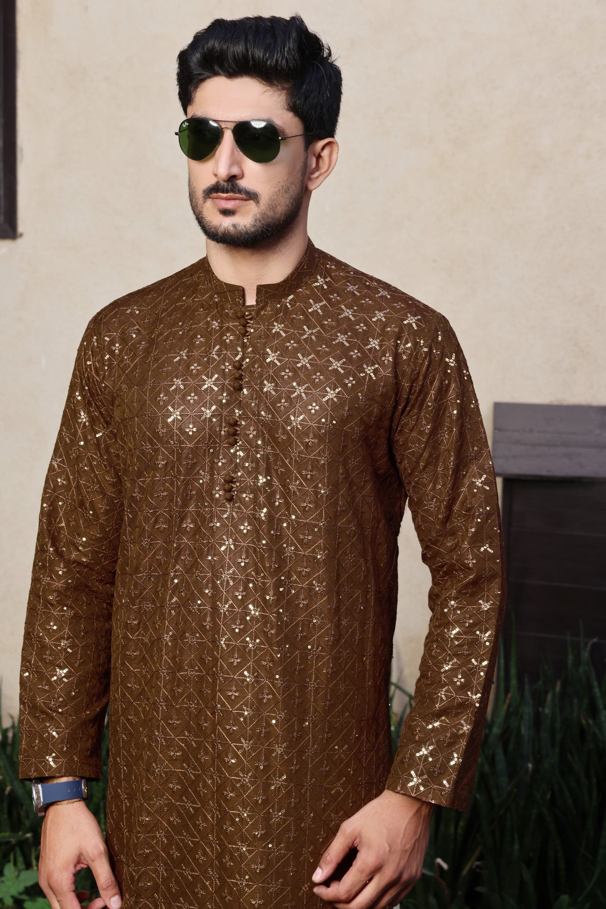 Men's Formal Prince Coat on Raw Silk Fabric with Computer Embroidery and sequence with Fancy Kurta Pyjama