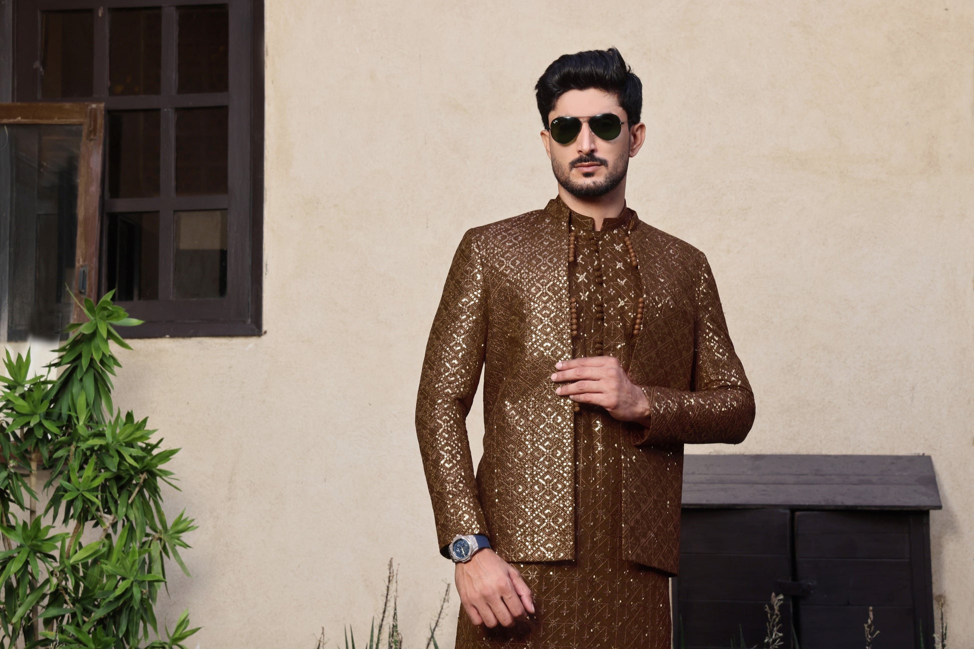 Men's Formal Prince Coat on Raw Silk Fabric with Computer Embroidery