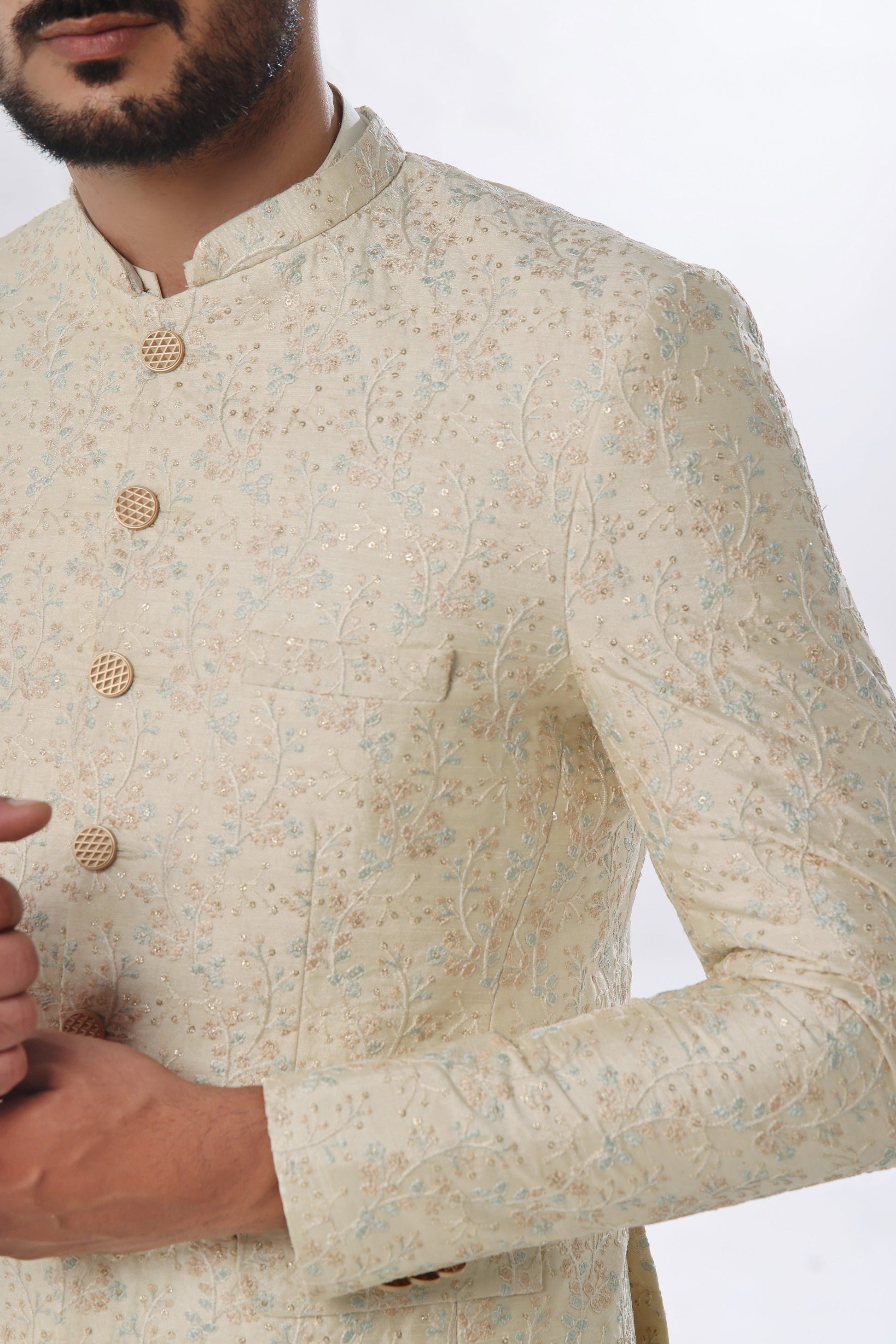 Men's Formal Prince Coat on Jamawar Fabric with Computer Embroidery