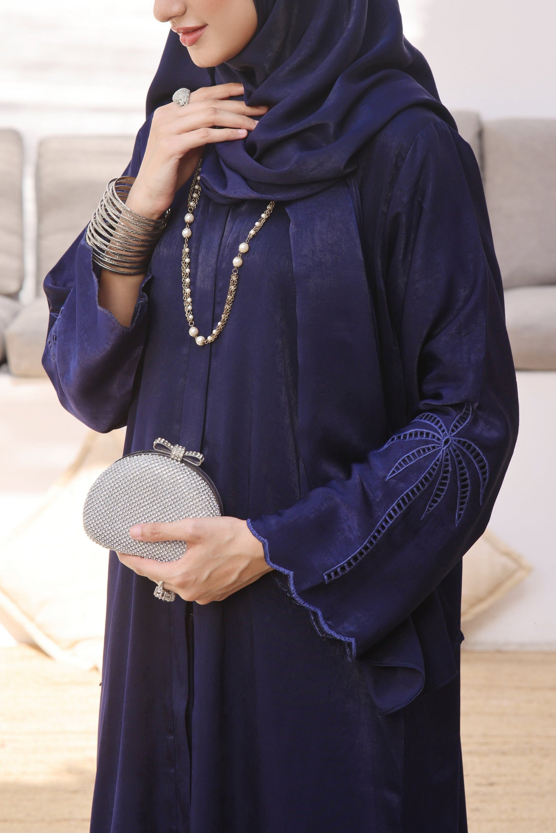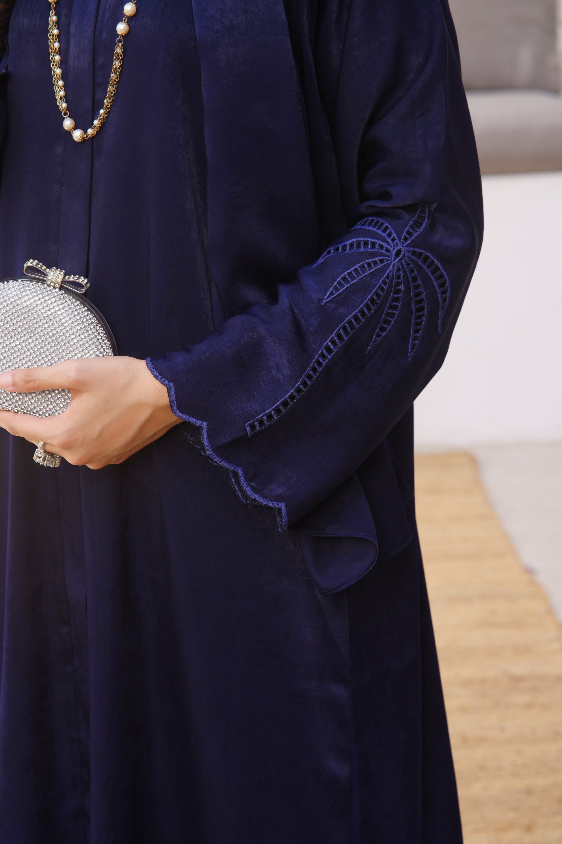 Details: The lace palm tree design is thoughtfully placed to create a visually appealing focal point, while subtle embroidery along the edges adds a refined finish. The abaya features a front open design with a matching inner lining for added modesty and comfort.