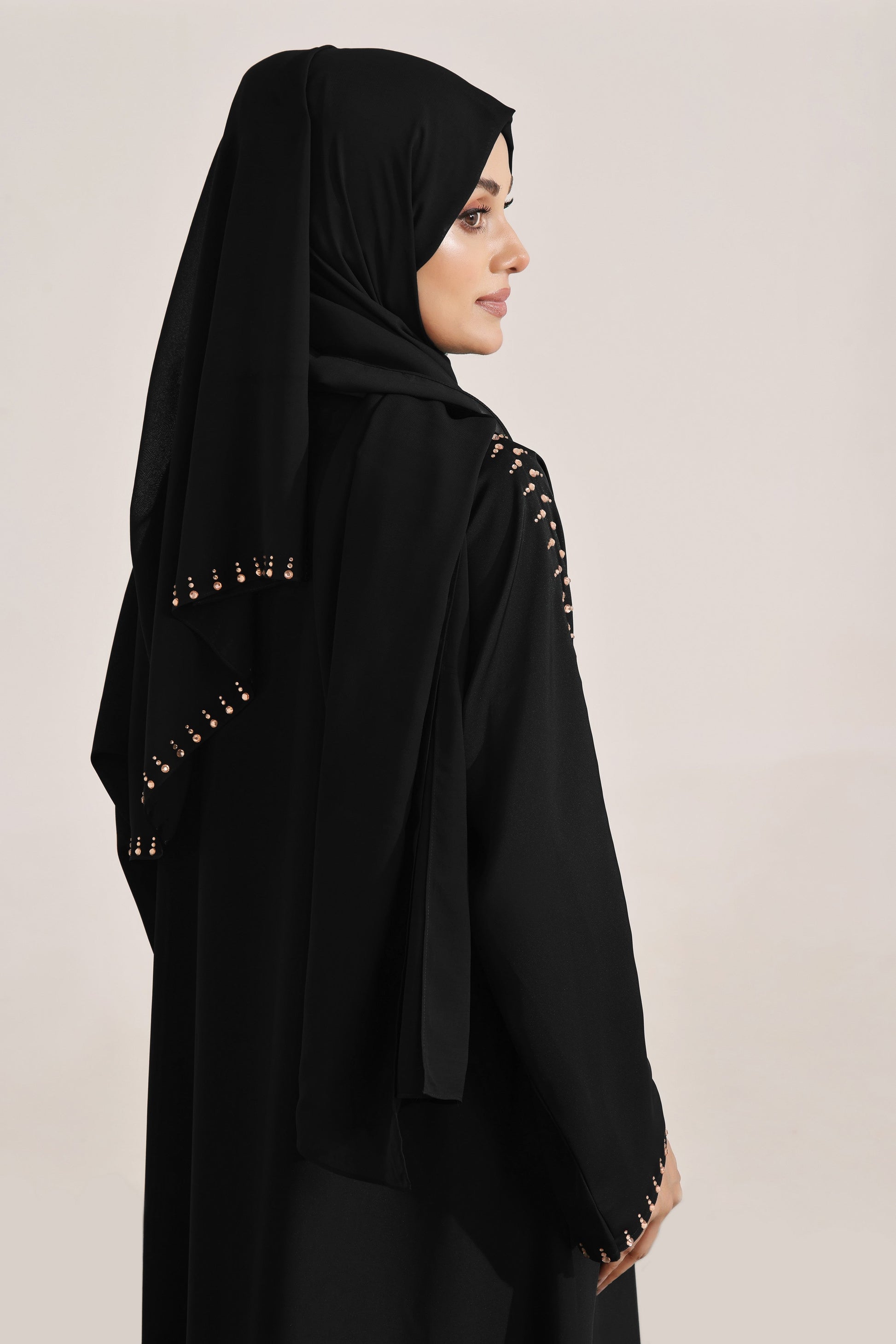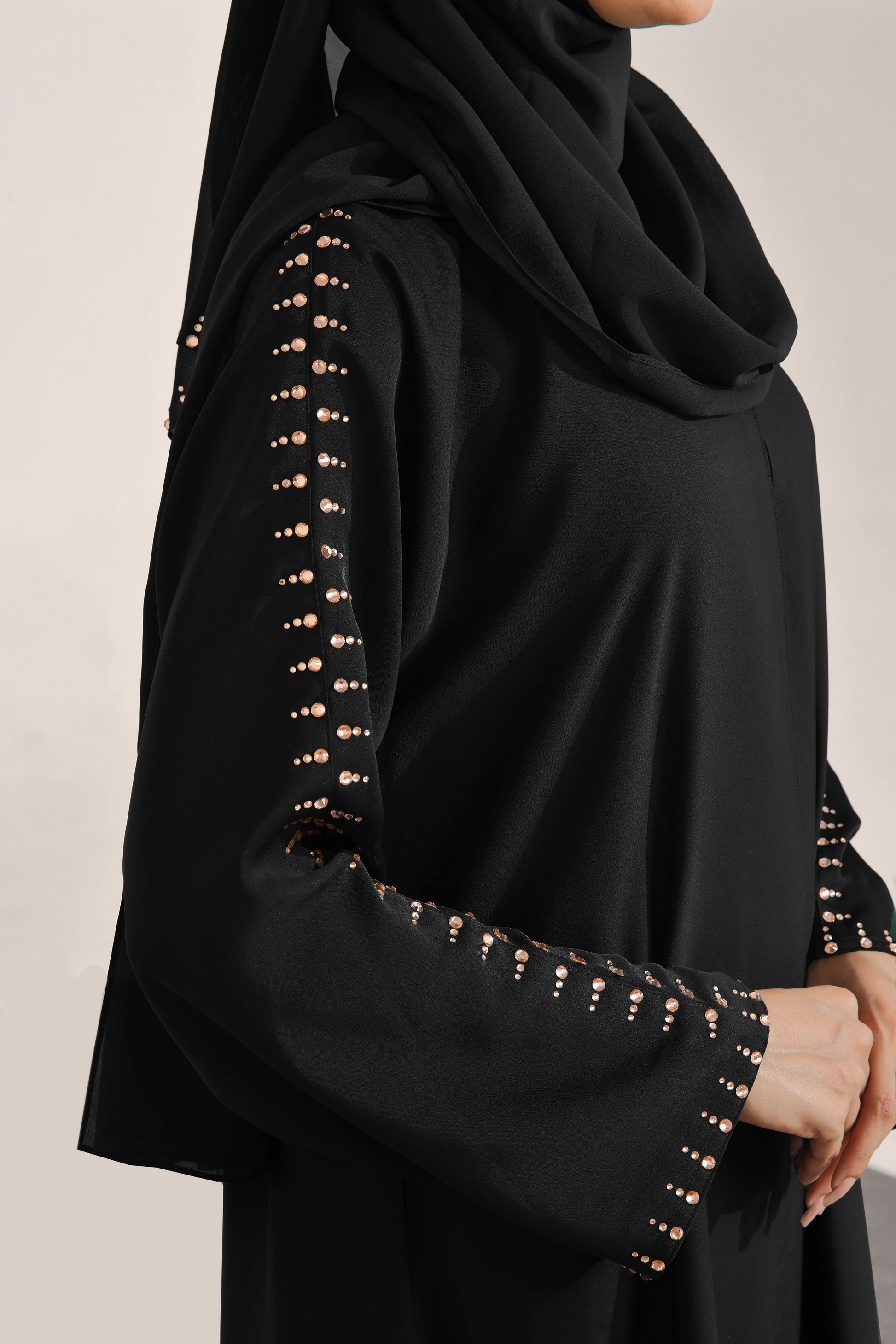 Totally outstanding our front open style with stone work on complete sleeves makes it ultimate class of fashion, flowy look adding a more dreamy modest attire, constructed on pure Luxe Nidha fabric comes along with pure Imported chiffon Sheila, which is easy to go