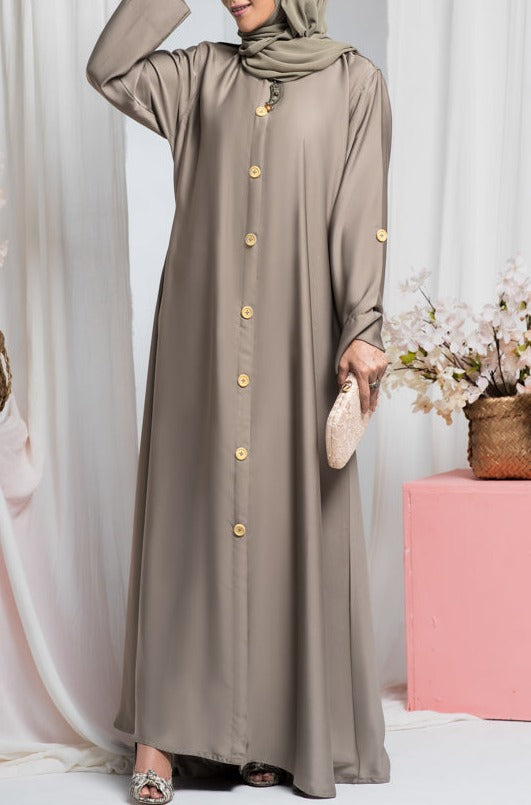 Featuring luxury at its best with our latest front open style which is stylish and elegant button abaya design you will get compliments wherever you go with this stylish look which comes along with pure Korean Chiffon Sheila