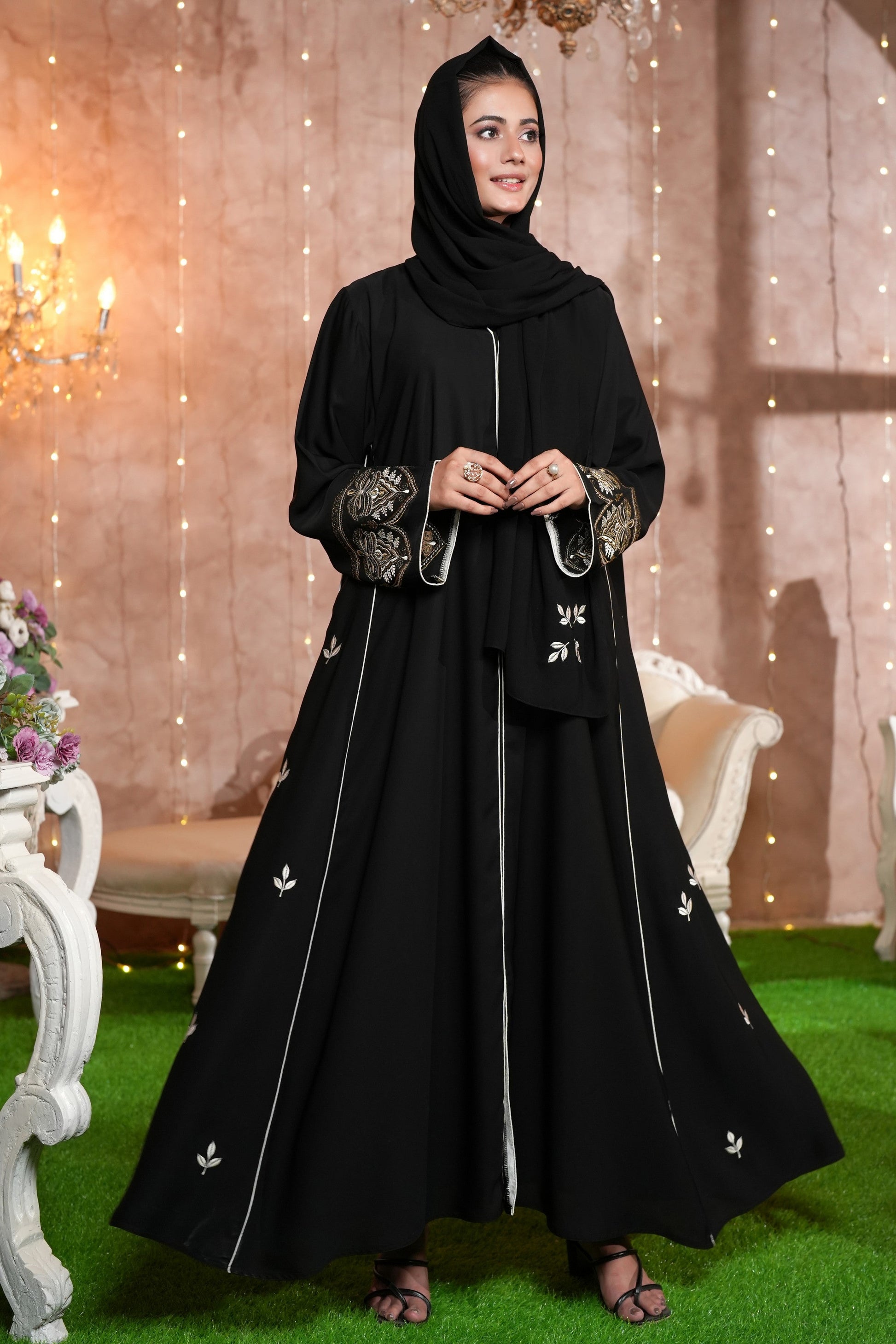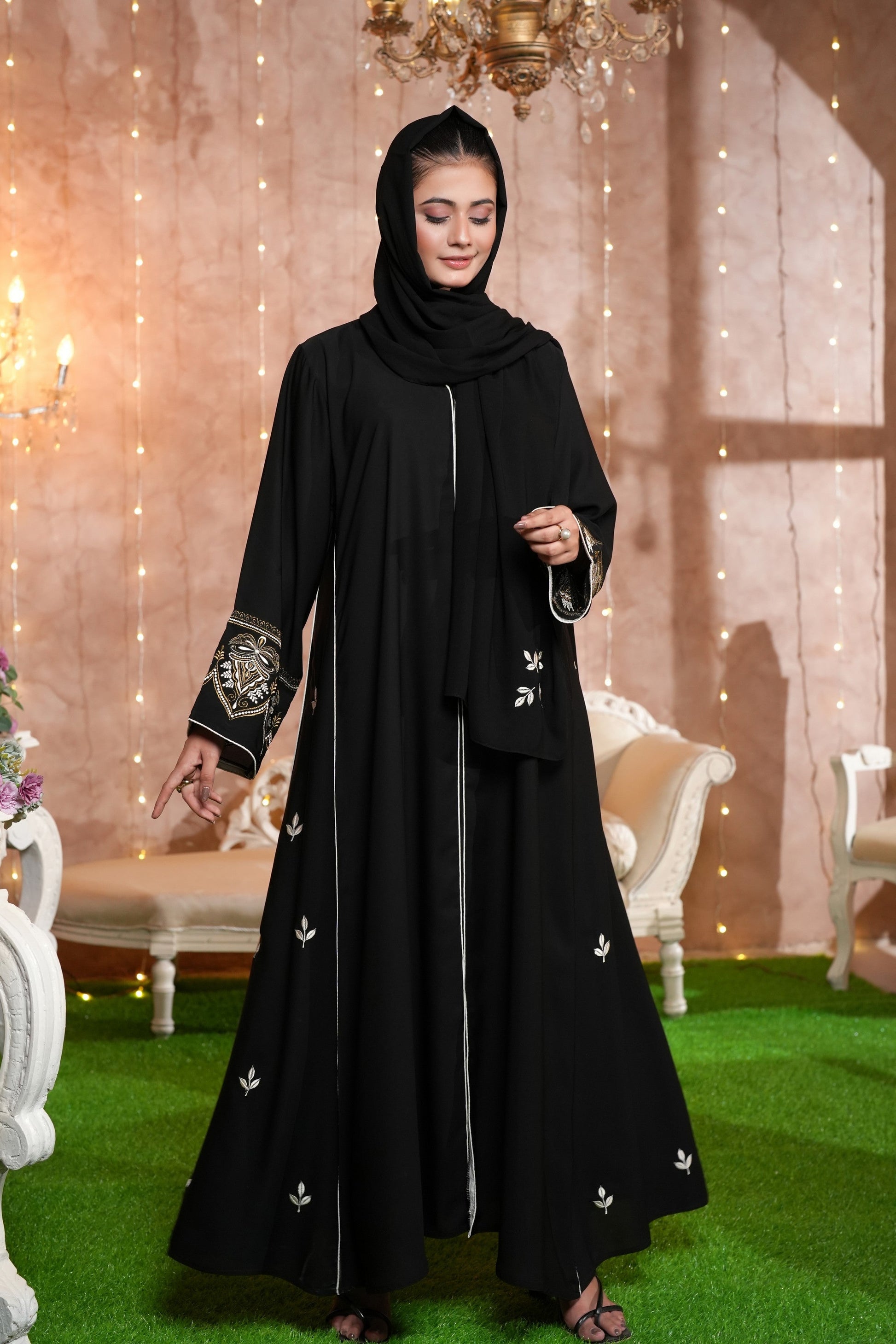 Command elegance with a stunning front-open design crafted from luxurious Nidha fabric in classic black. This masterpiece features heavy, intricate embroidery on the sleeves and side panels, creating a look that is rich in detail and graceful in movement. Finished with refined piping on the front and a matching hijab, it’s the perfect choice for elevated occasions and everyday sophistication.