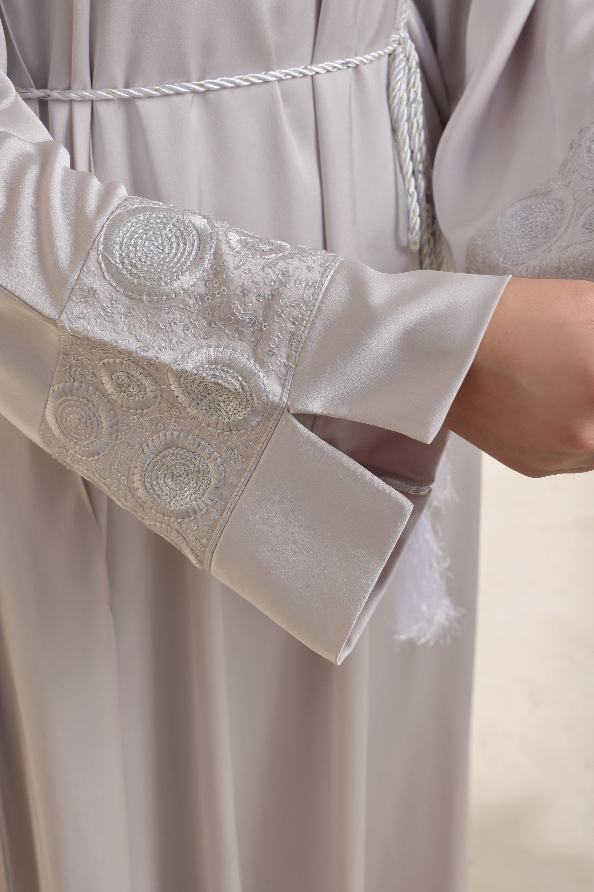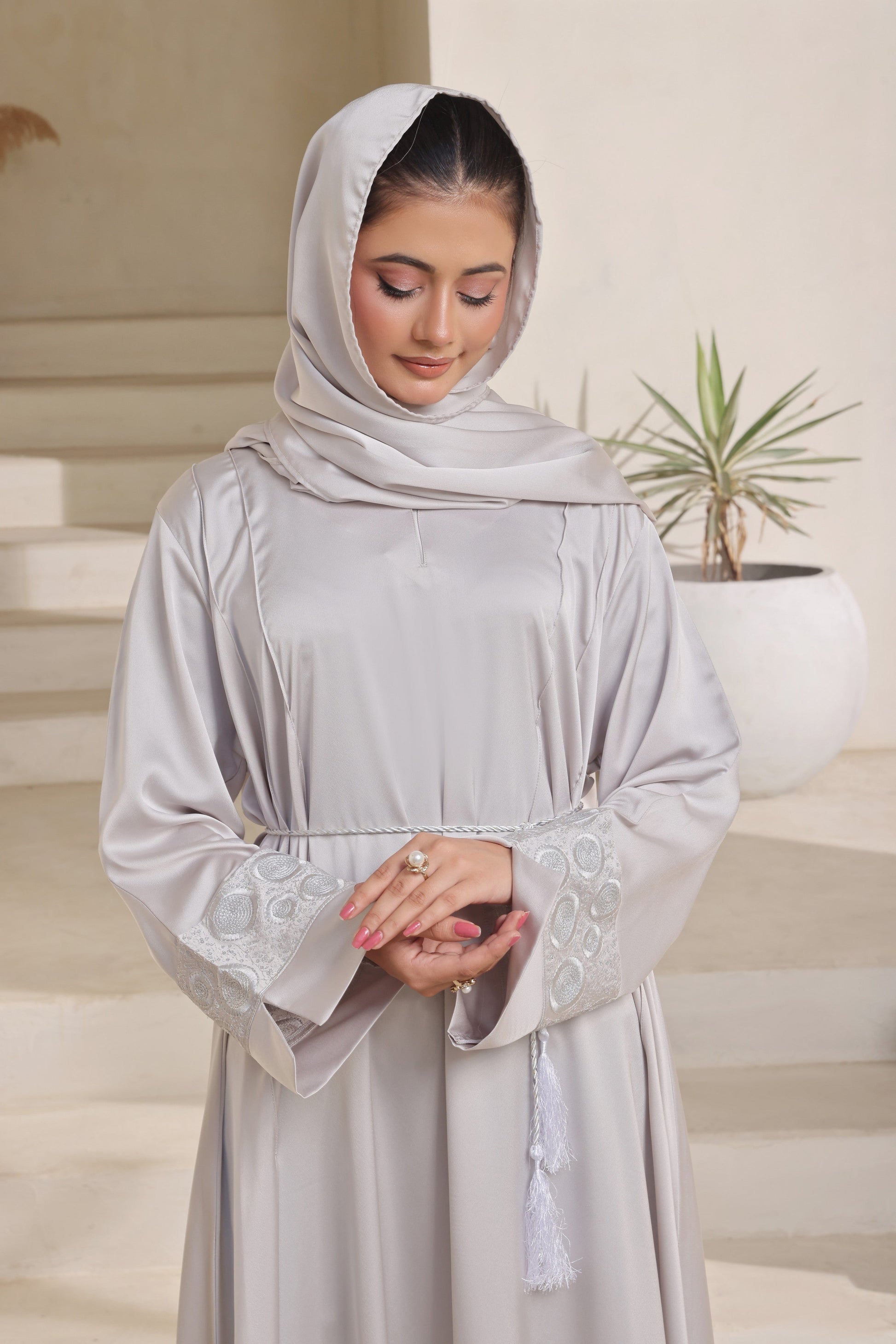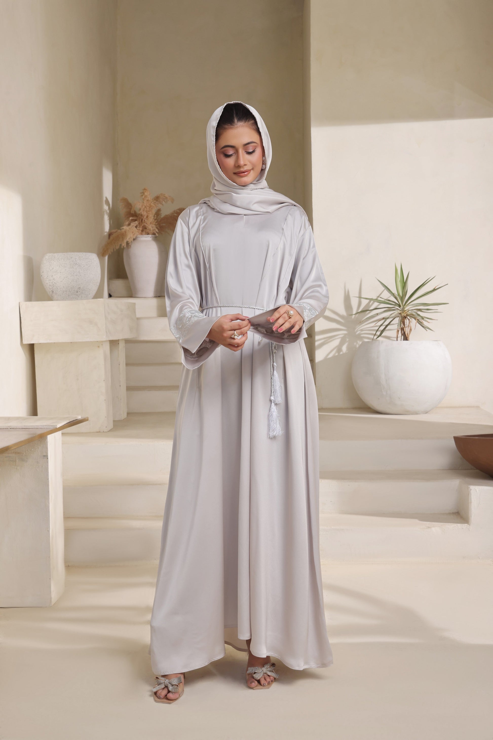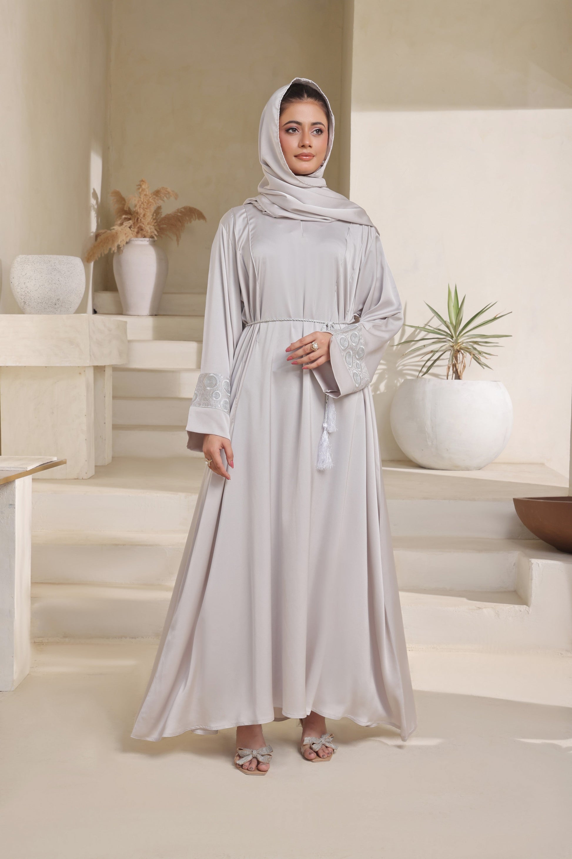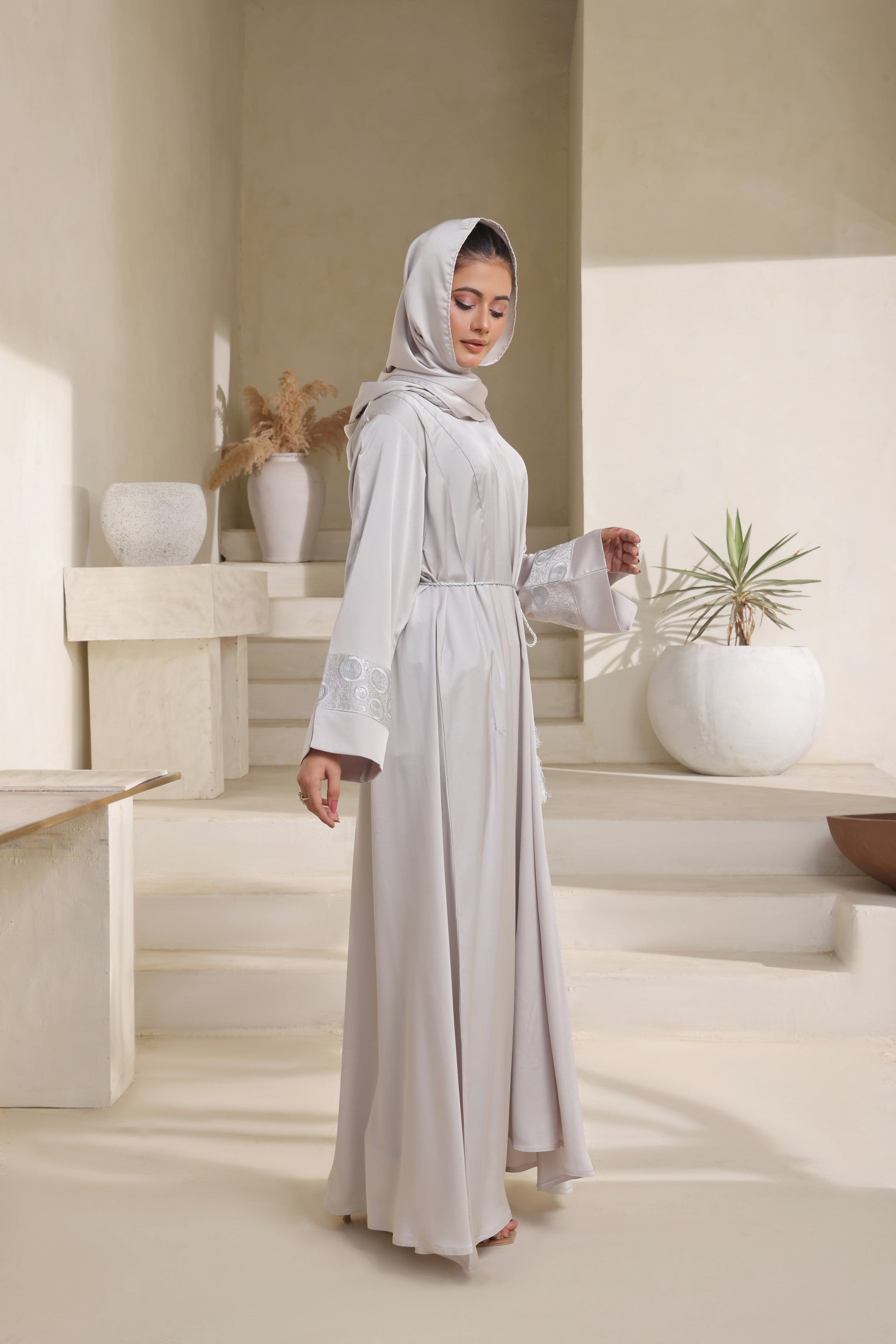 Designed in luxurious Nidha fabric with warm detailing, this abaya brings together modern structure and delicate femininity for an effortlessly refined look.