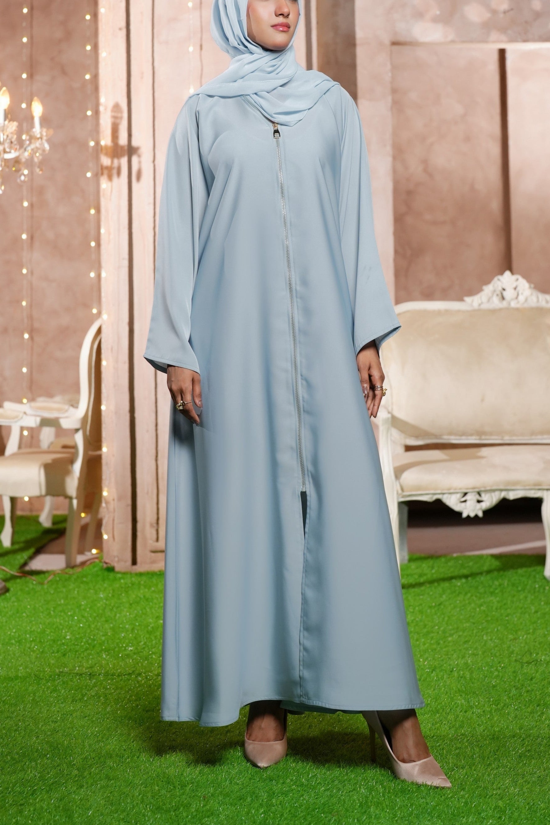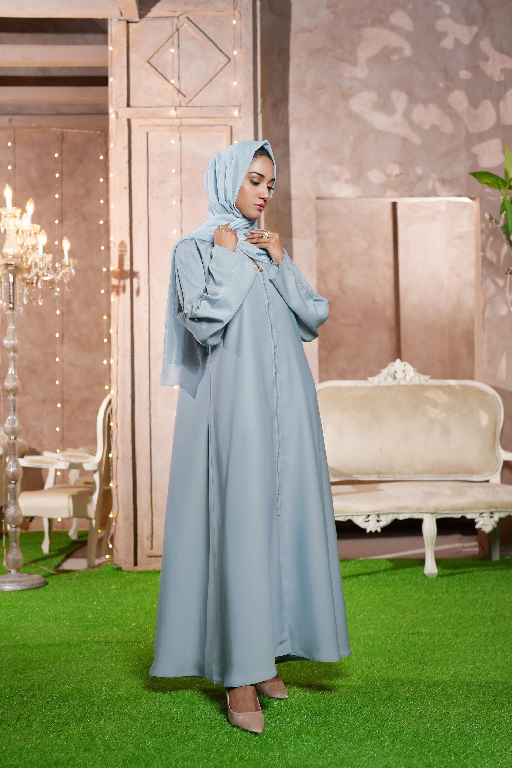 Cool, modern, and effortlessly graceful Abaya which brings together contemporary design and timeless modesty. Made from premium Nidha fabric, this front-open abaya features a sleek zip closure for everyday ease and a polished finish. The serene ice blue hue adds a refreshing elegance, perfectly paired with a matching hijab for a cohesive and graceful look.