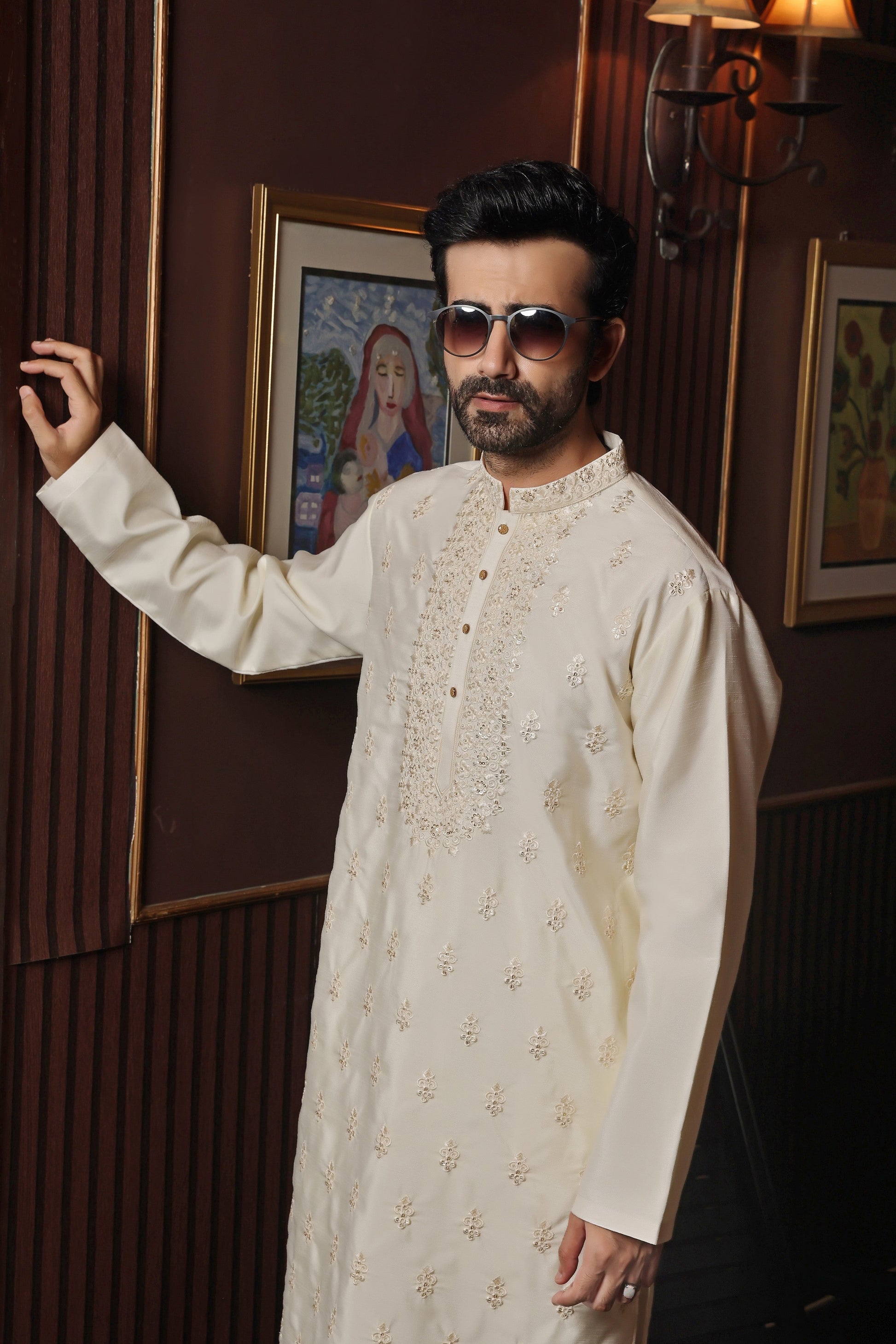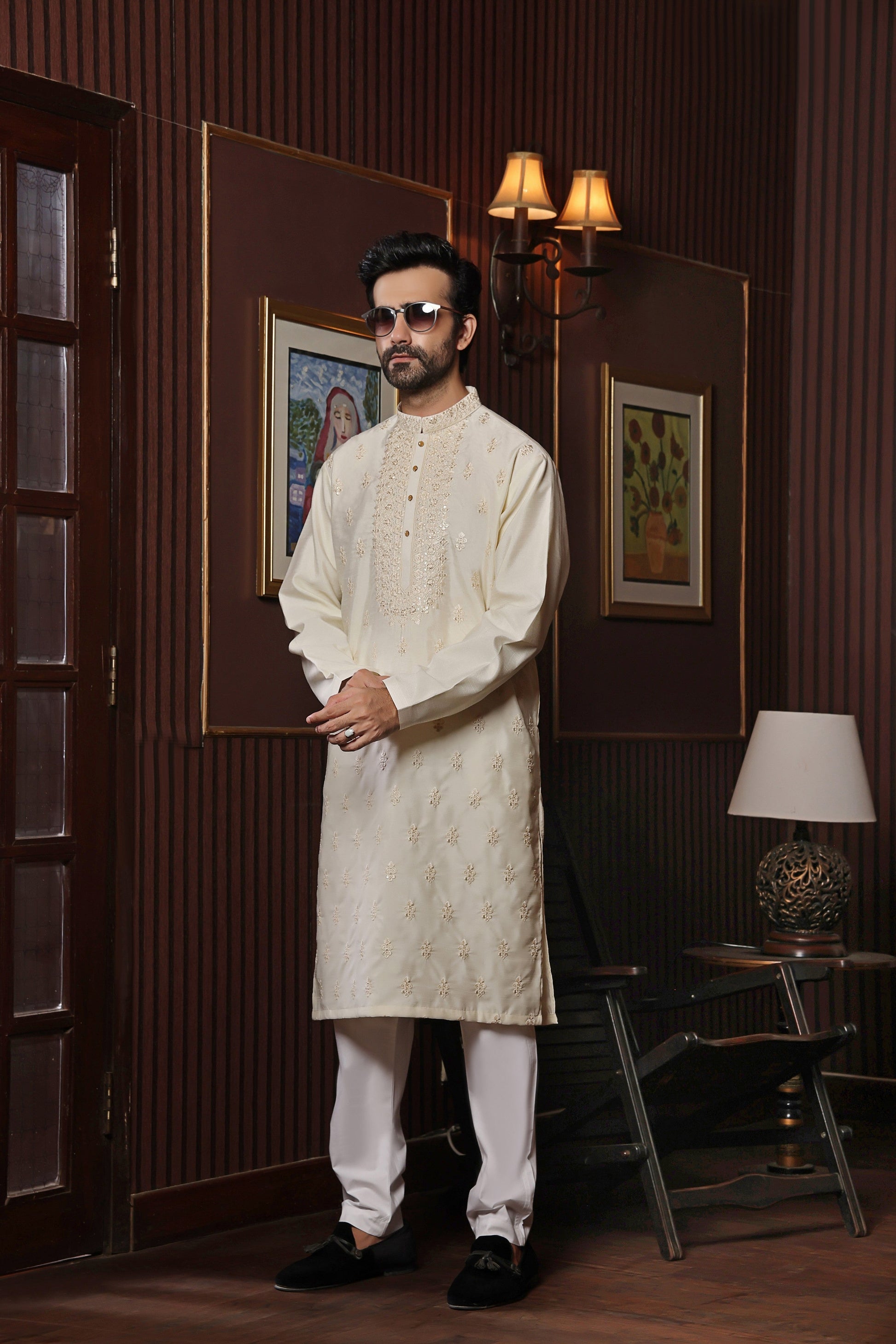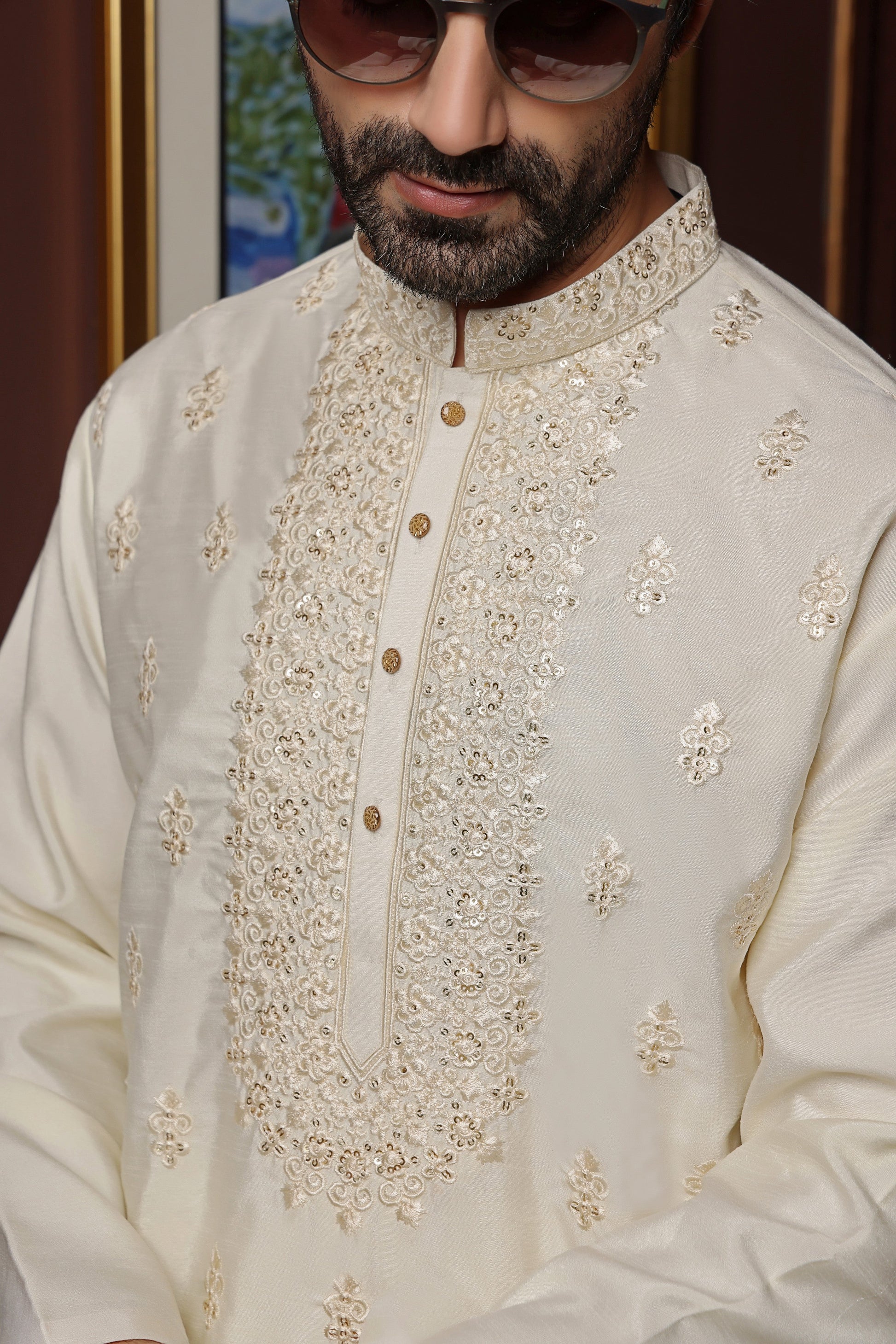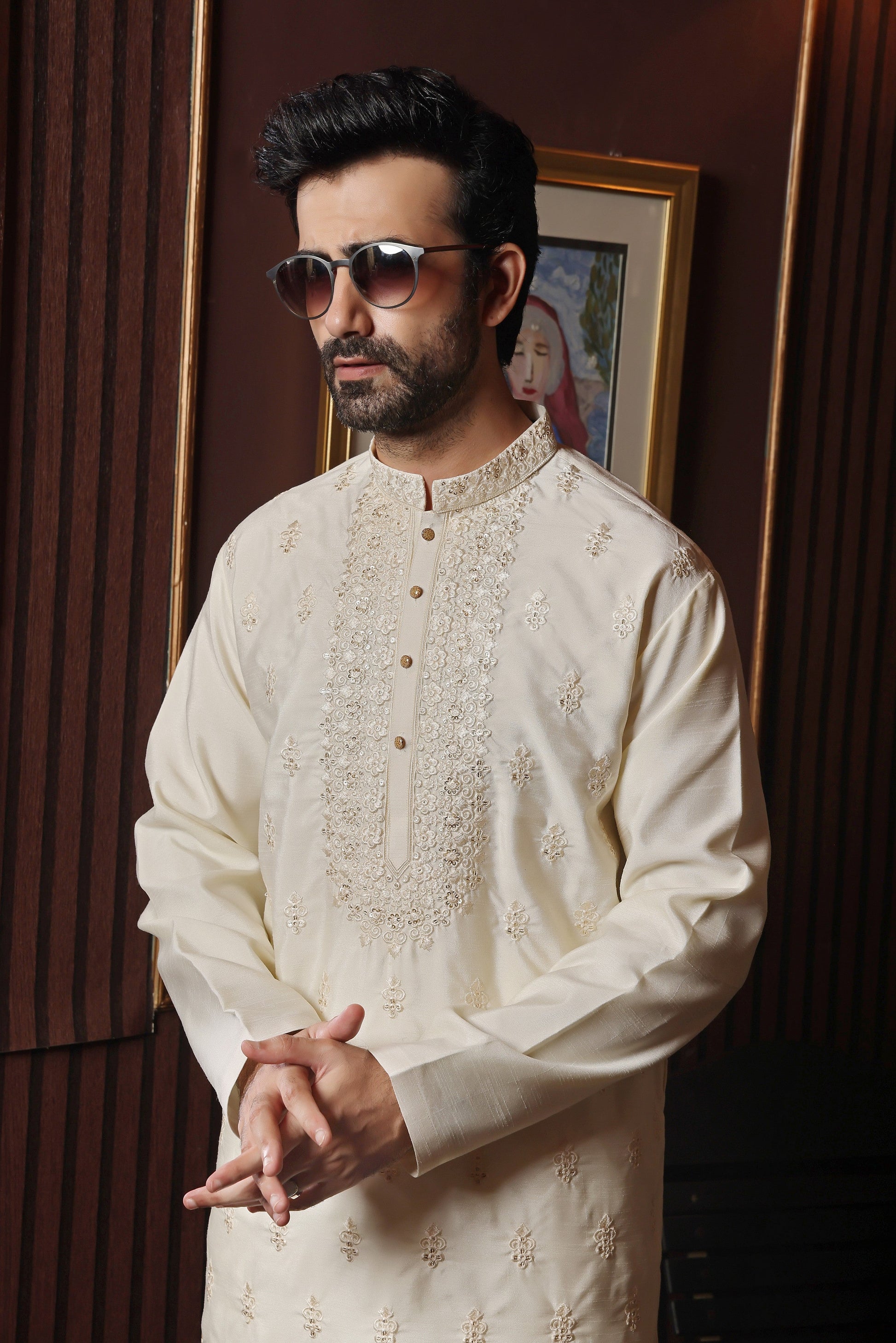 Men's Formal Raw Silk Kurta with Computer Embroidery along with Off White Pyjama