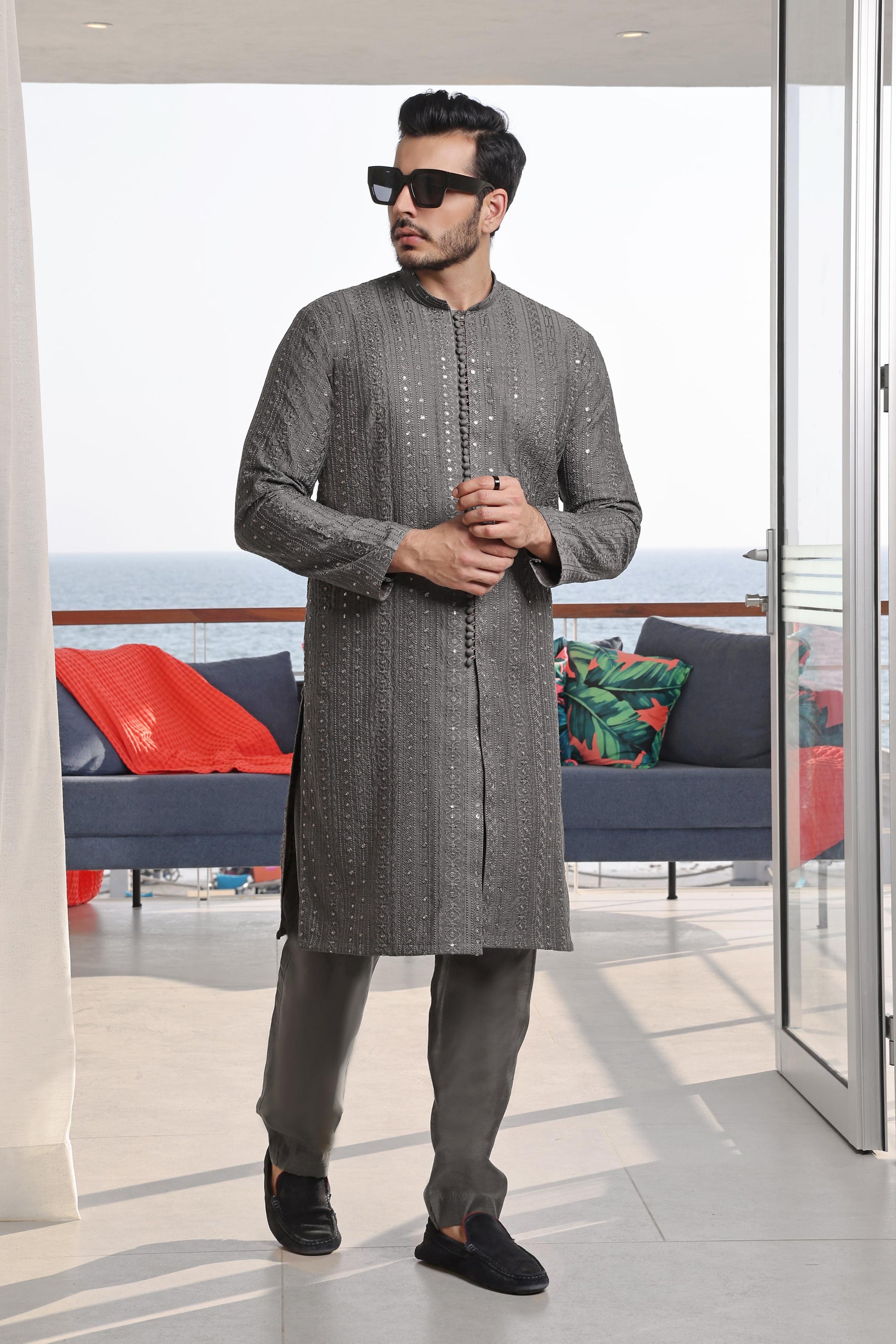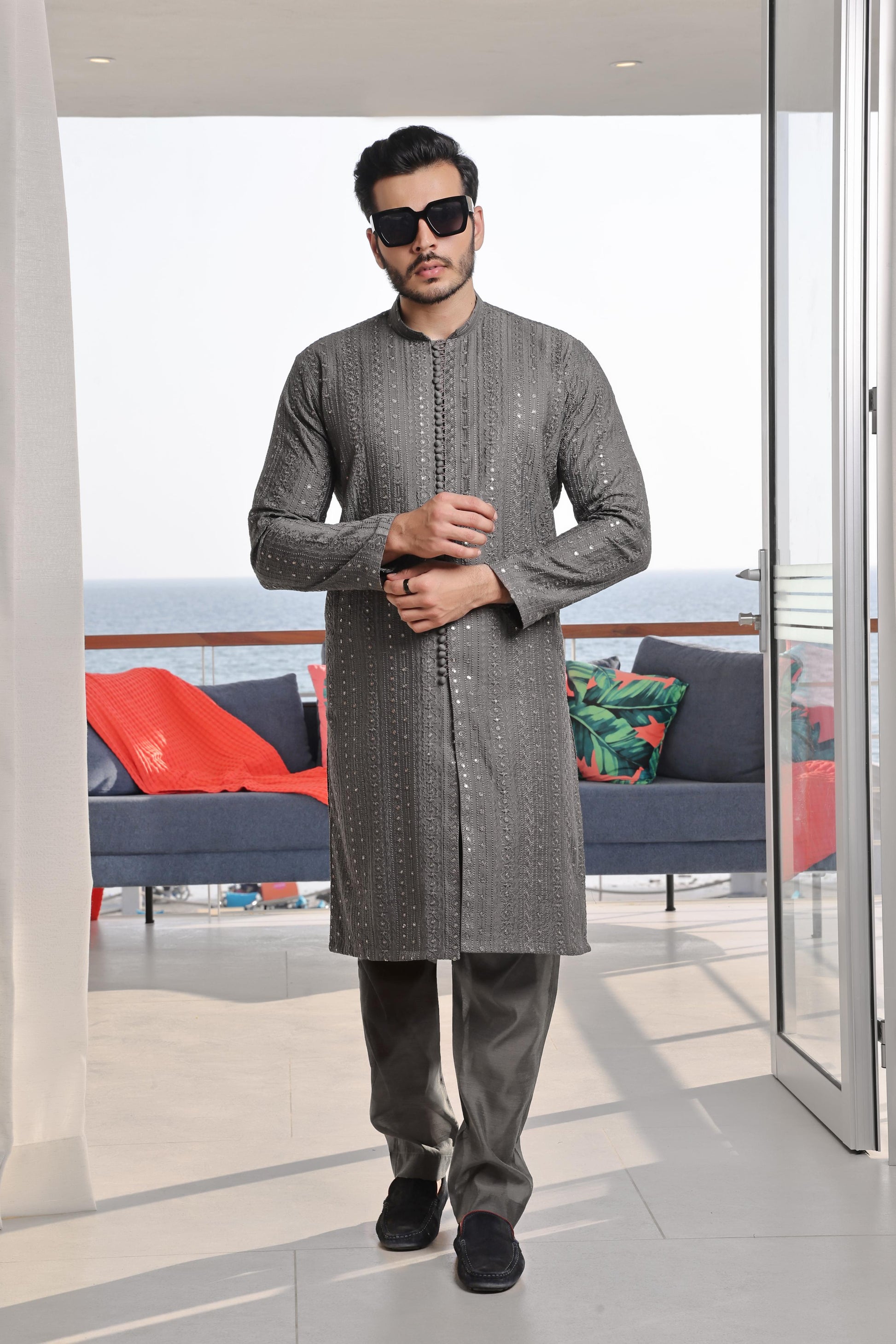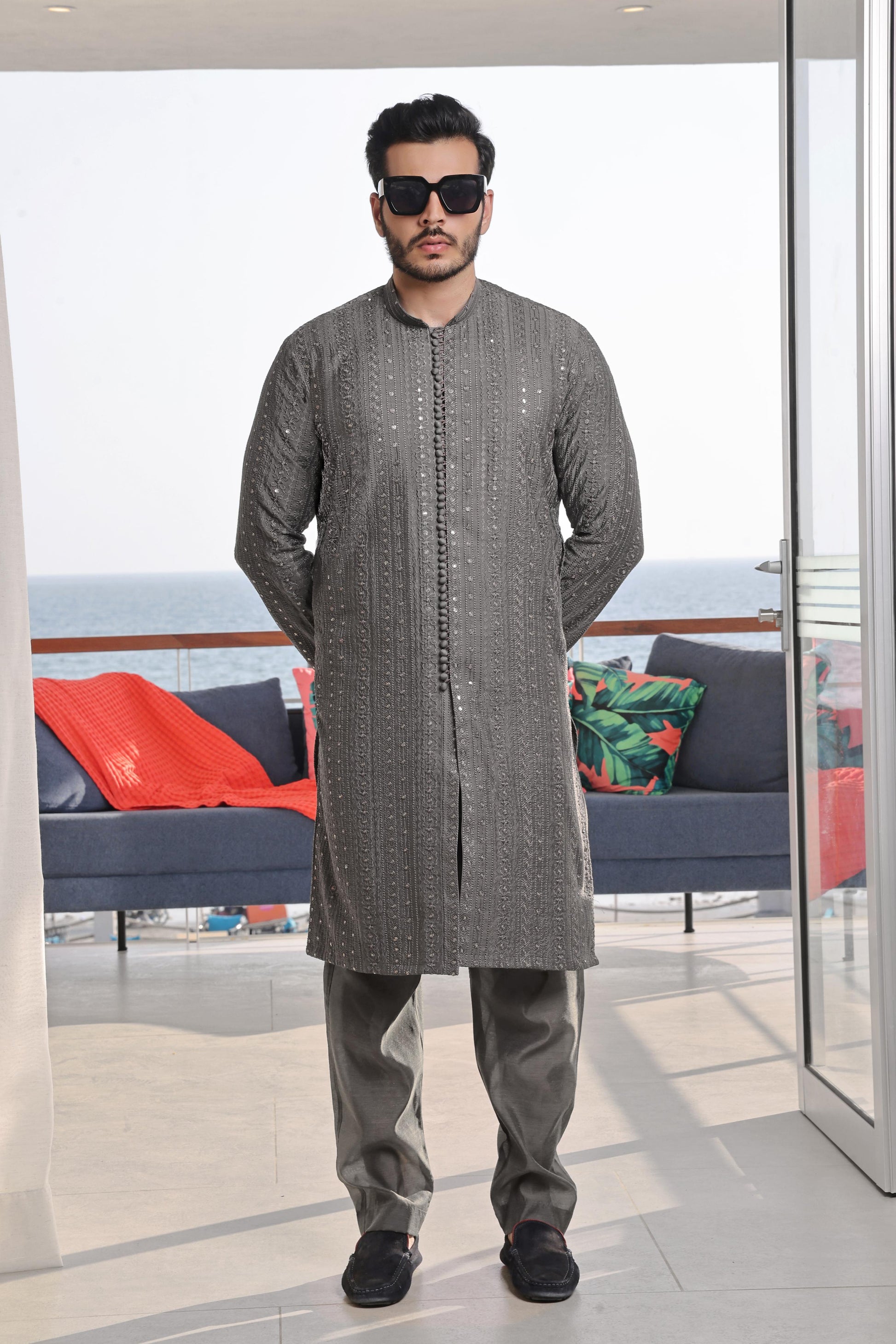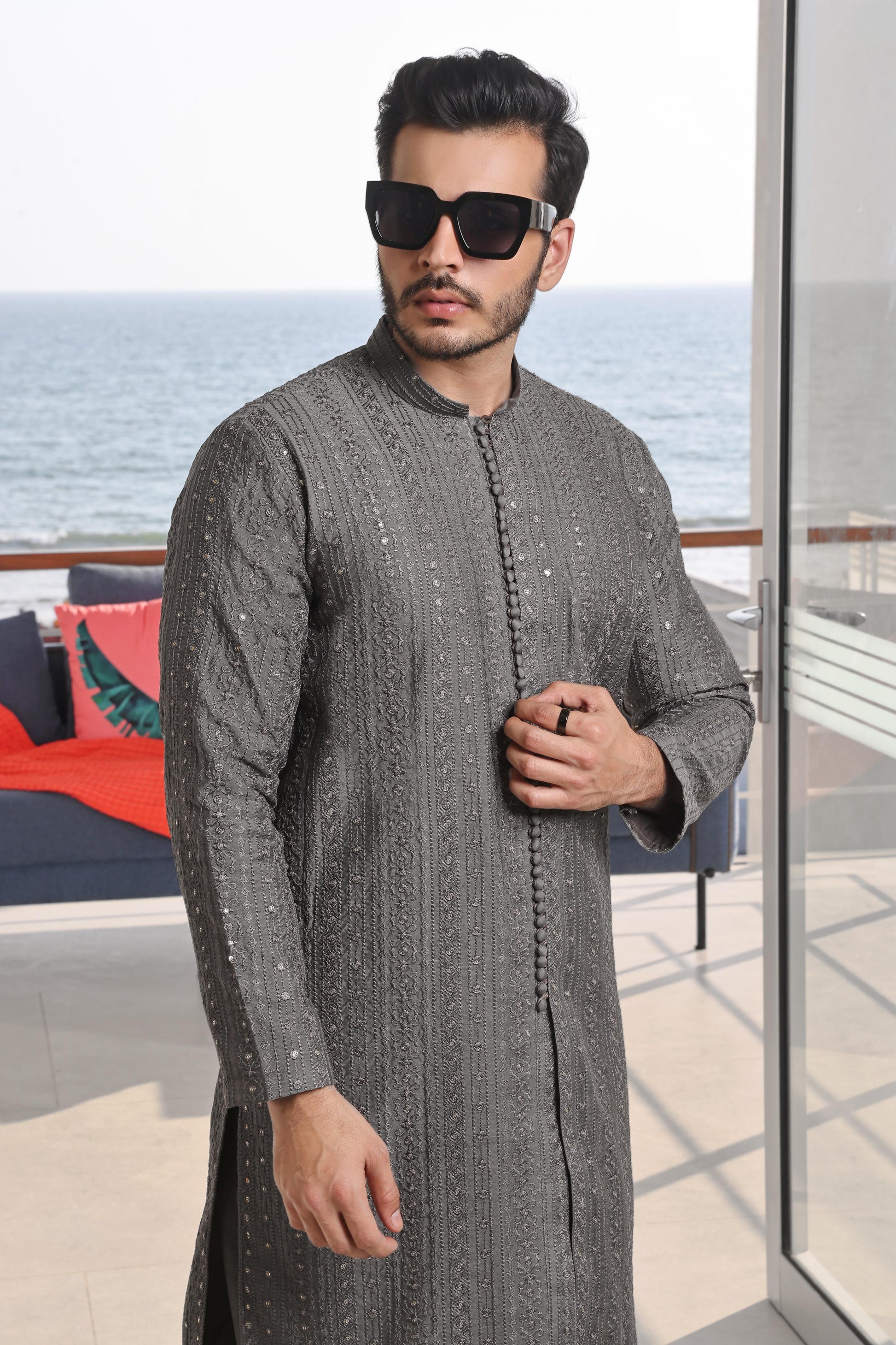 Men's Formal Embroidered Front Open Raw Silk Kurta Pyjama.