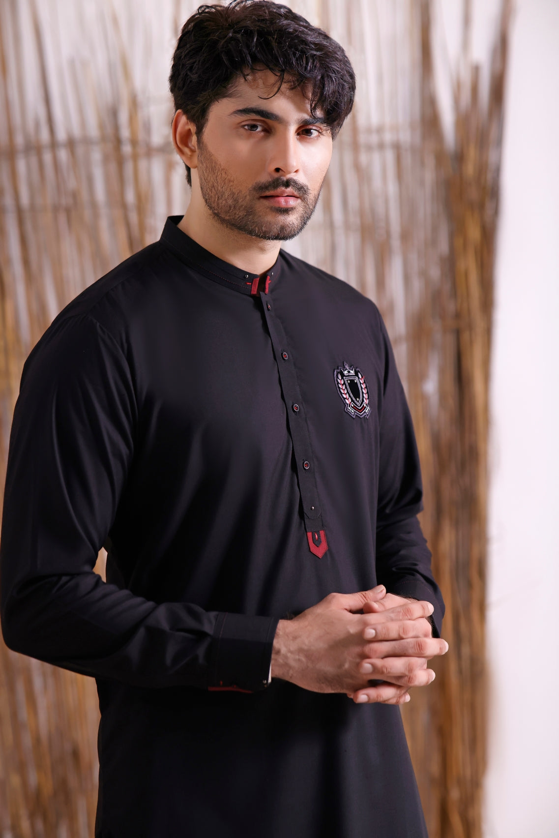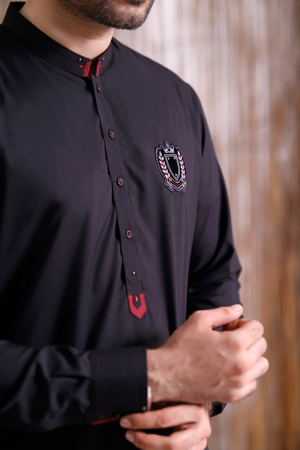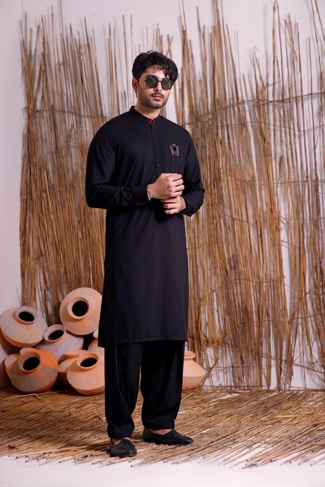 Men's Formal Kameez Shalwar with Embroidery on Collar, Planket and Front