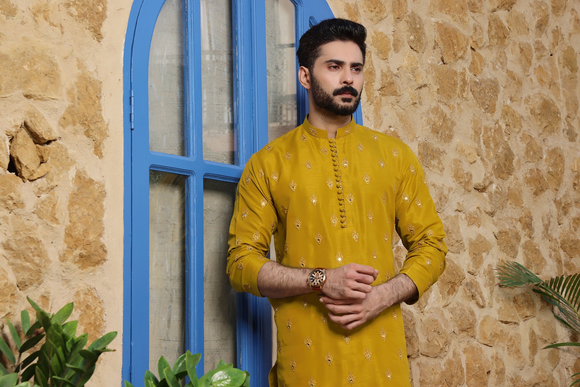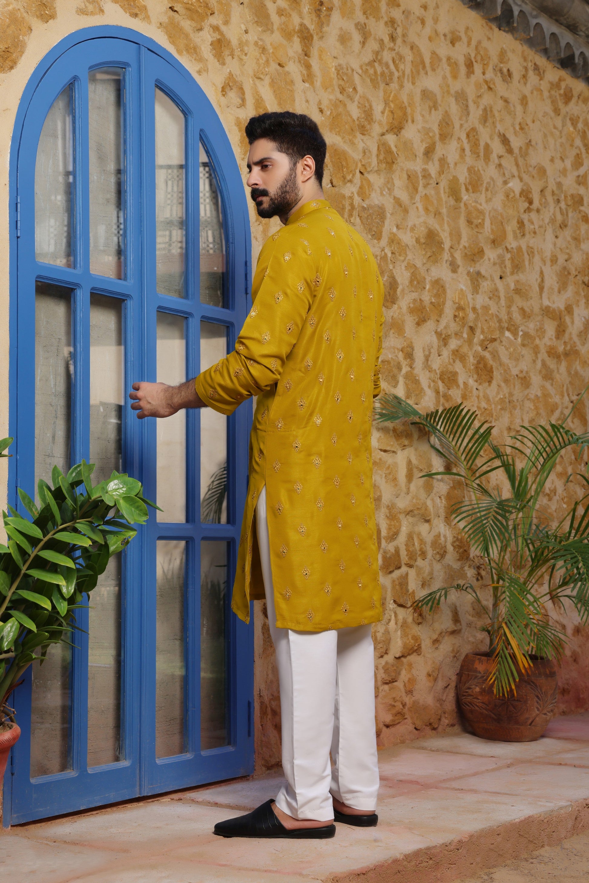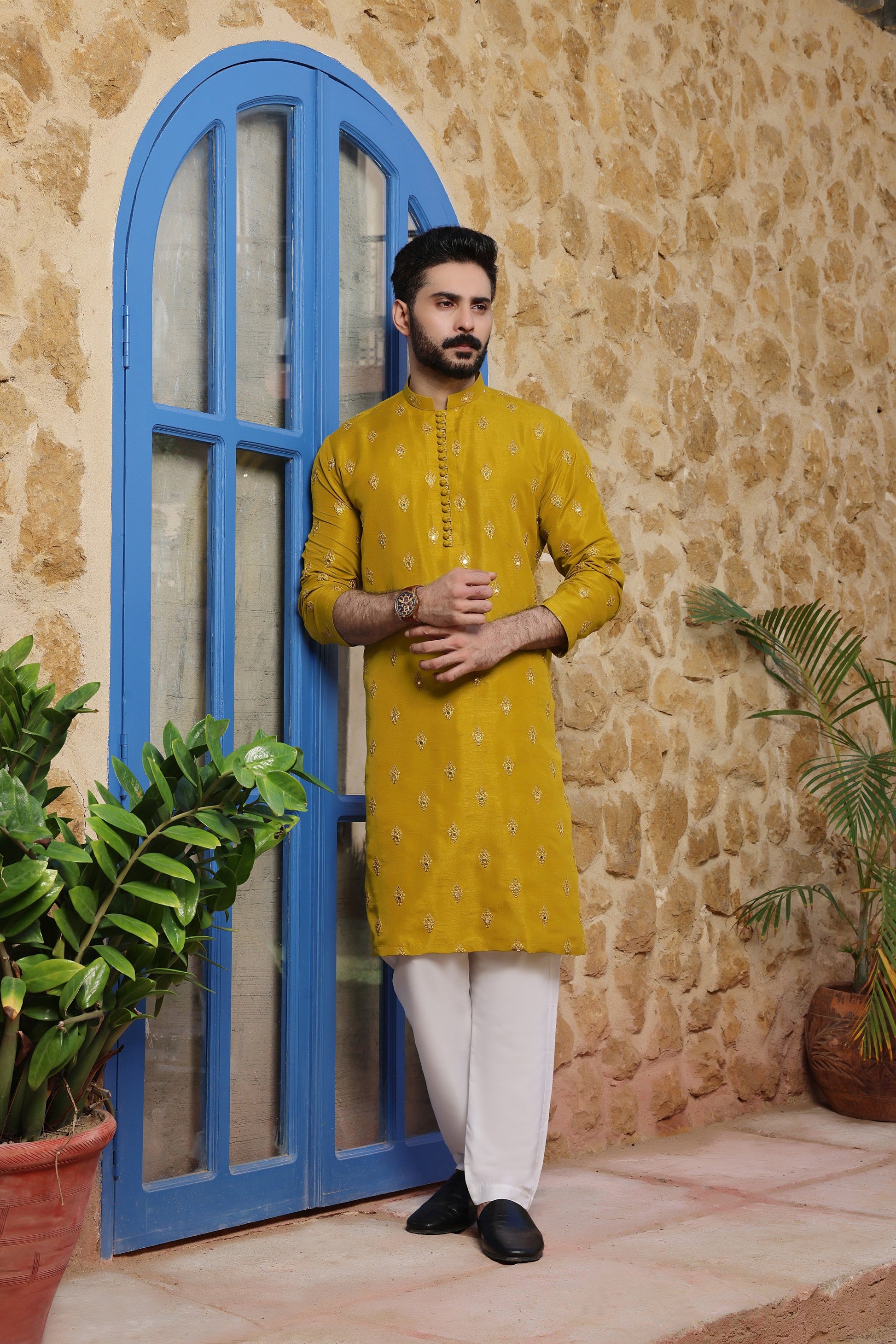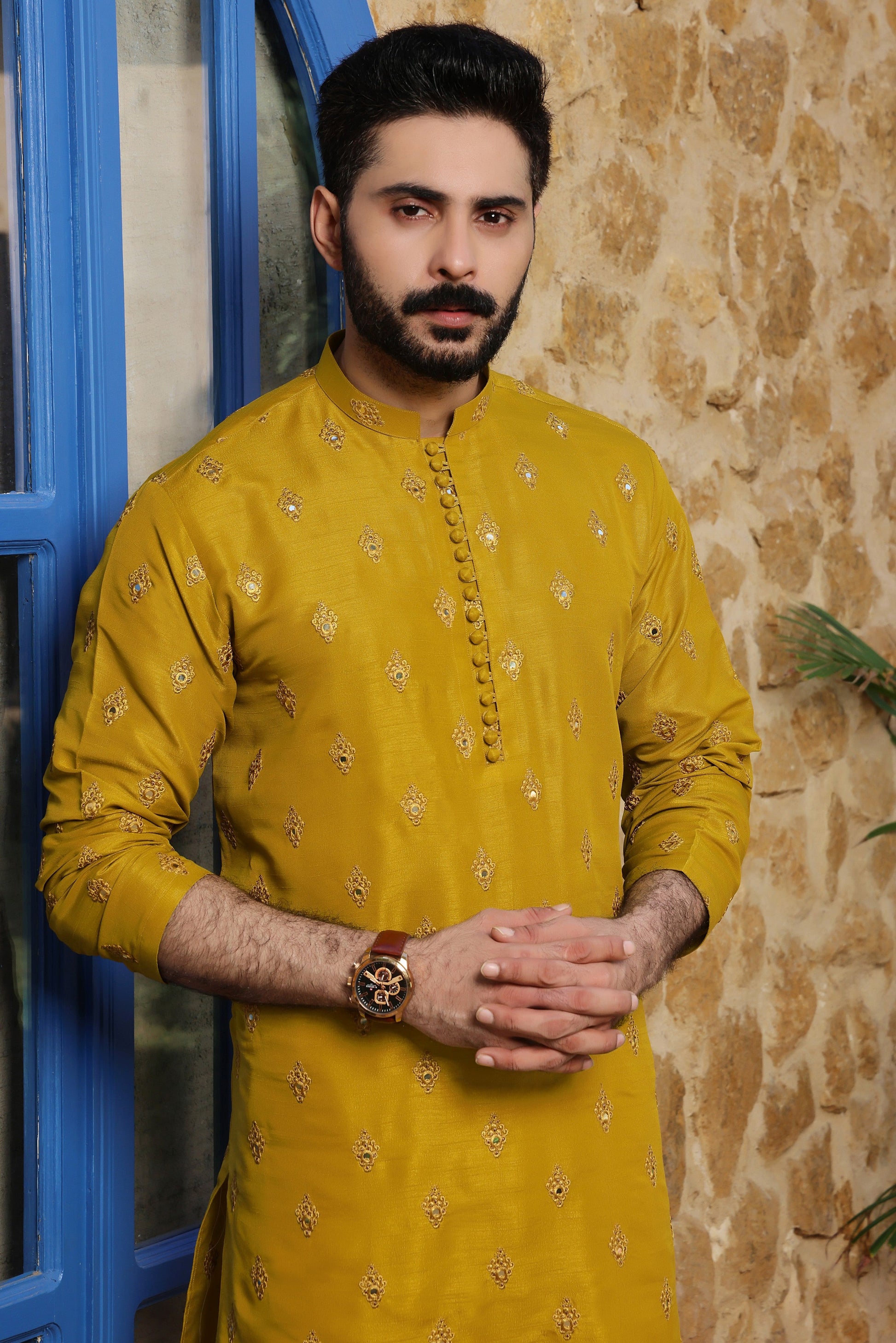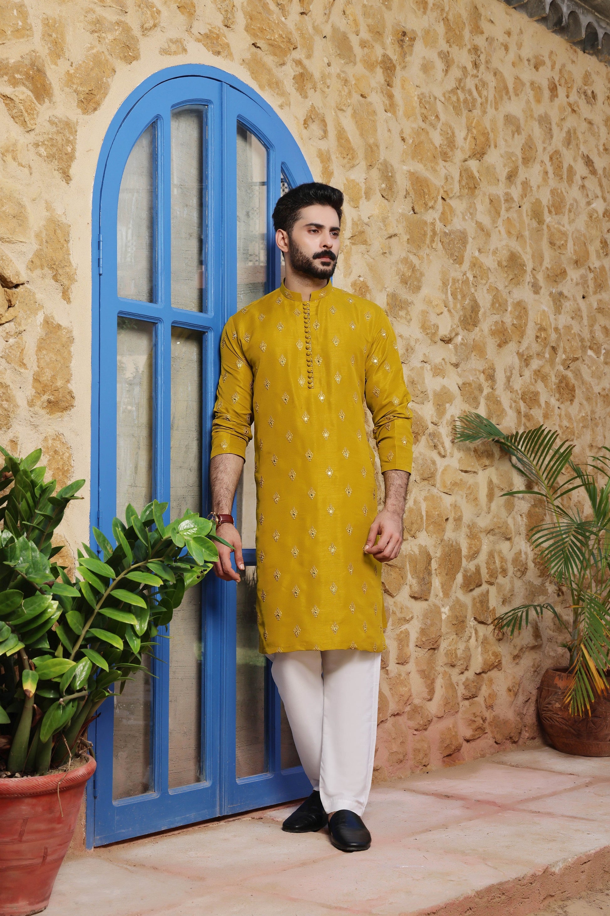 Men's Formal Kurta with Computer Embroidery along with Off White Pyjama