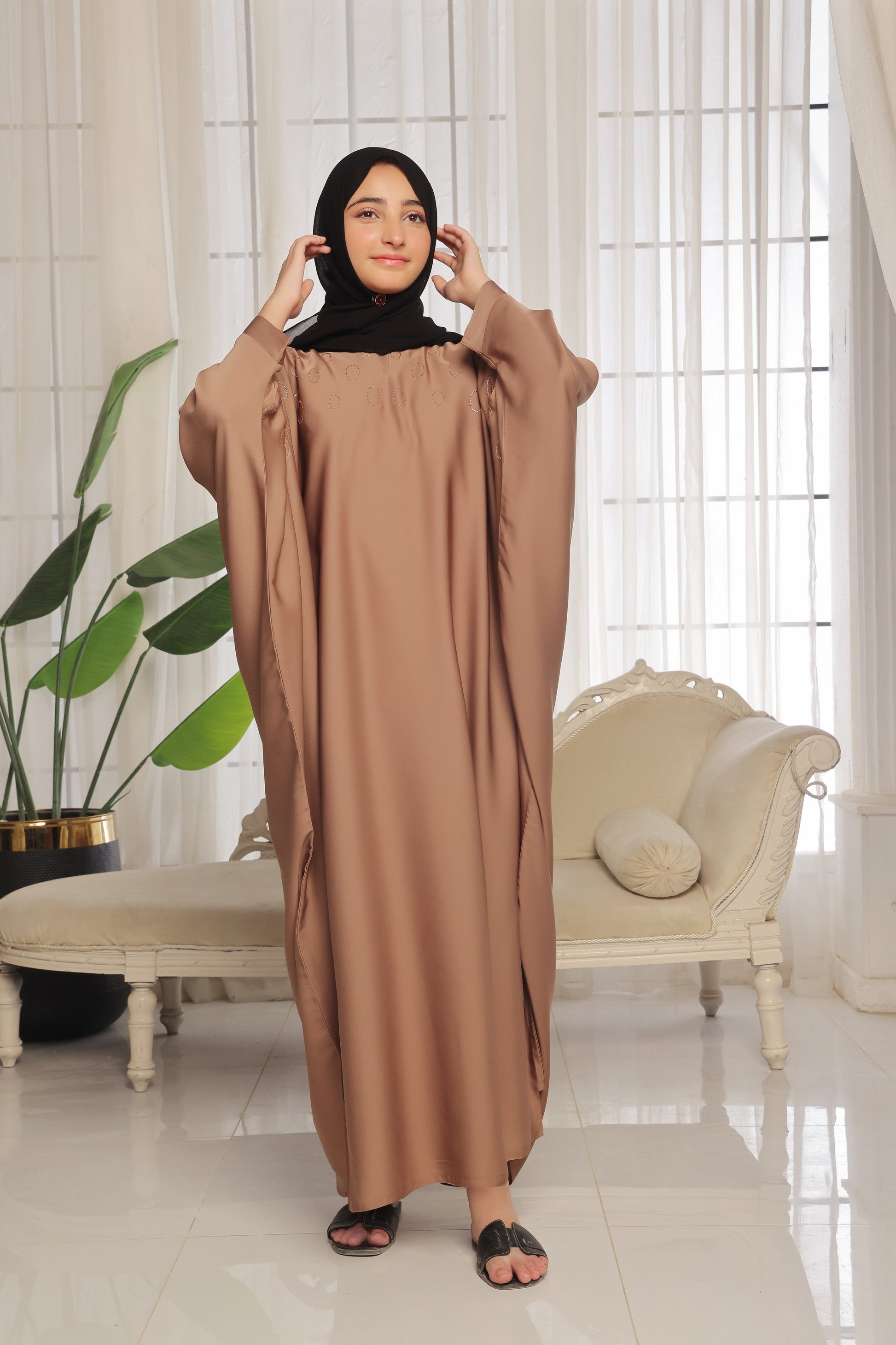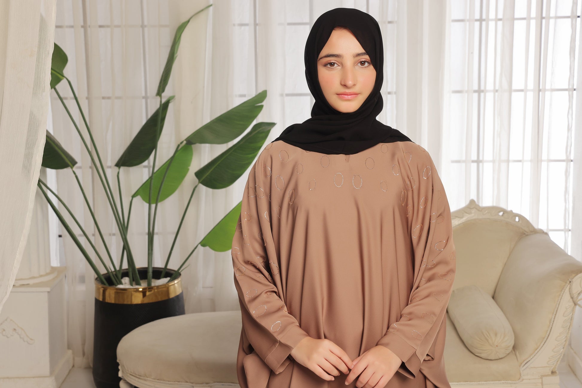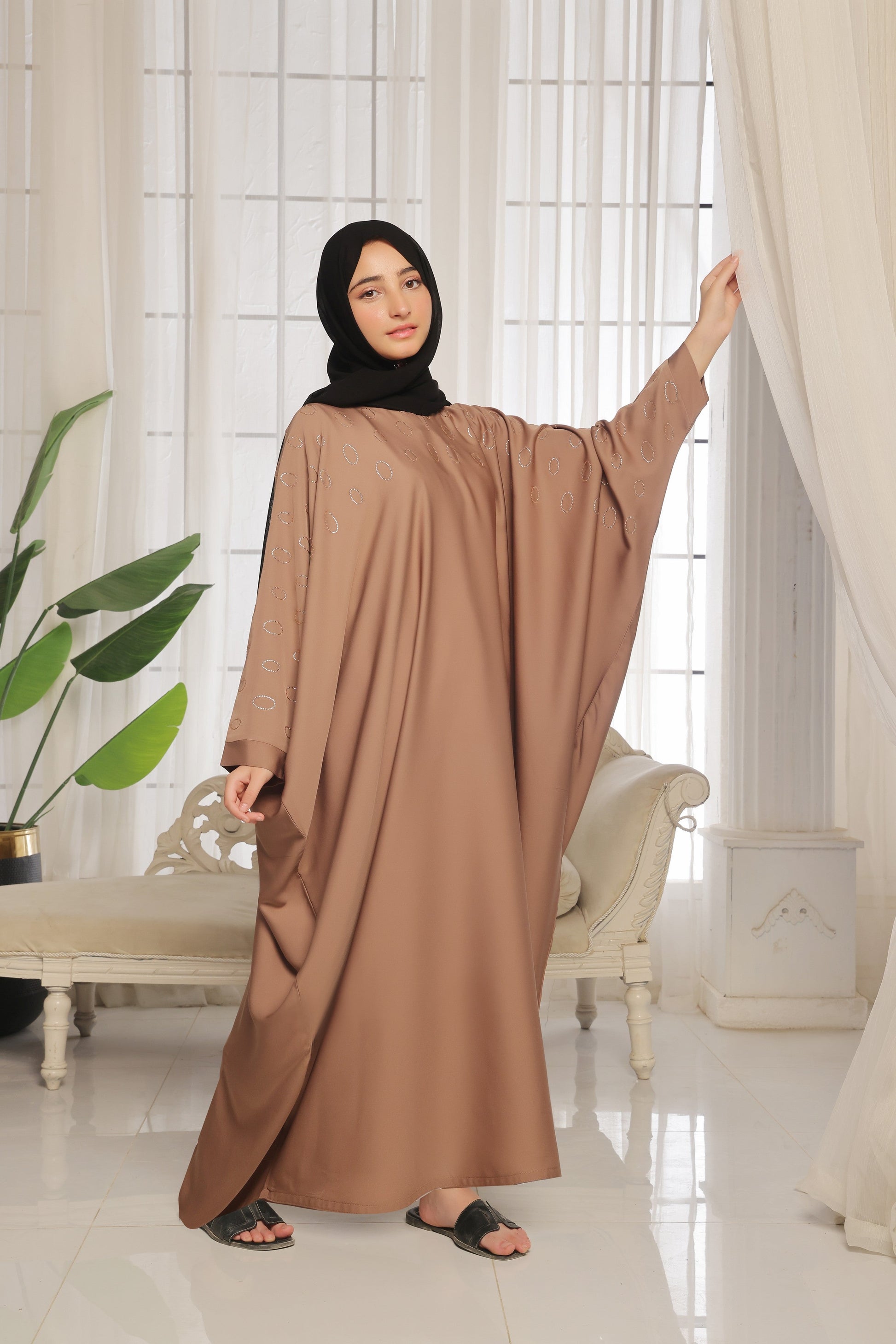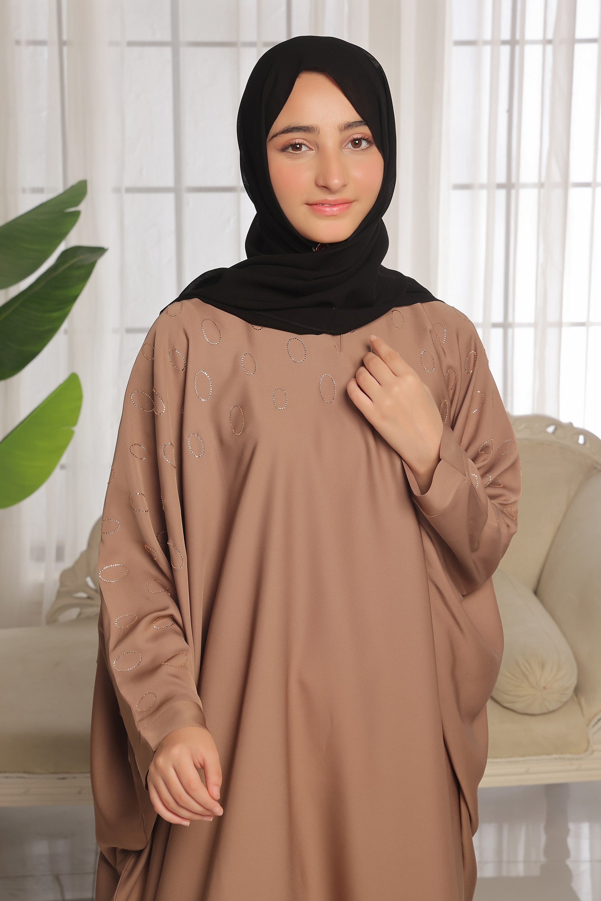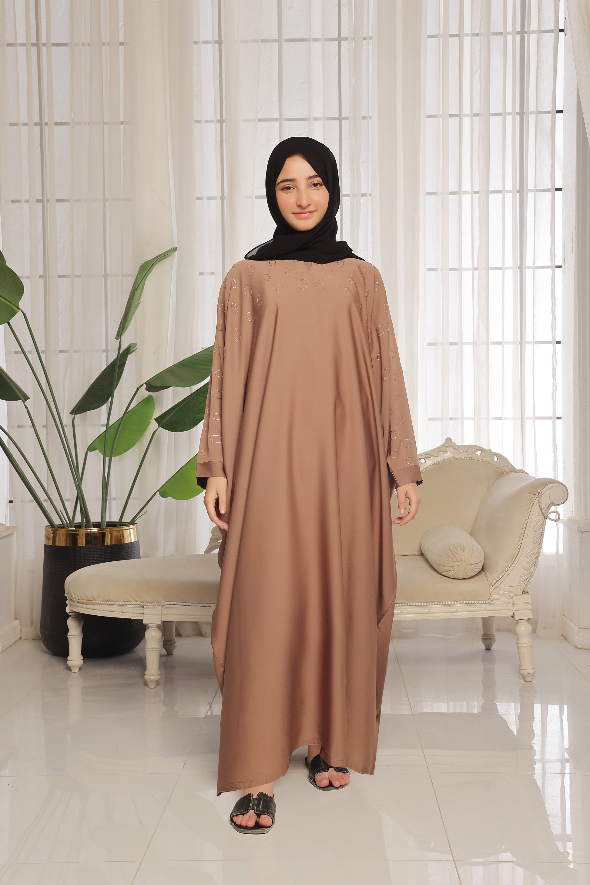 Totally outstanding our maxi style with stonework on shoulders makes it encapsulates ultimate class of fashion, butterfly style flowy look add more dreamy modest attire, constructed on pure Korean nidha fabric comes along with pure Korean chiffon Sheila which is black, embroidered and easy to go with every abaya aswell