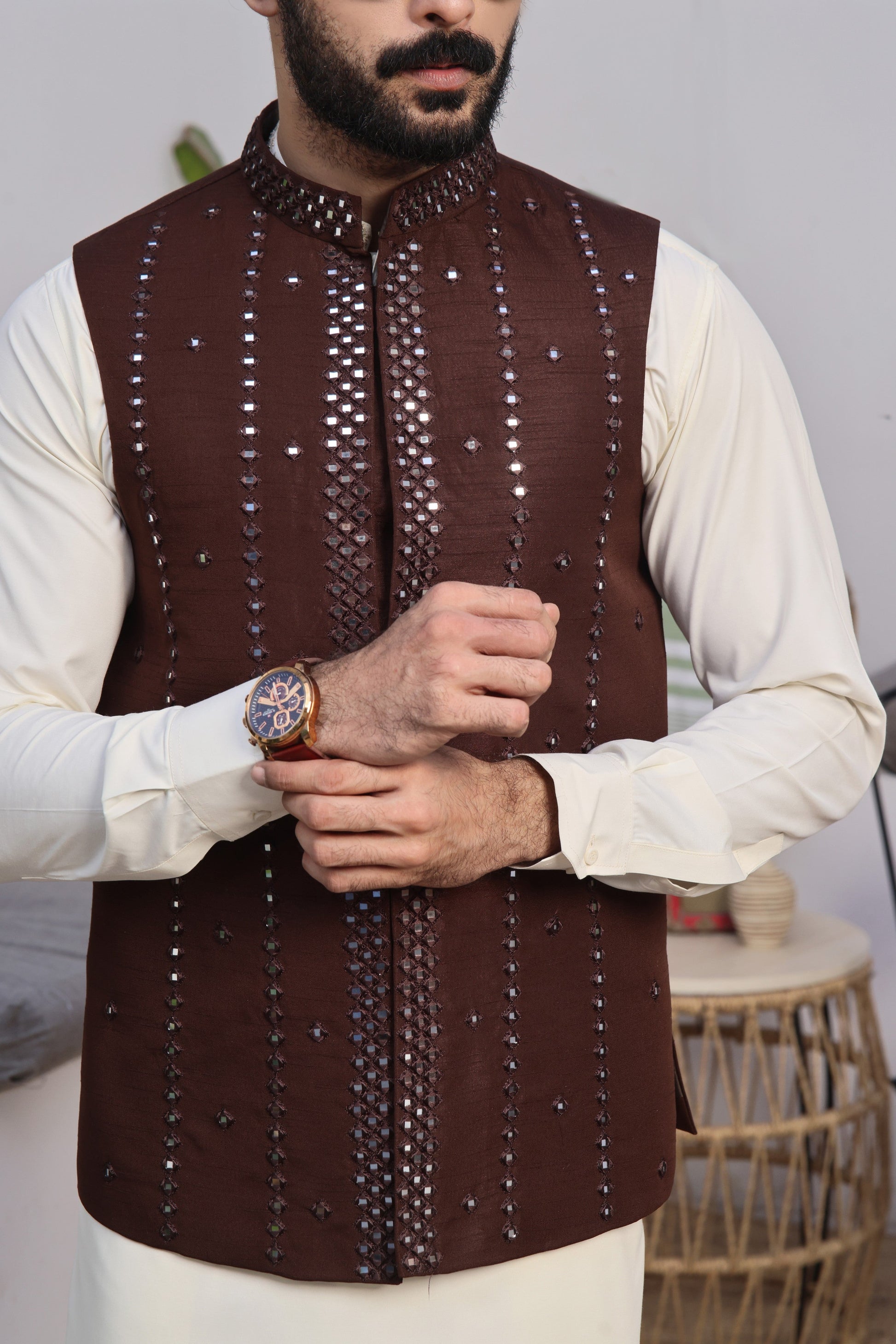 Men's Formal Raw Silk Waistcoat with Sequence Mirror Work