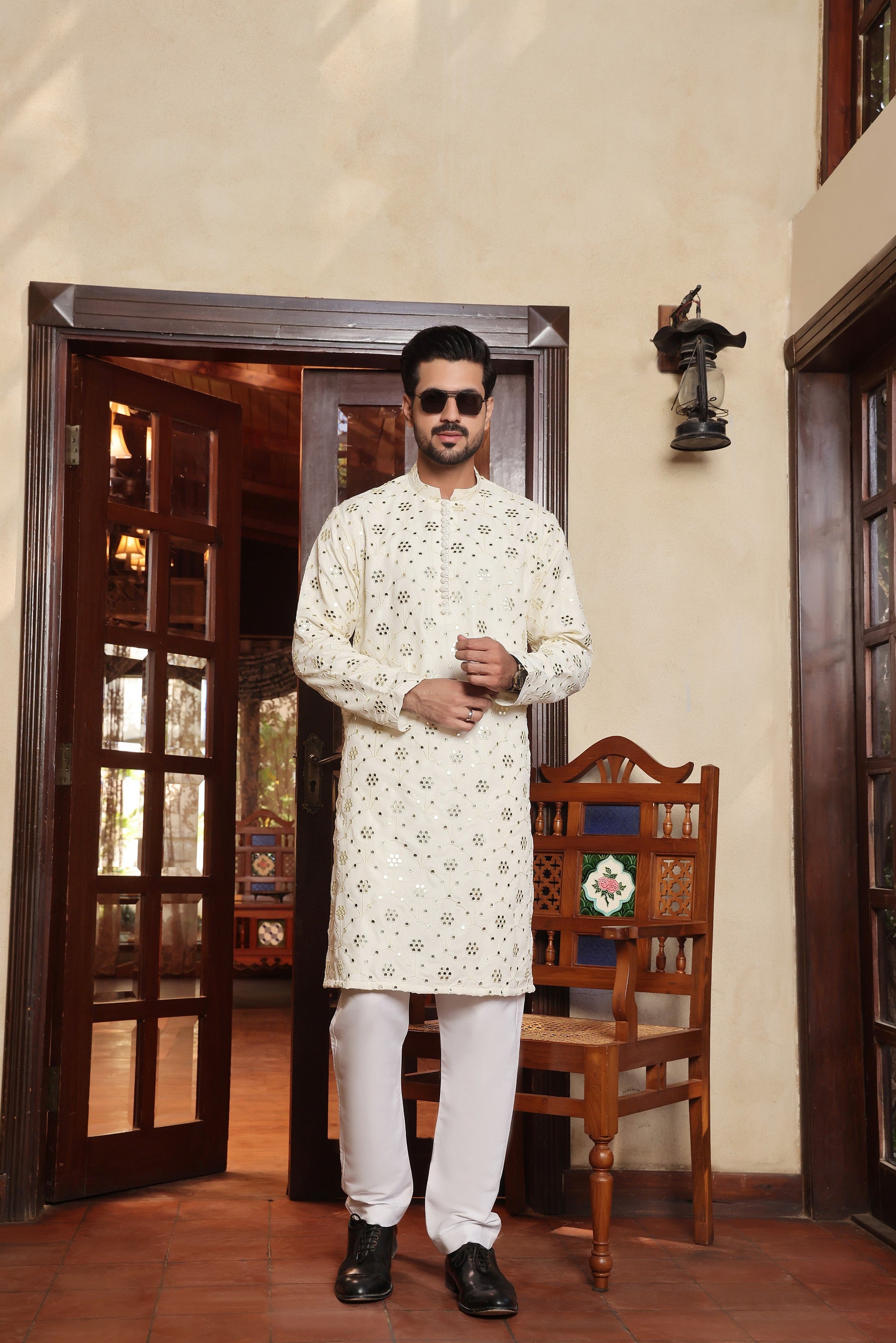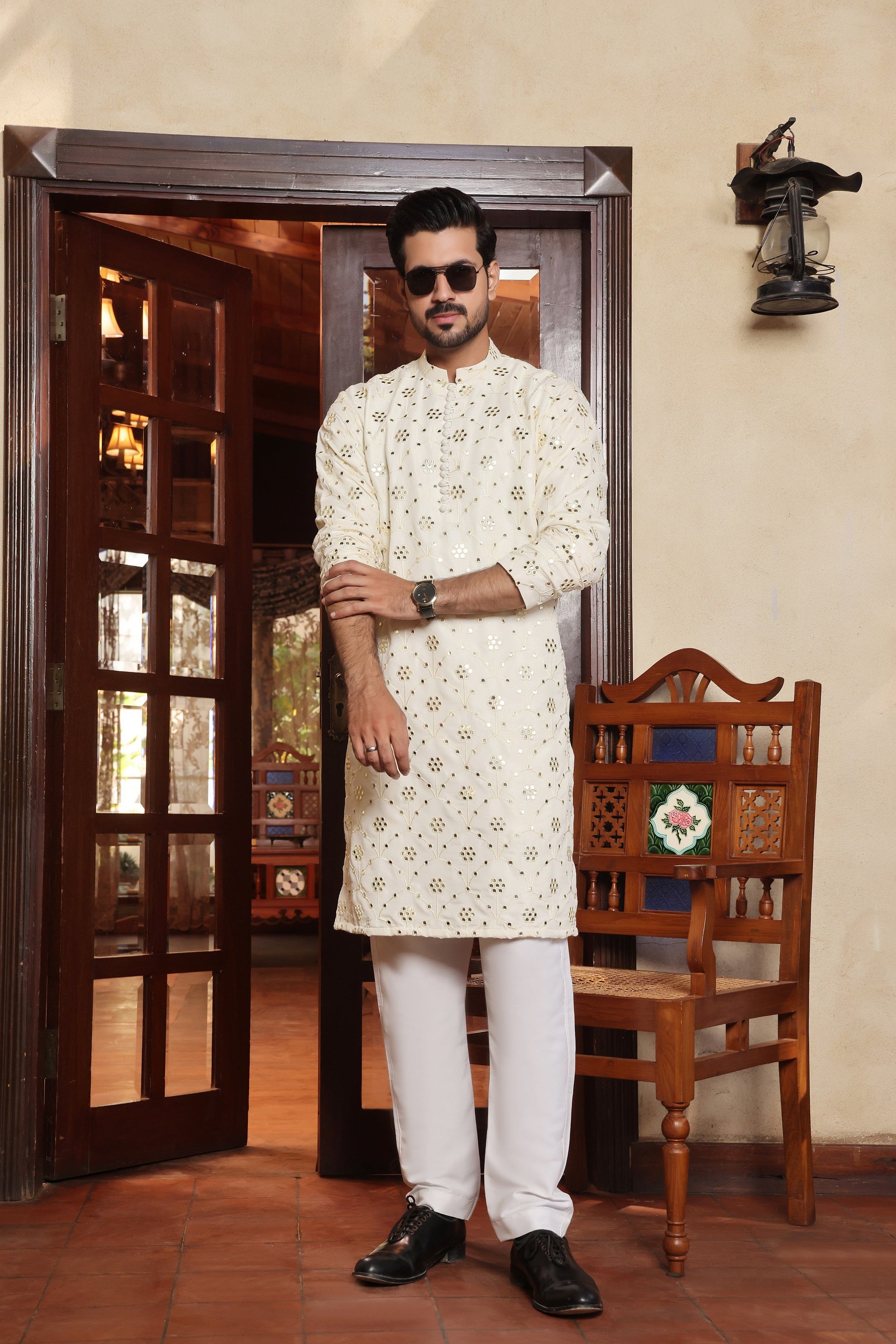 Men's Formal Raw Silk Kurta with Computer Embroidery along with Sequence and Mirror Work