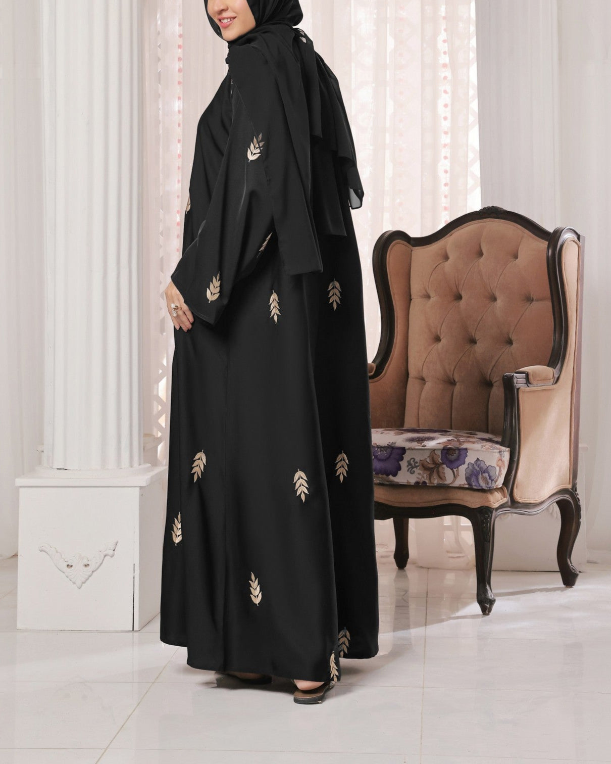 🖤 Elegant Maxi Abaya with Delicate Leaf Embroidery: A beautifully designed abaya featuring soft leaf motifs scattered gracefully across the fabric, creating a subtle yet striking visual appeal.